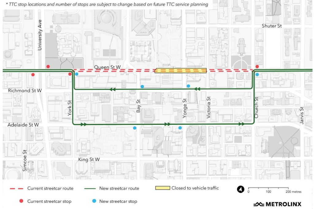 The construction at Queen and Yonge will allow what Metrolinx calls a “long deferred TTC priority” to improve diversion routes available downtown. York Street, now two-way only south to Richmond, will become two-way to Adelaide, and track will be reinstated on Adelaide eastward (it is now operational only between Victoria and Church).