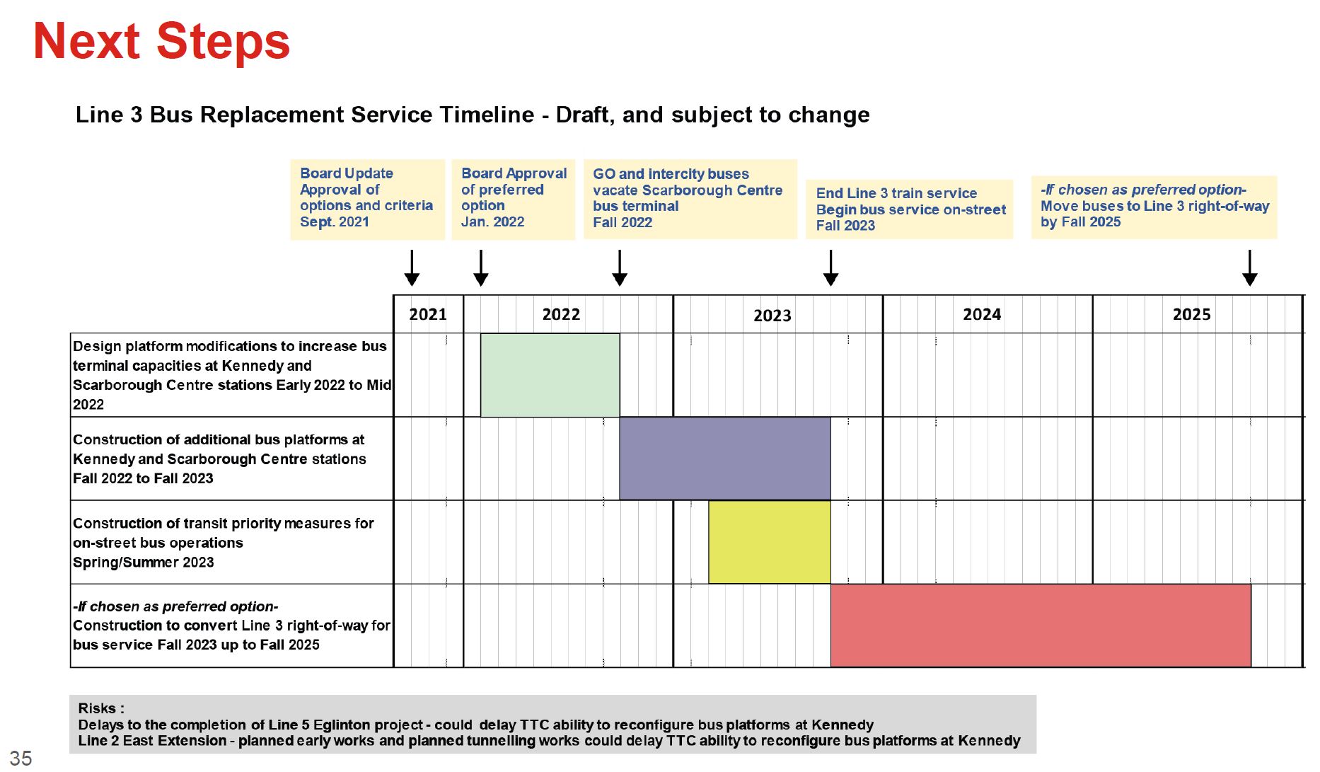 In January 2022, staff will take their recommendation to the TTC Board. There are three options still on the table, but option 1 will be recommended to the Board. Still at issue is the question of which of option(s) would be used for the interim period between the SRT shutdown and conversion of the right-of-way for BRT operation.