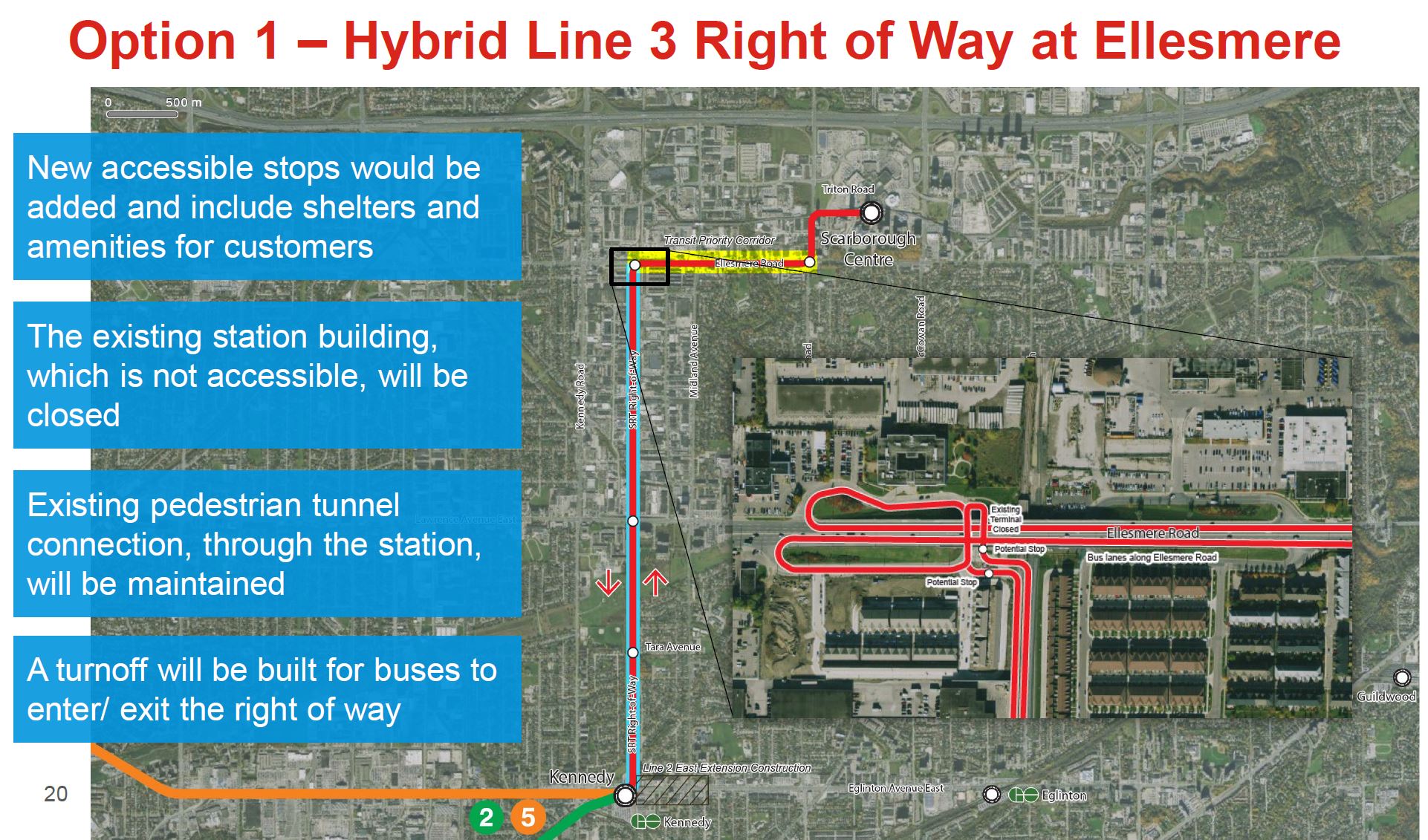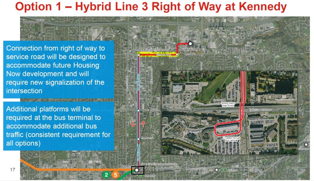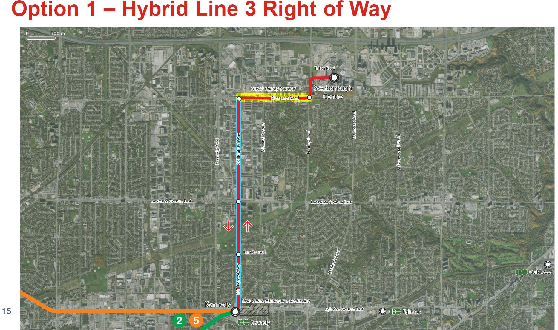 1. A hybrid option running on street from STC (Scarborough Town Centre) to Ellesmere Station and then south on a new BRT corridor in a repurposed SRT right-of-way to Kennedy Station. (Recommended)