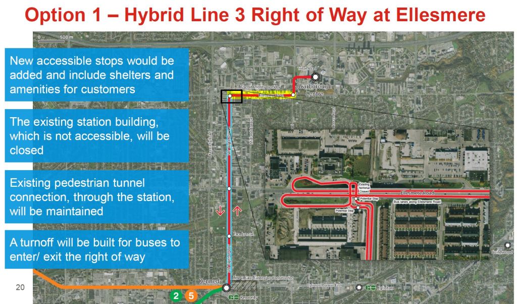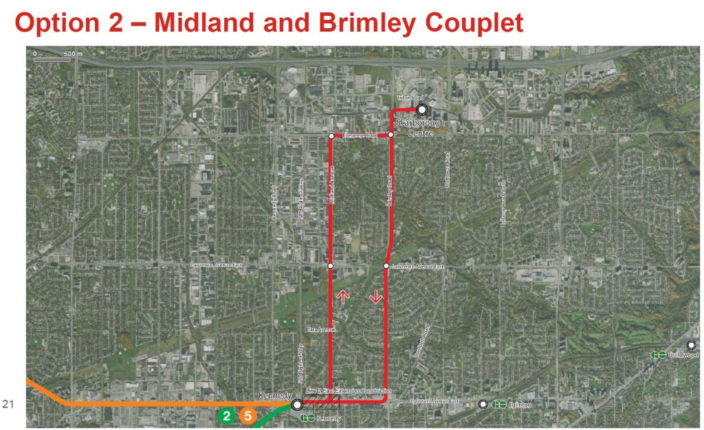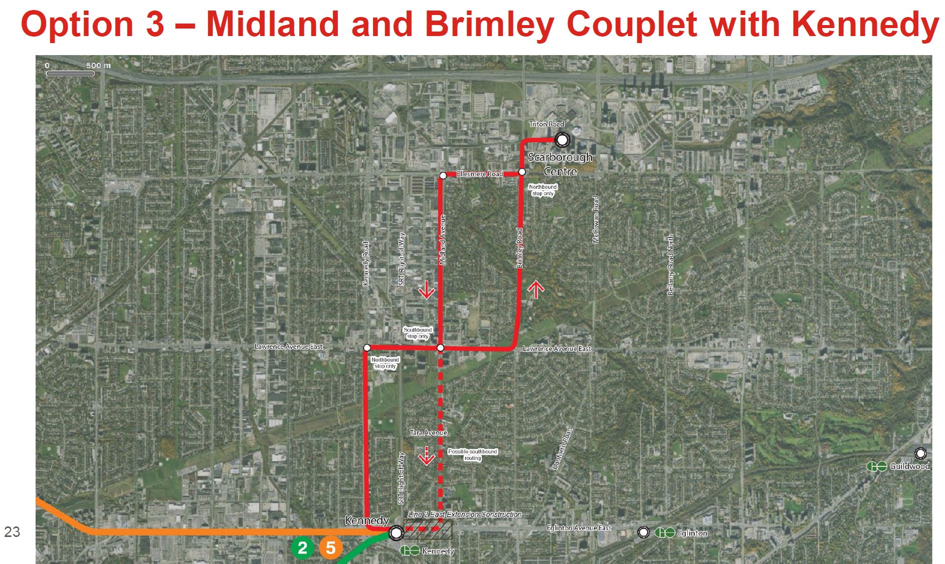 2. On street operation from STC to Kennedy Station using Brimley and Midland as a one-way pair with buses running southbound on one and northbound on the other.