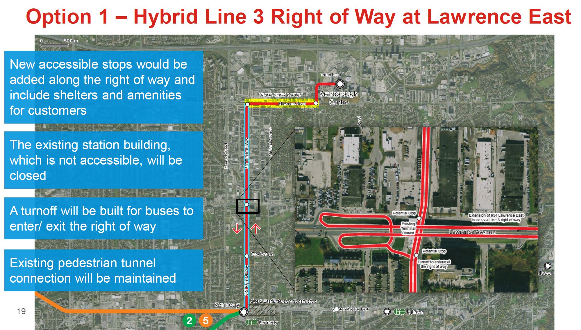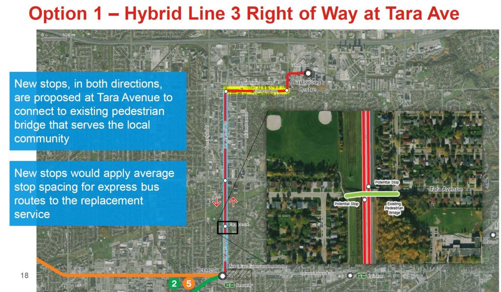 • A new stop at Tara Avenue (the pedestrian bridge between Kennedy and Lawrence East Stations).