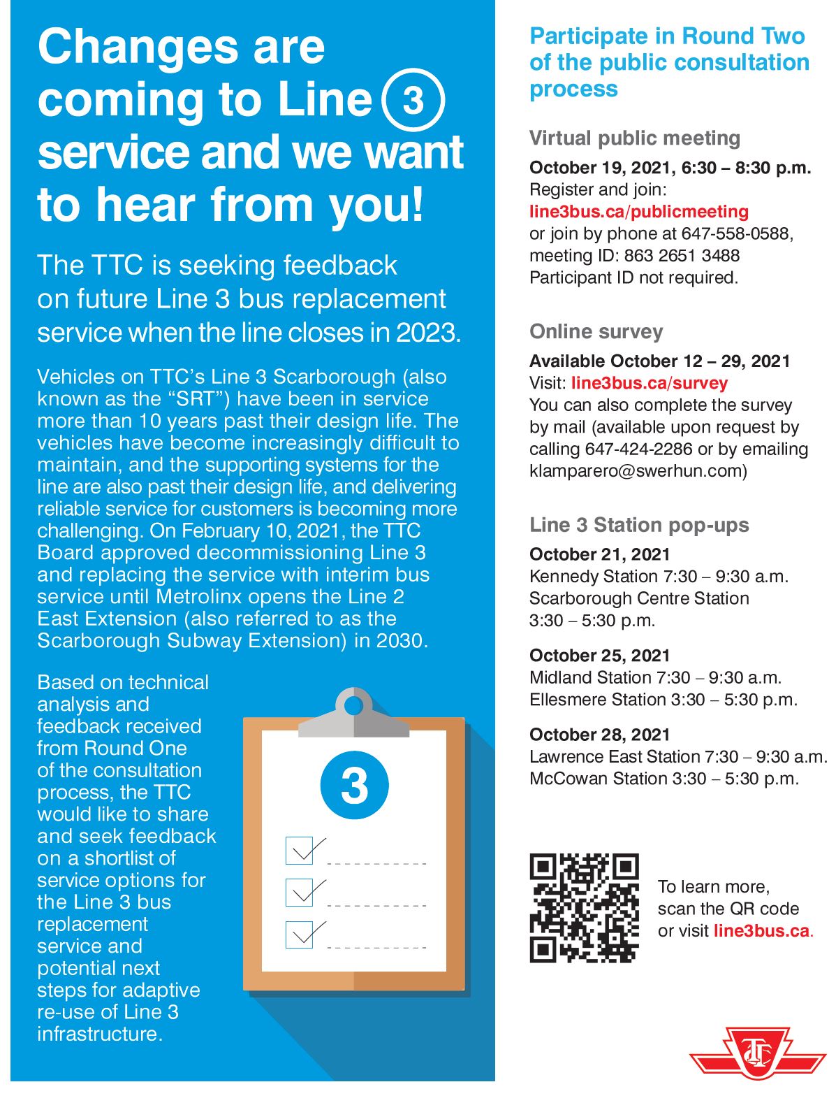 The TTC has launched a rider survey to obtain feedback from staff recommendations about the alternatives to Line 3 SRT service when it shuts down in Fall 2023. The survey is open to October 29, 2021. For those who cannot access the survey online, a hard copy is available by mail on request.