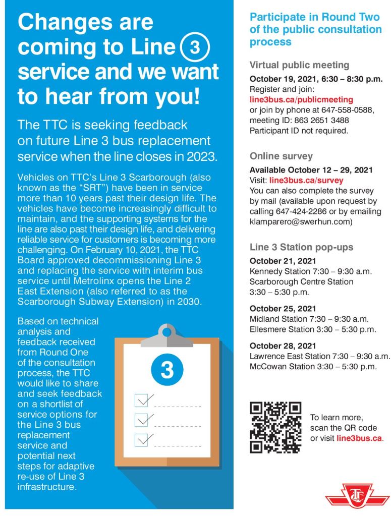 Updated October 27, 2021 at 12:15pm: The link to the TTC’s Line 3 Replacement page has been updated to point to their new website.