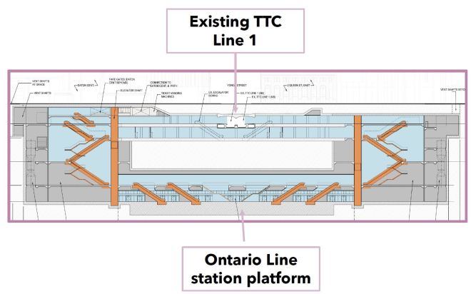 Metrolinx claims that transfer times between the two stations are actually shorter for the Ontario Line than the Relief Line, but this is hard to believe considering that OL riders must walk east or west at the concourse level just to reach an escalator upward from what would have been platform level on the Relief Line.