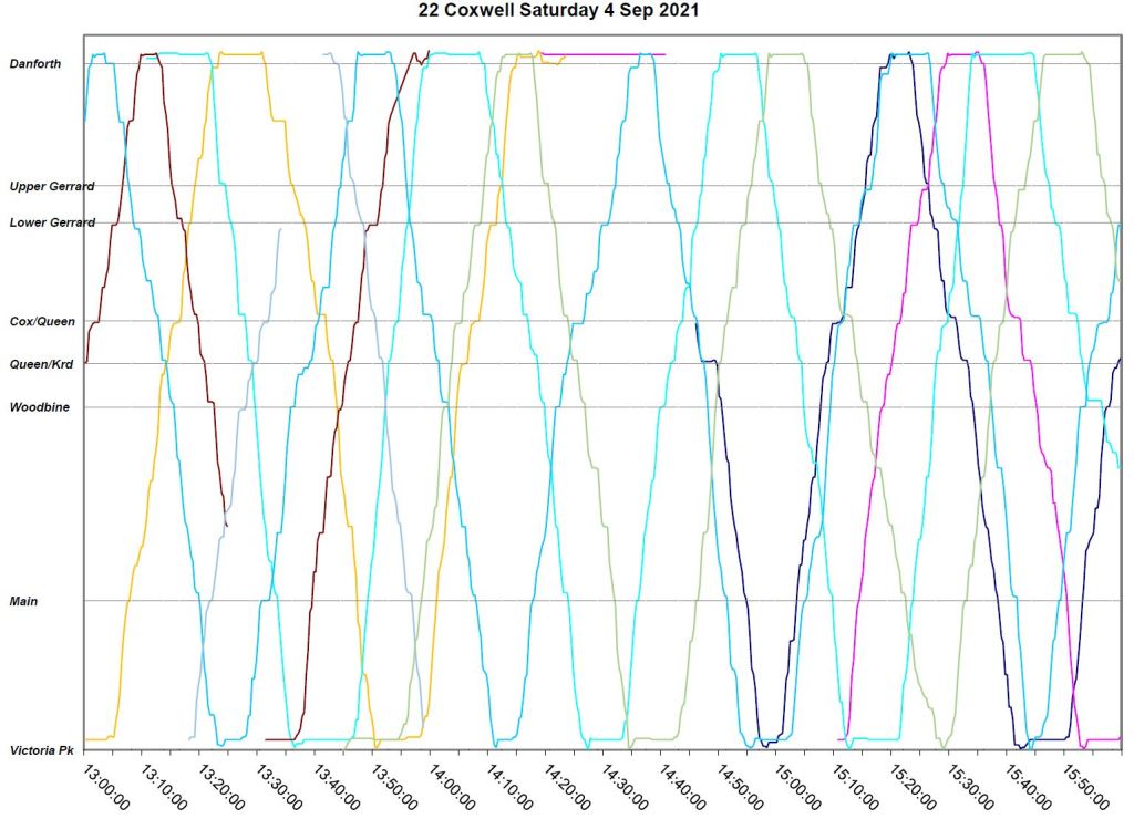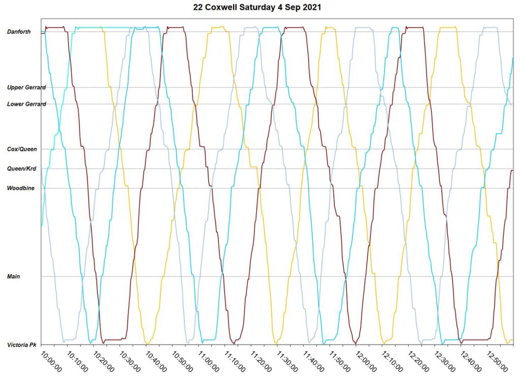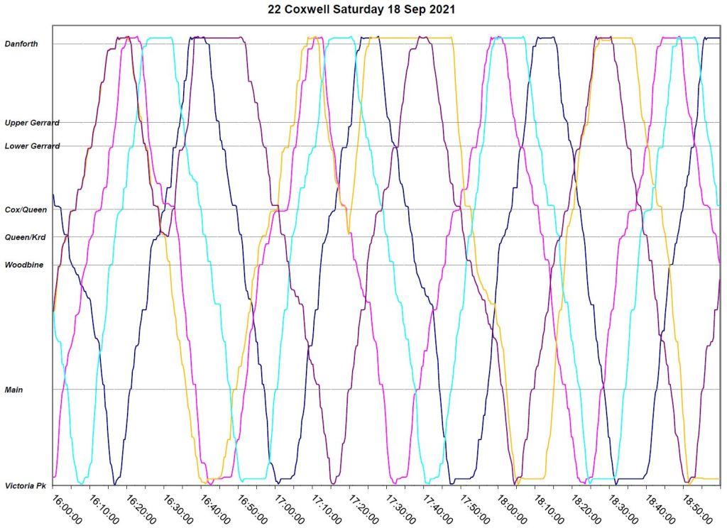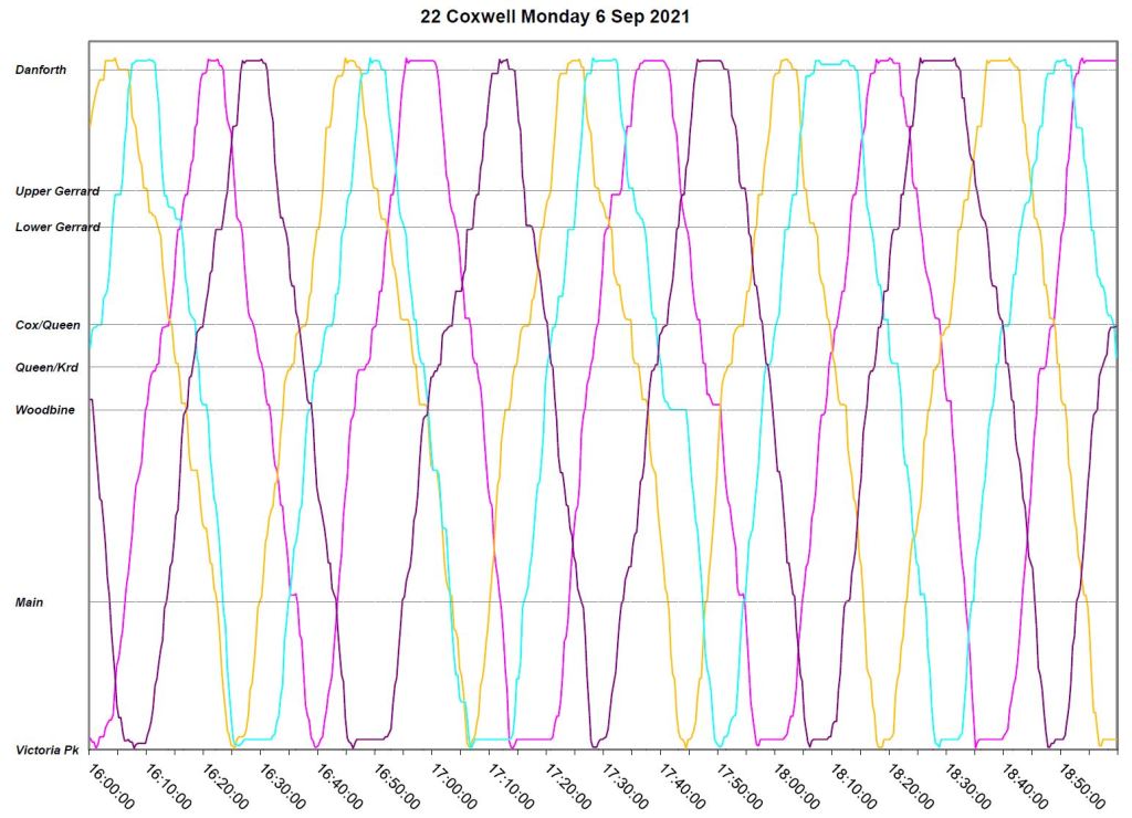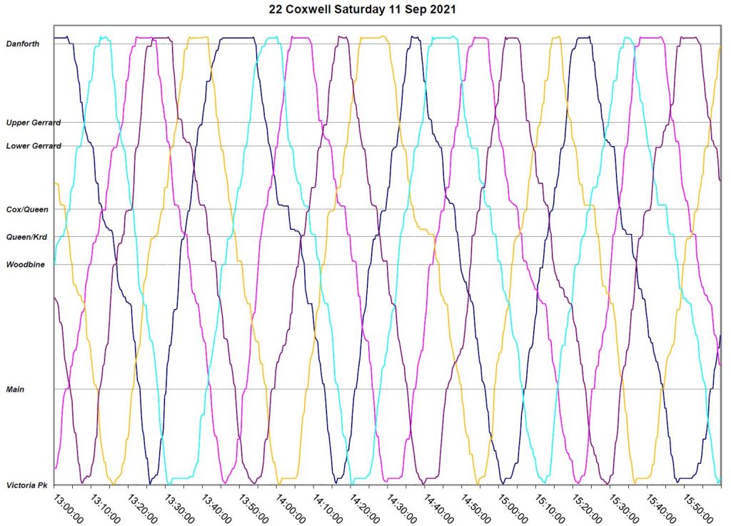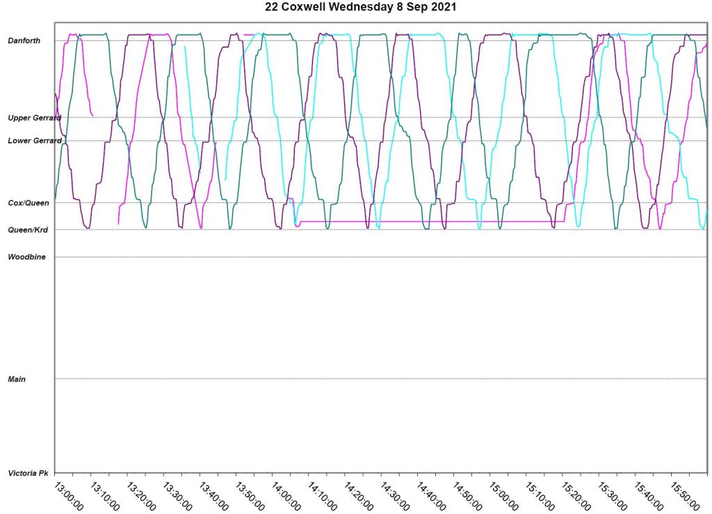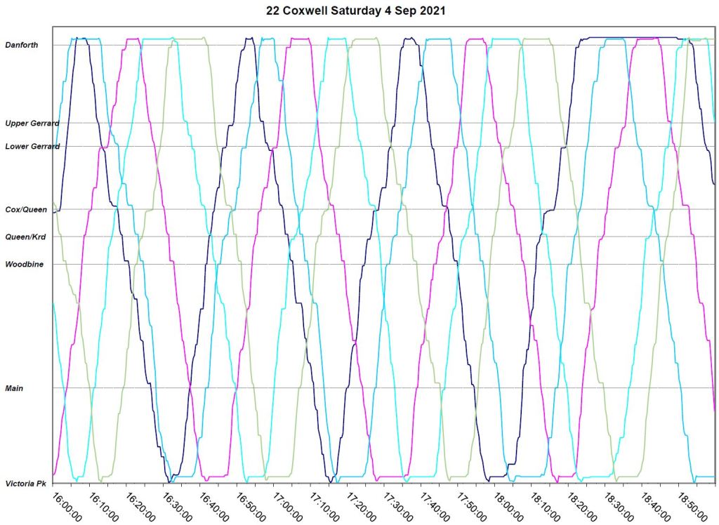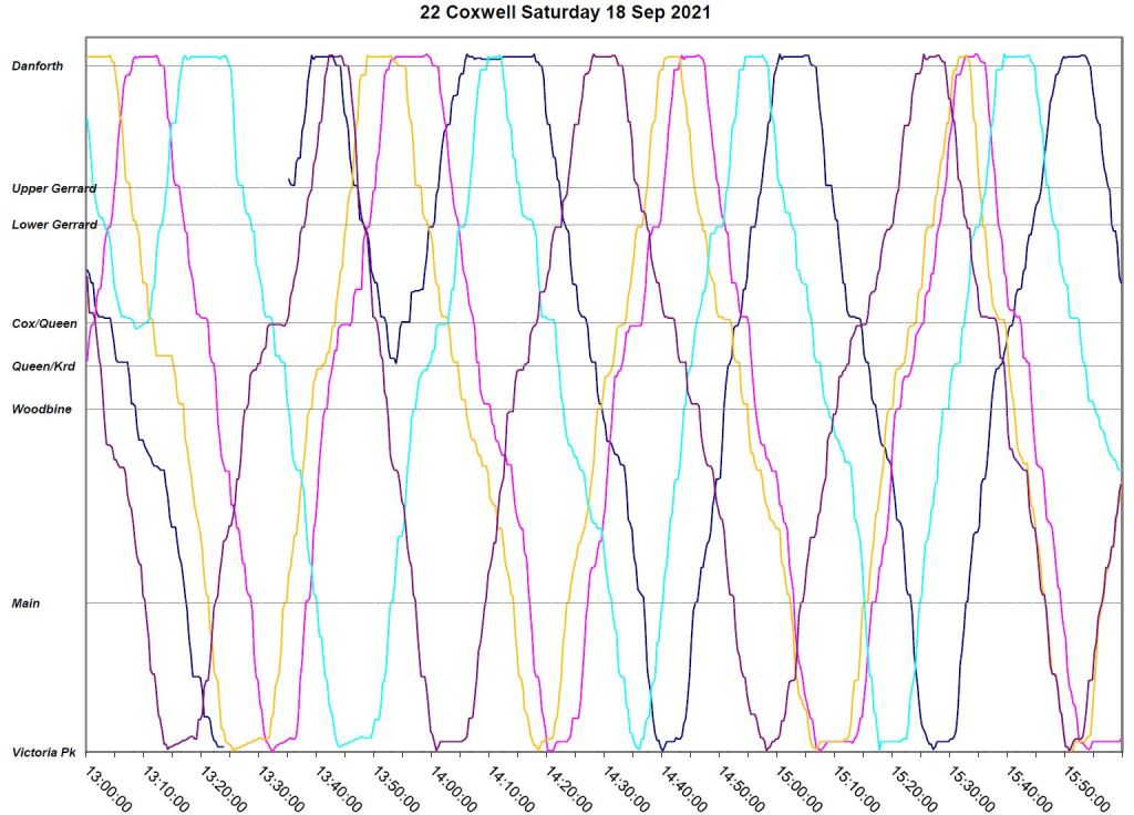 - The service remains reasonably spaced until about 4:30pm when “mauve” takes a layover at Coxwell Station making a gap in service for almost two trips.