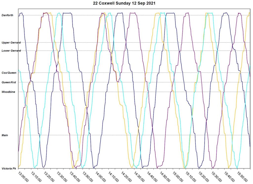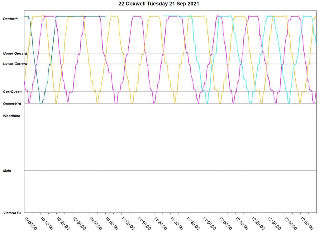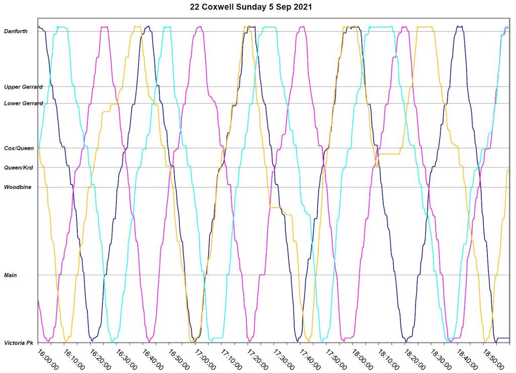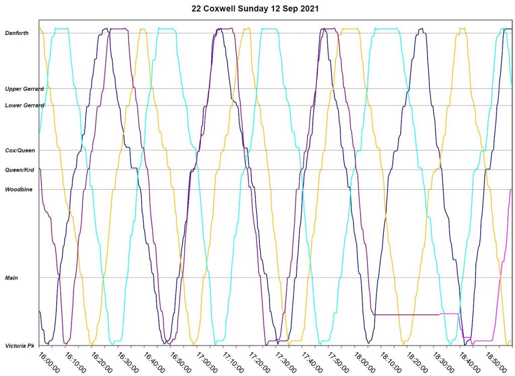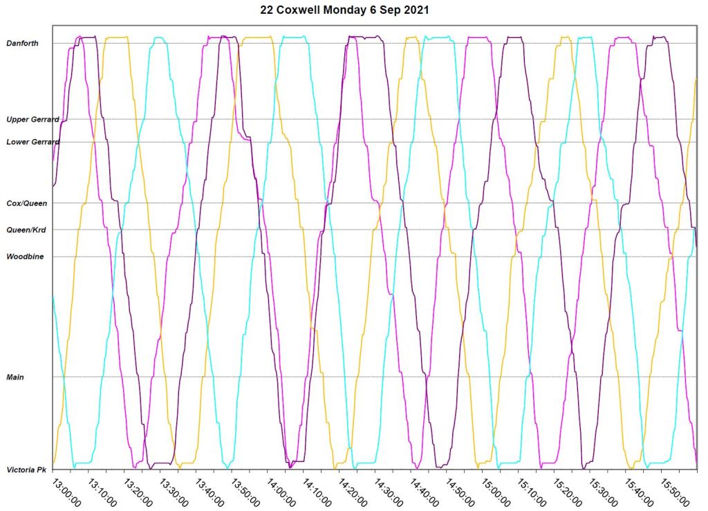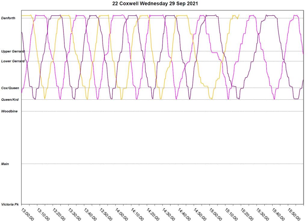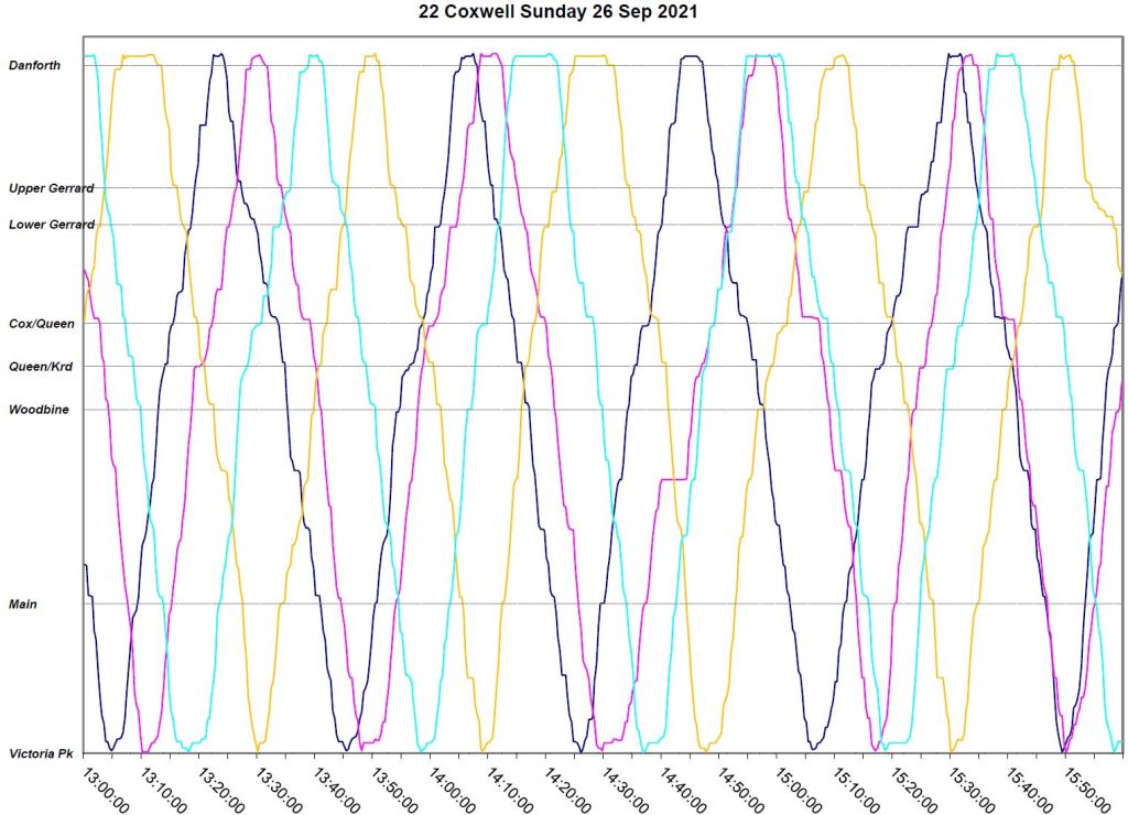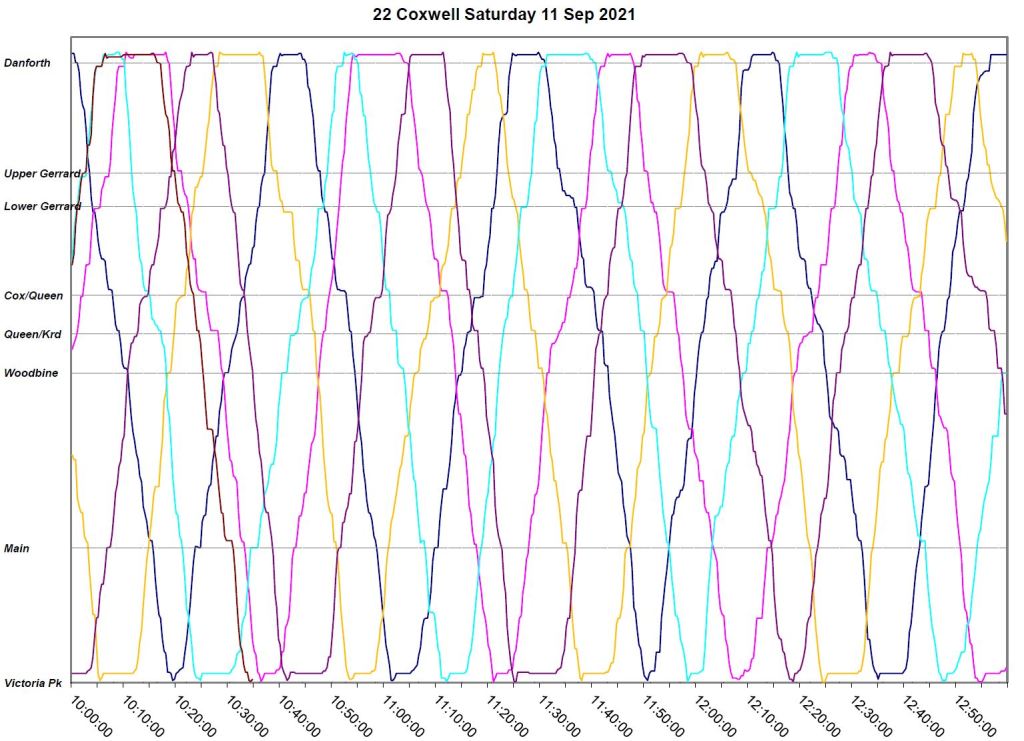 - The service remains reasonably spaced until about 4:30pm when “mauve” takes a layover at Coxwell Station making a gap in service for almost two trips.