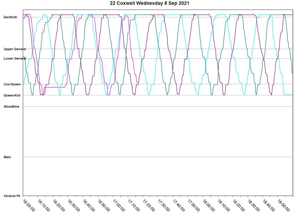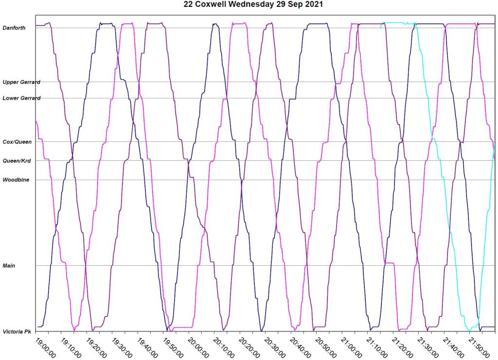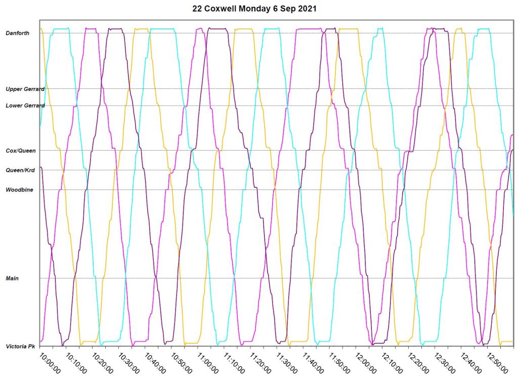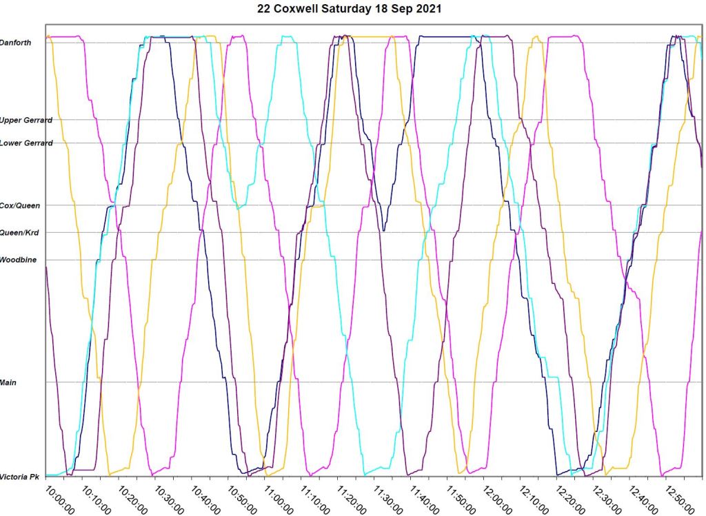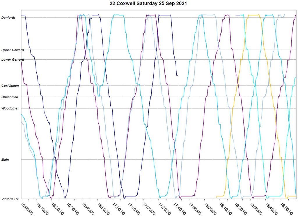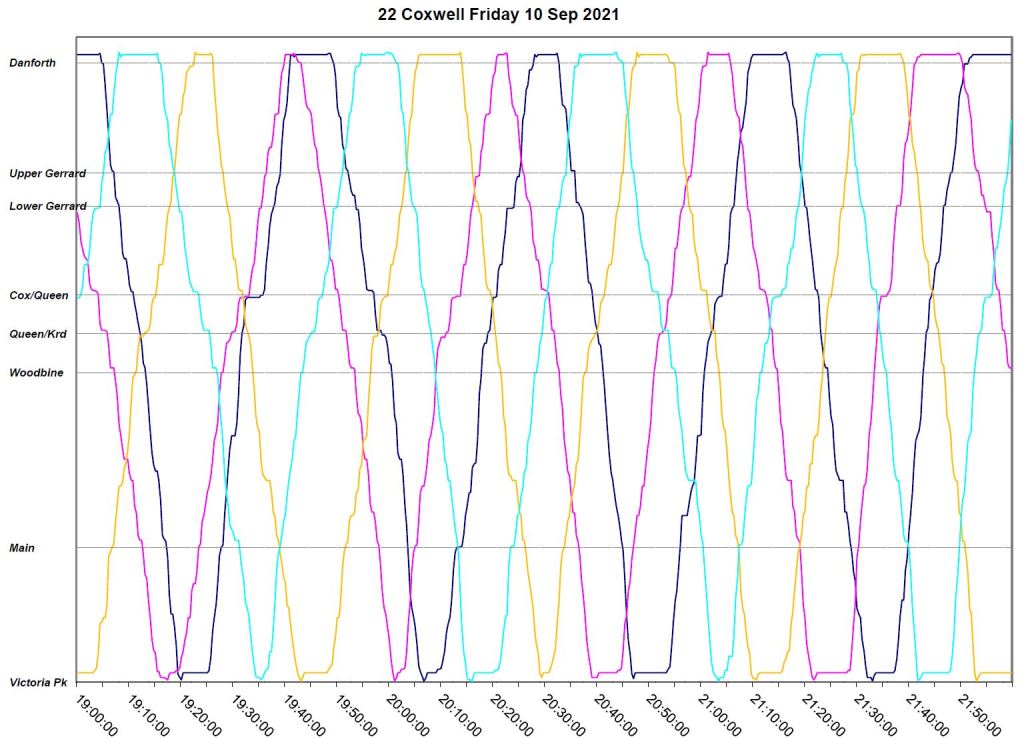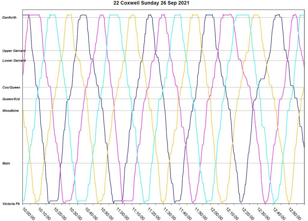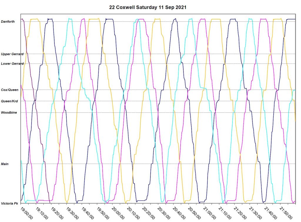 - The service remains reasonably spaced until about 4:30pm when “mauve” takes a layover at Coxwell Station making a gap in service for almost two trips.