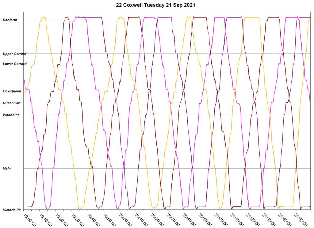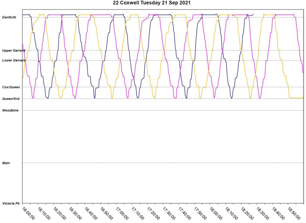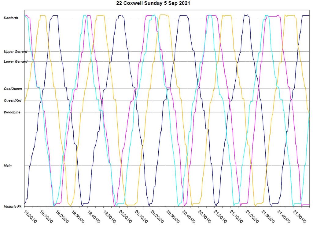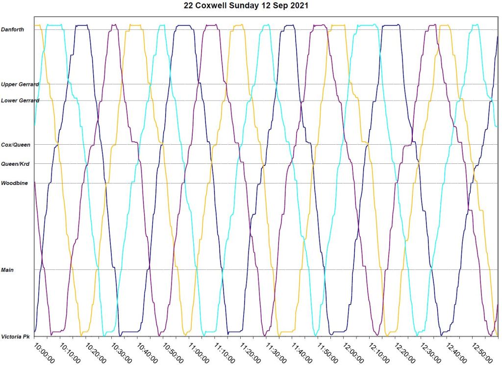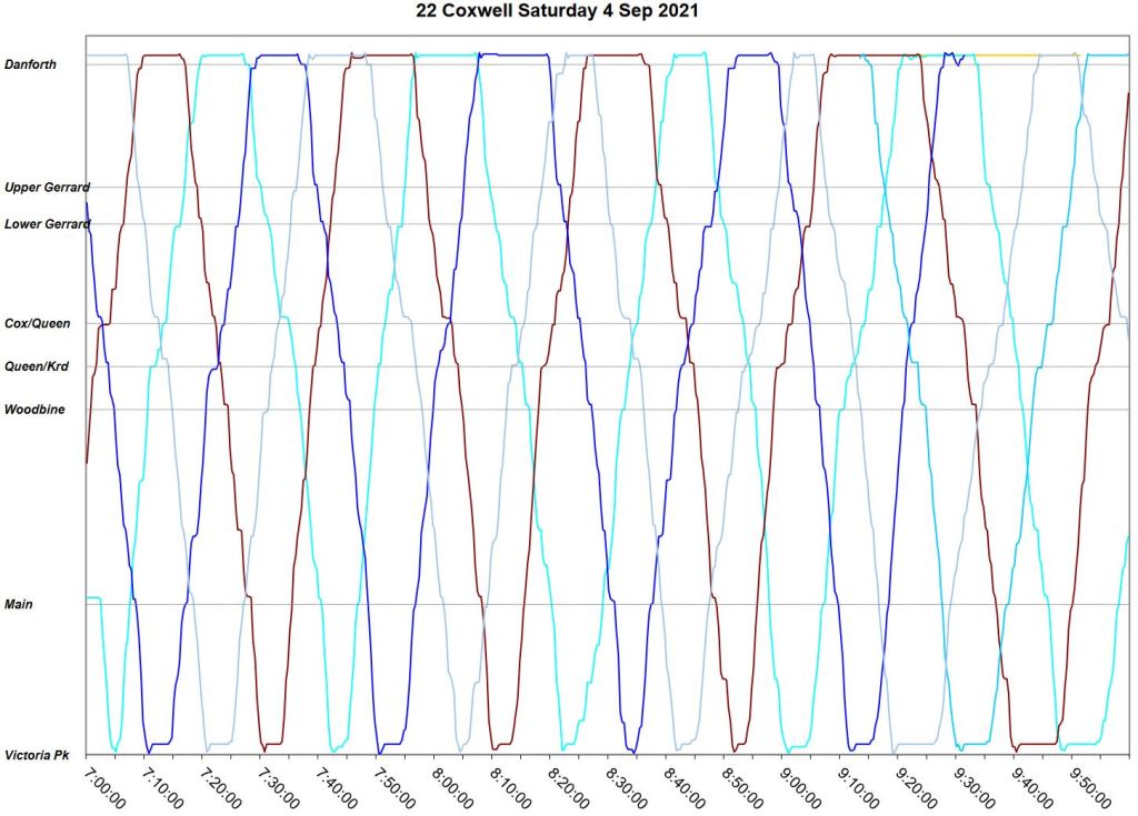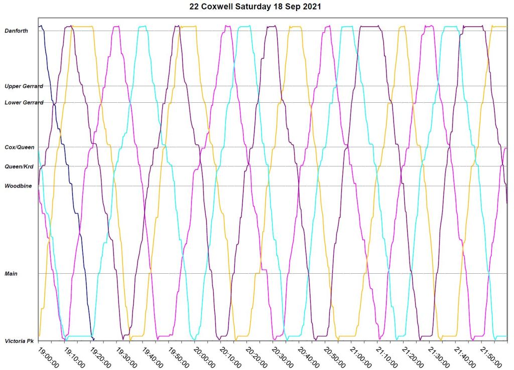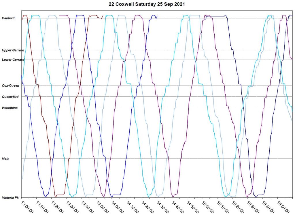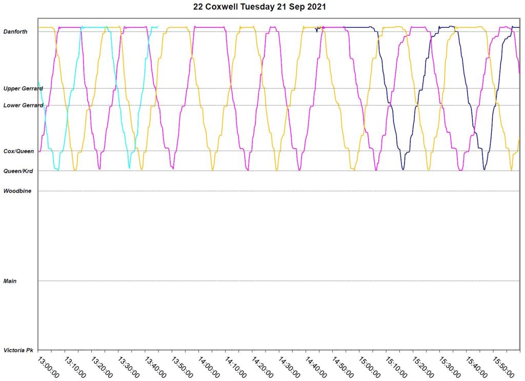 - The service remains reasonably spaced until about 4:30pm when “mauve” takes a layover at Coxwell Station making a gap in service for almost two trips.