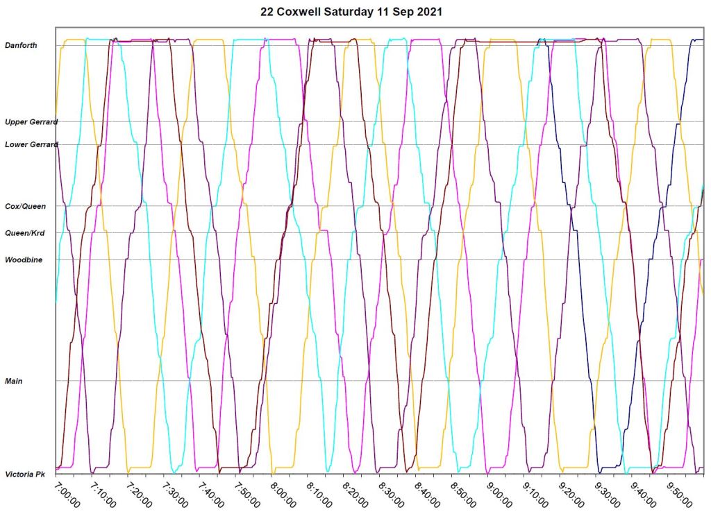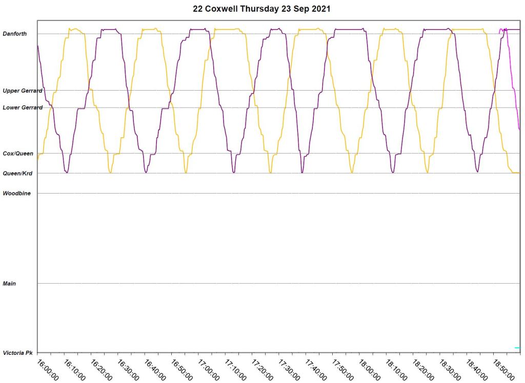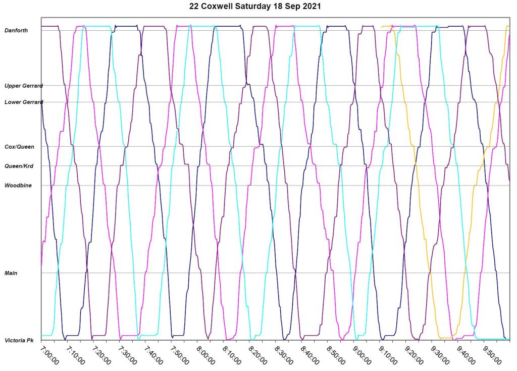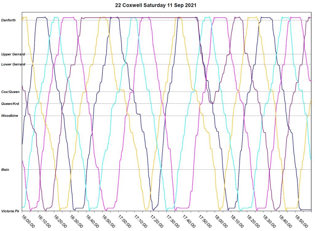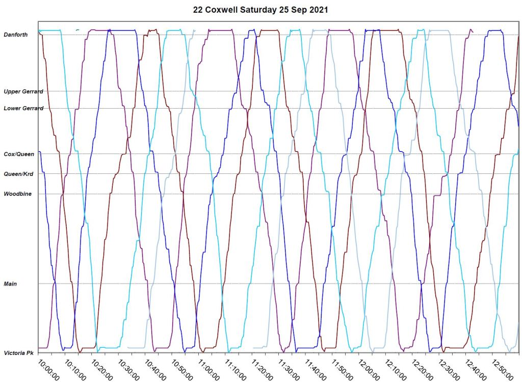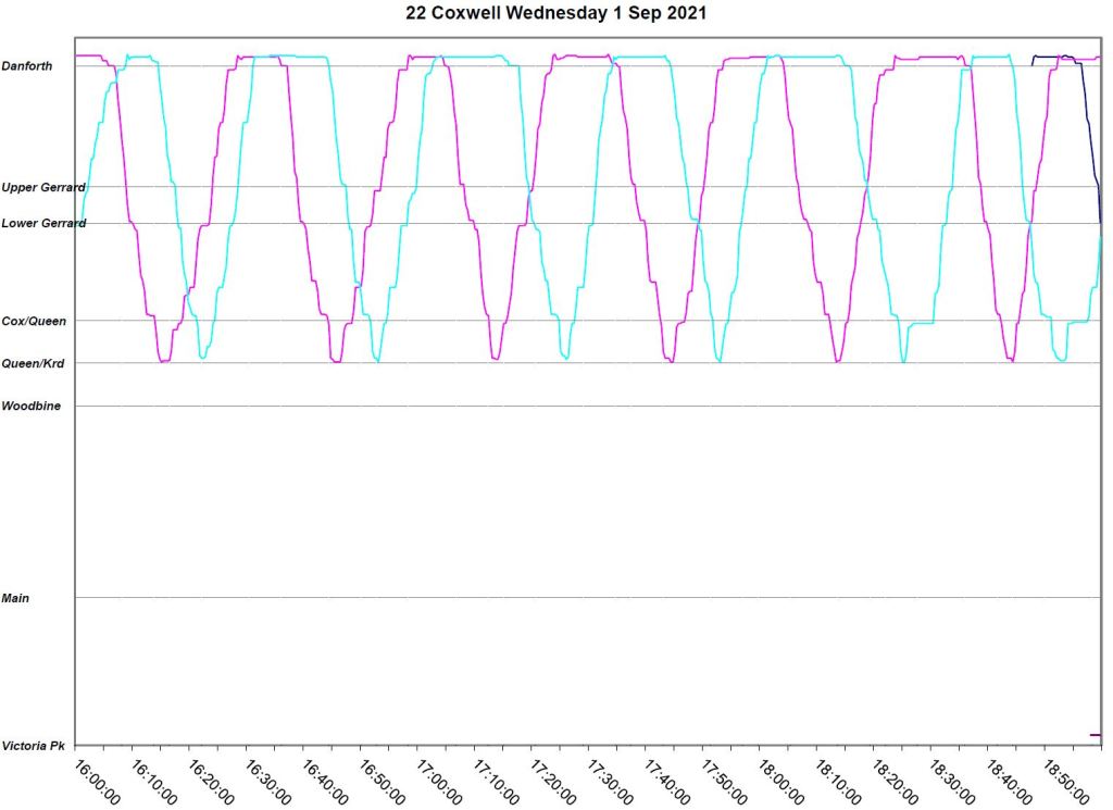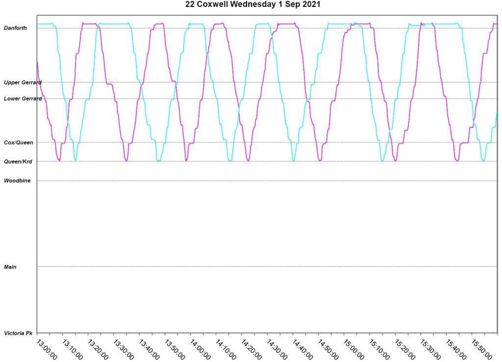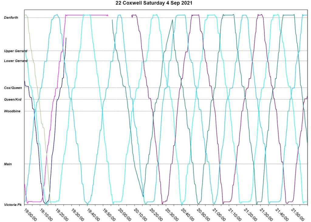 - The service remains reasonably spaced until about 4:30pm when “mauve” takes a layover at Coxwell Station making a gap in service for almost two trips.