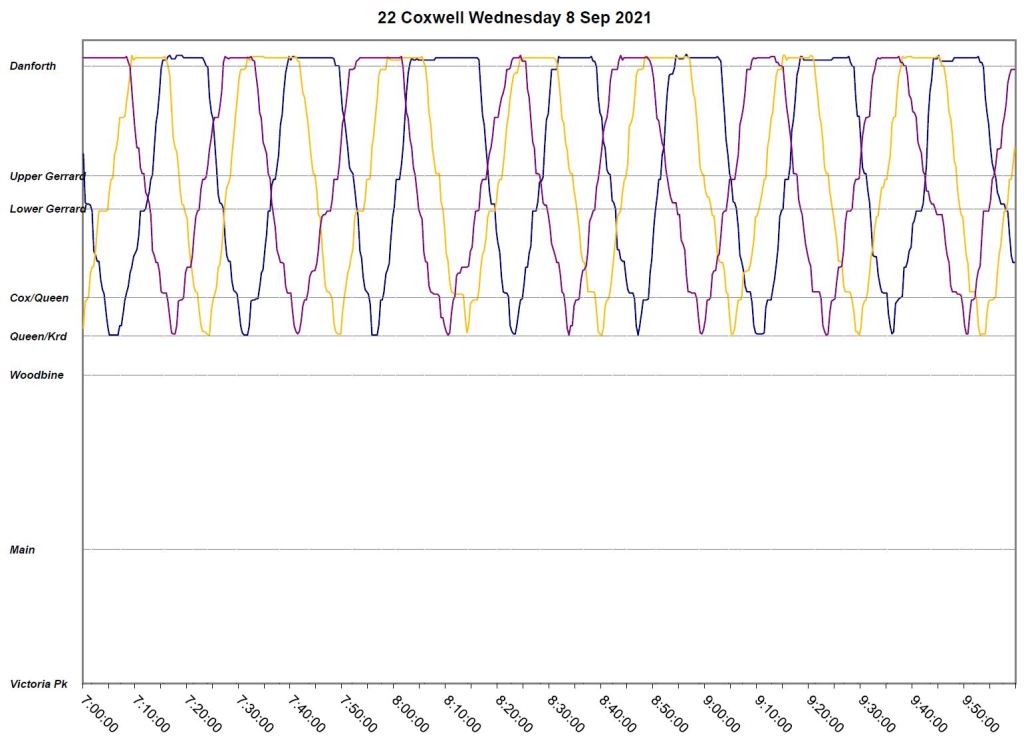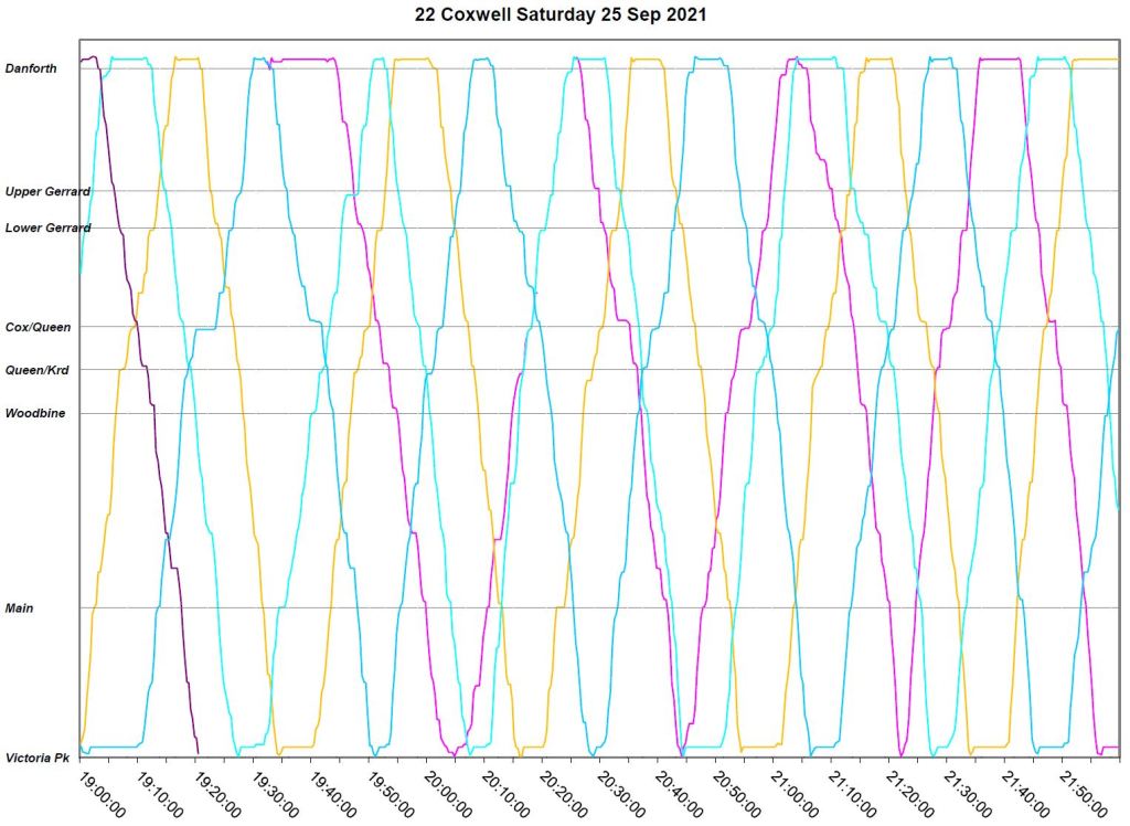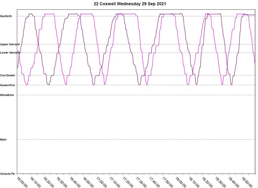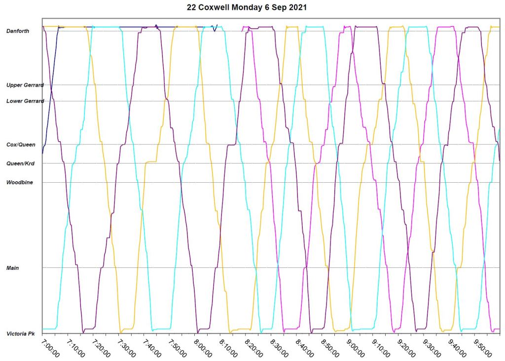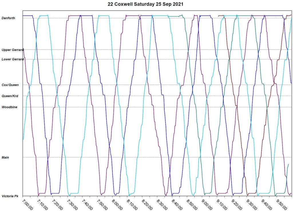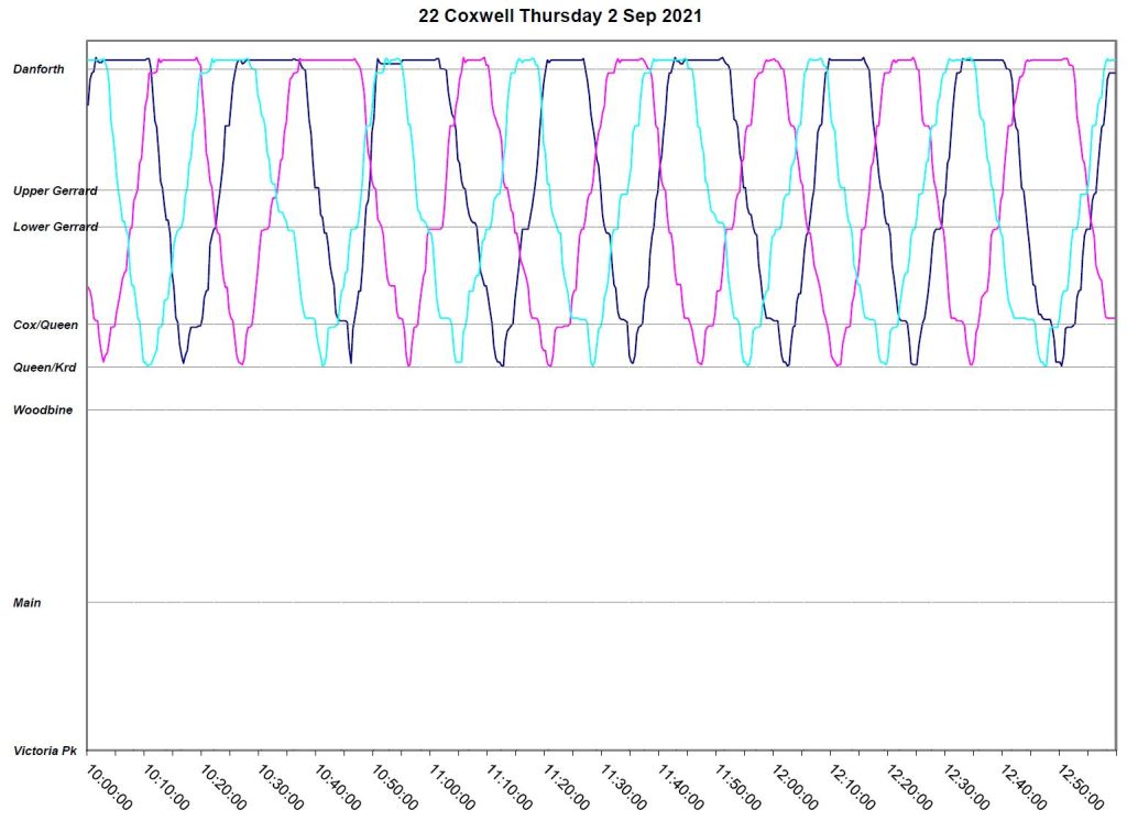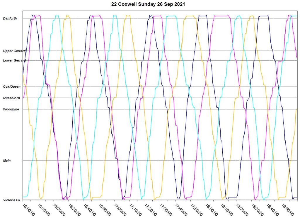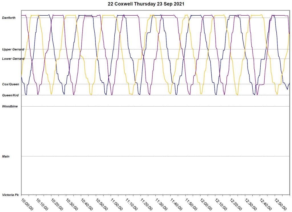 - The service remains reasonably spaced until about 4:30pm when “mauve” takes a layover at Coxwell Station making a gap in service for almost two trips.