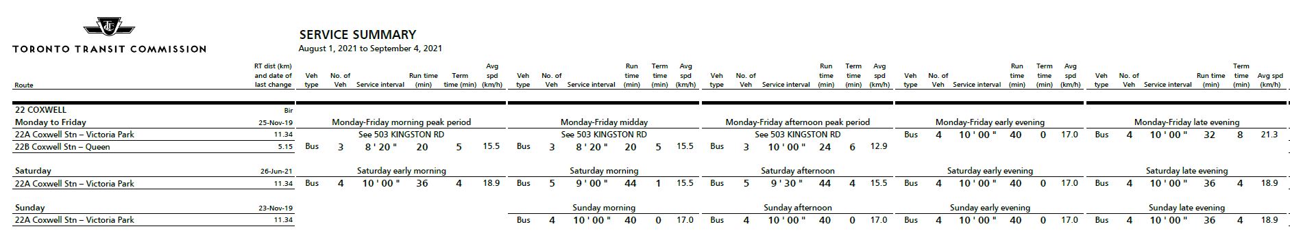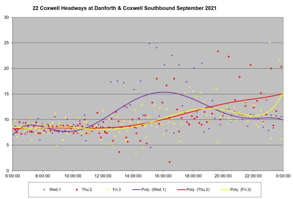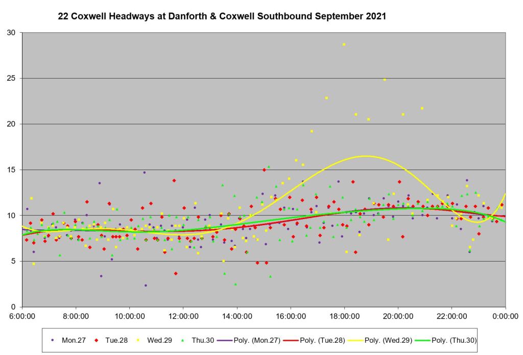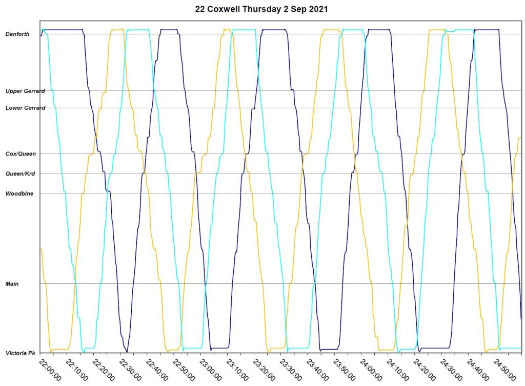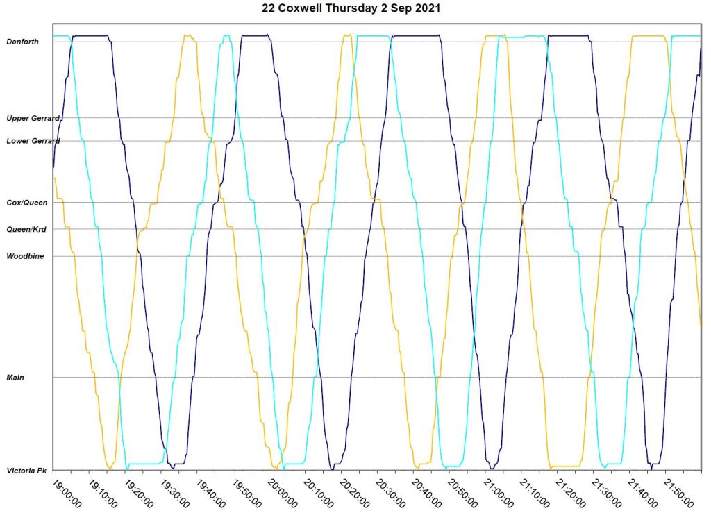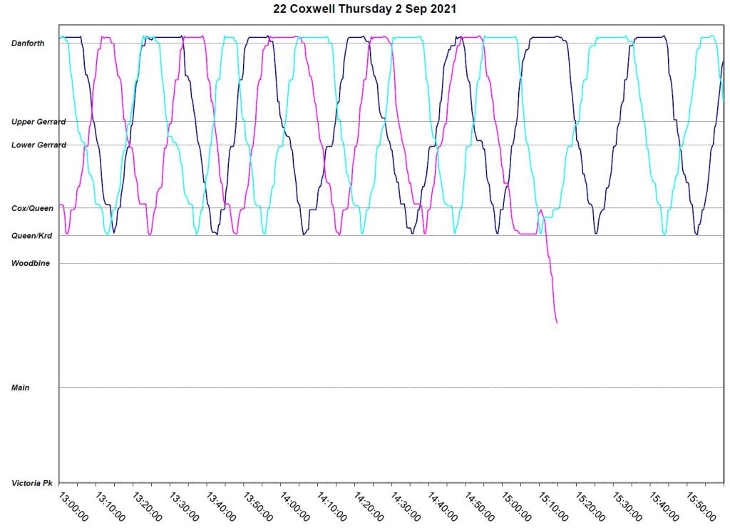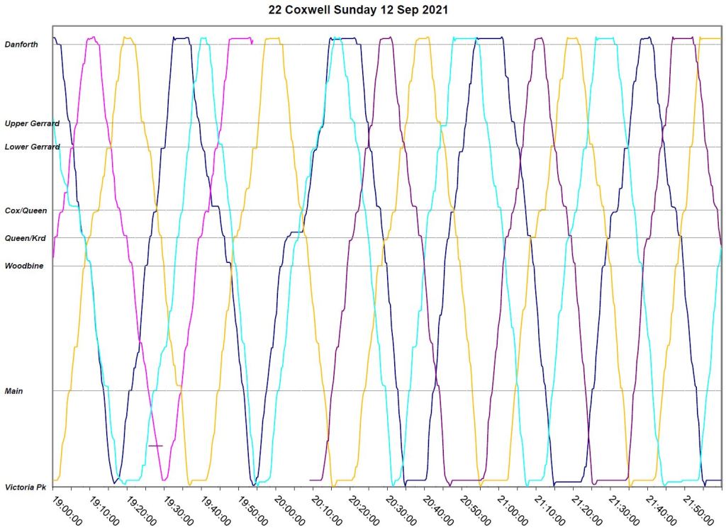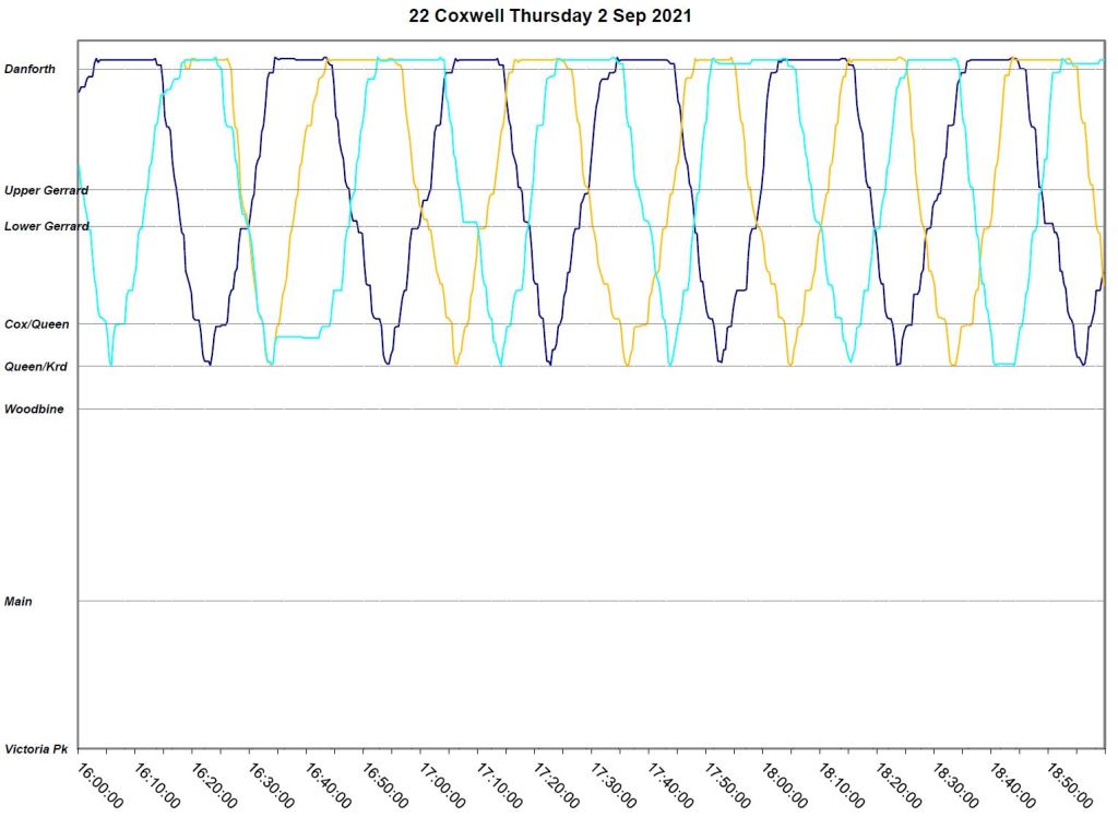 - The service remains reasonably spaced until about 4:30pm when “mauve” takes a layover at Coxwell Station making a gap in service for almost two trips.
