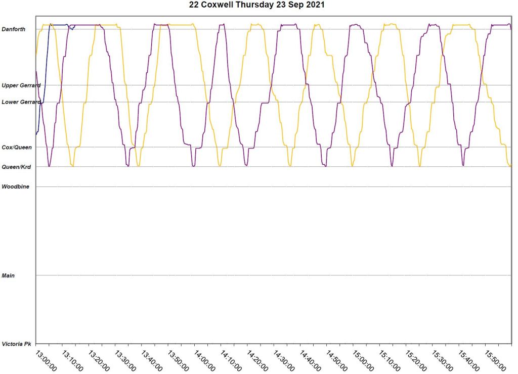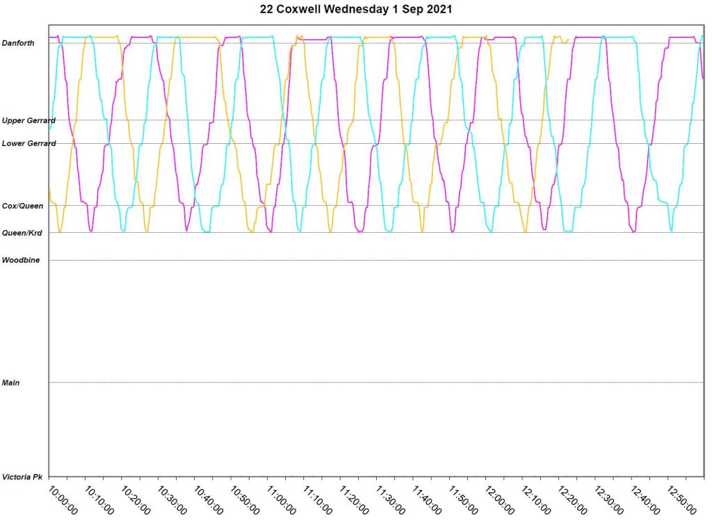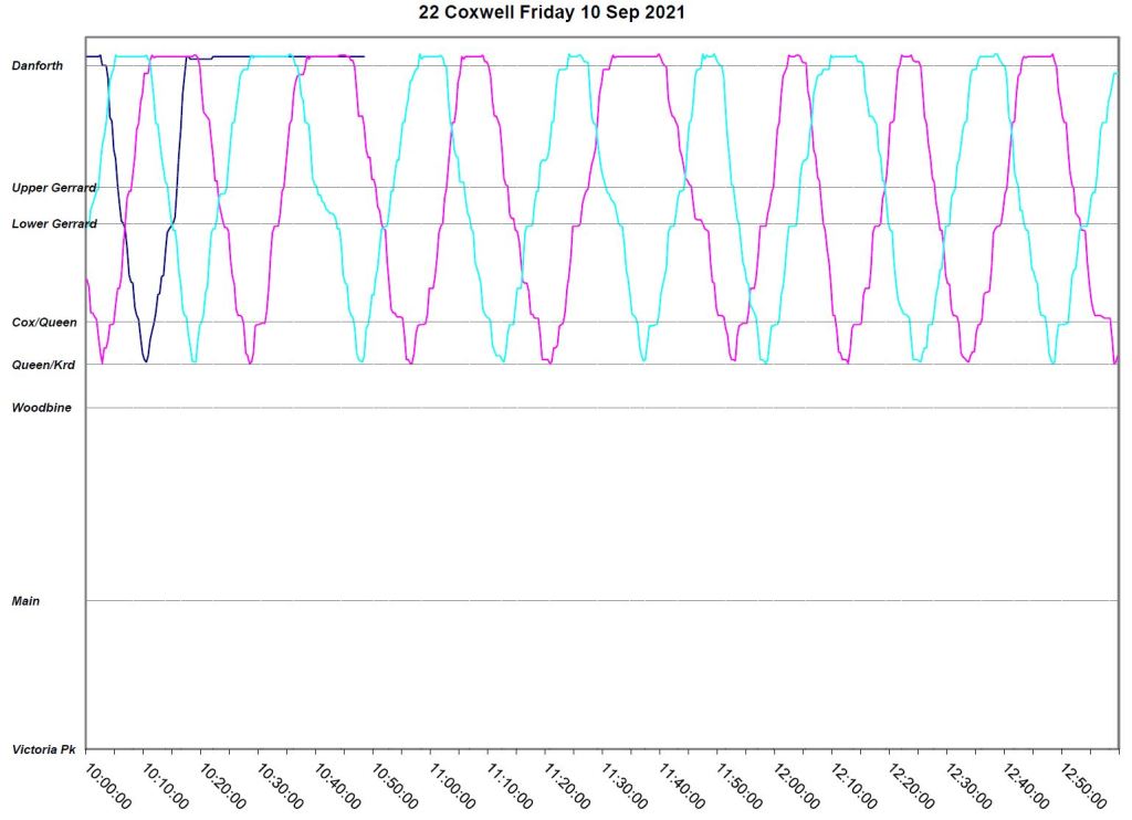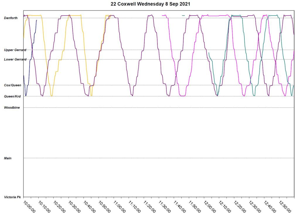 - At about 12:40pm, “purple” disappears for one trip at Coxwell Station, but reappears at about 1:30pm. This is likely a crew change problem.