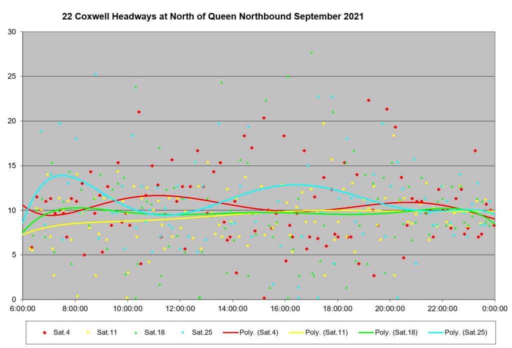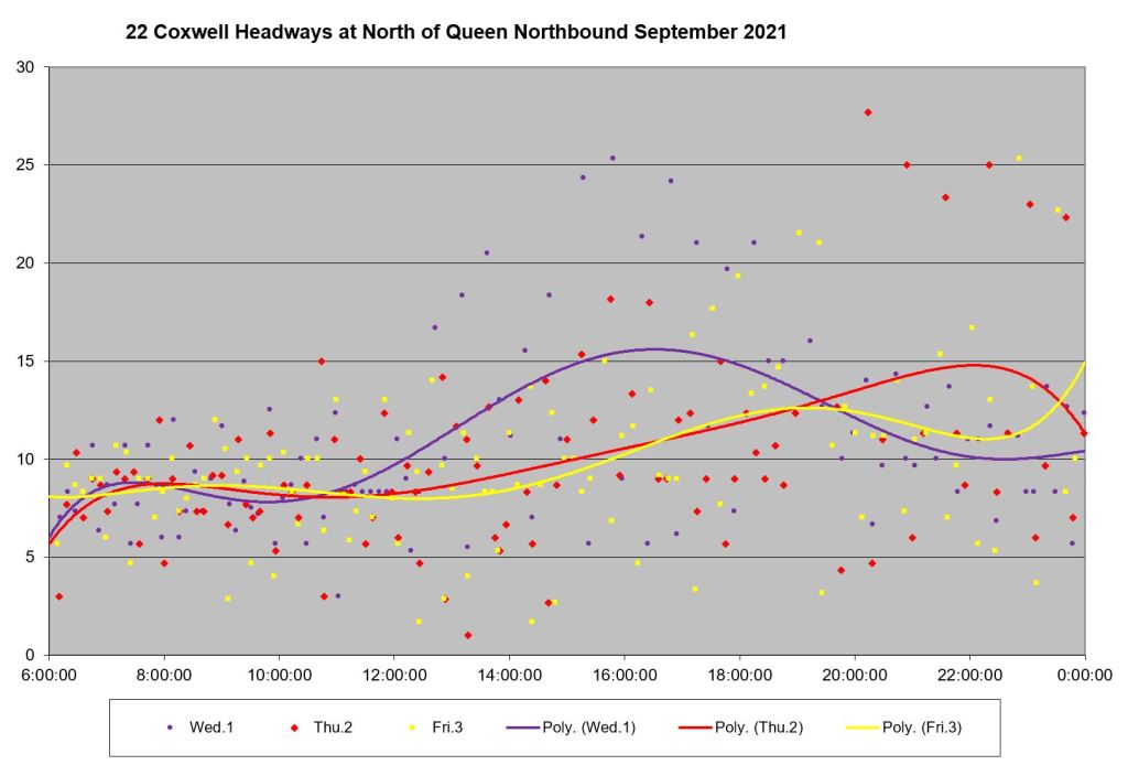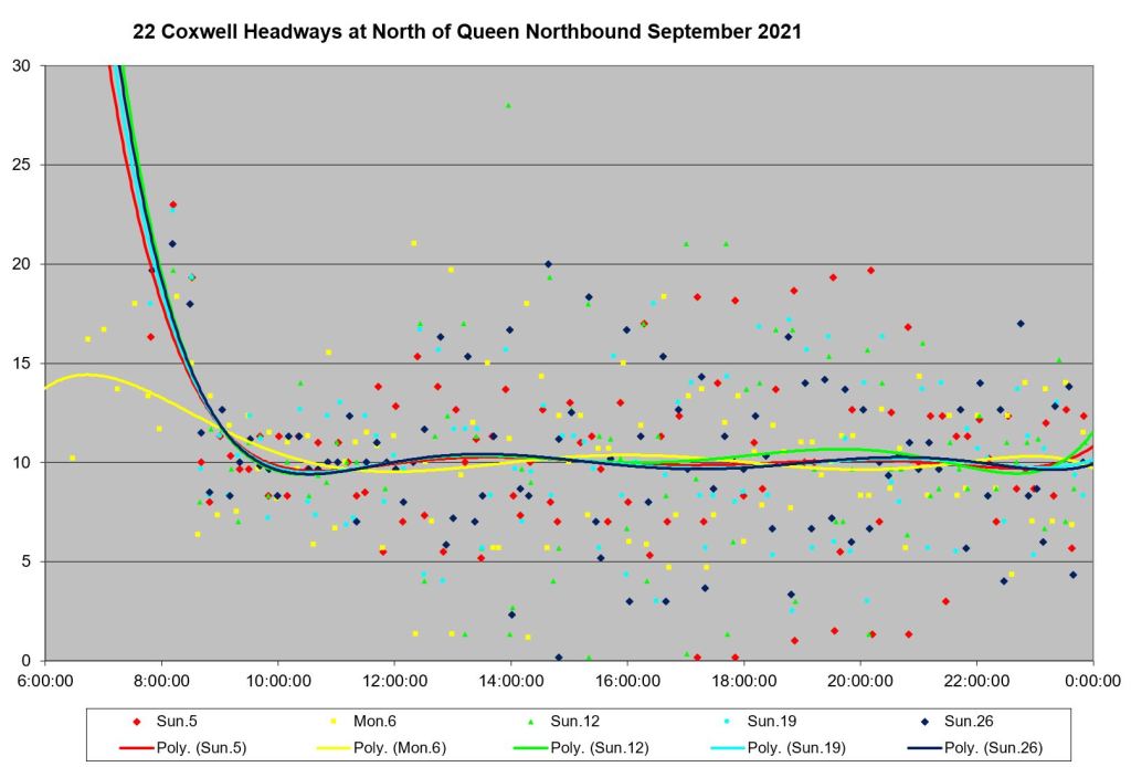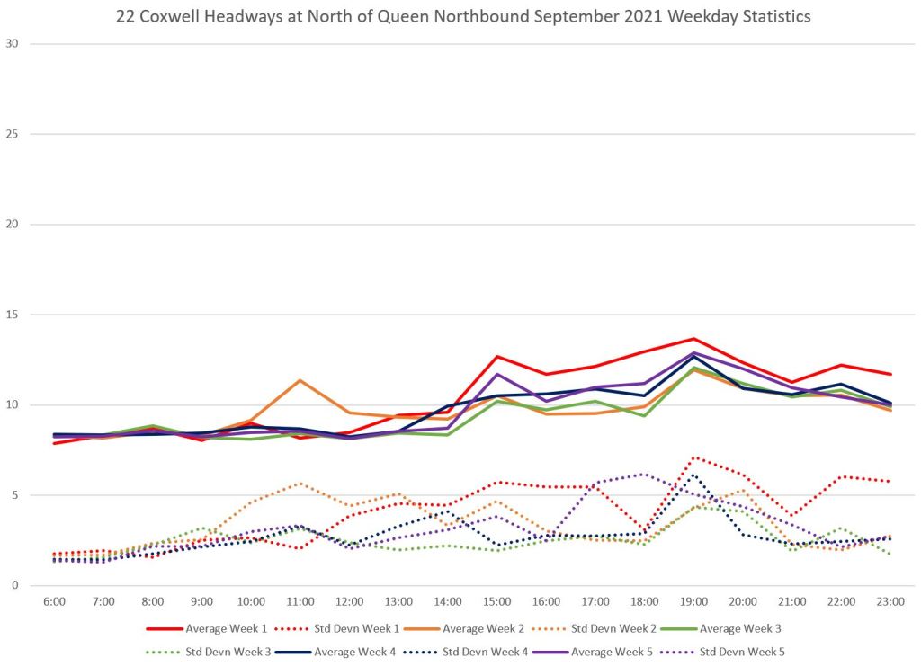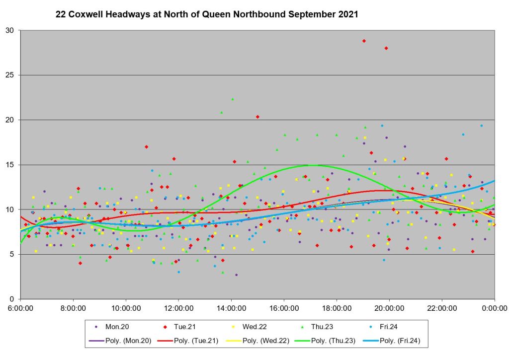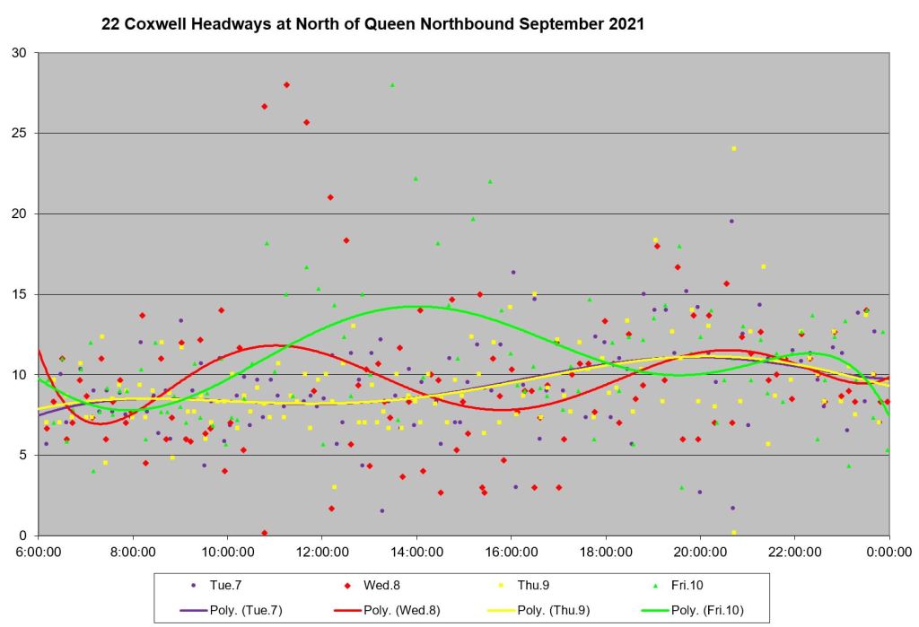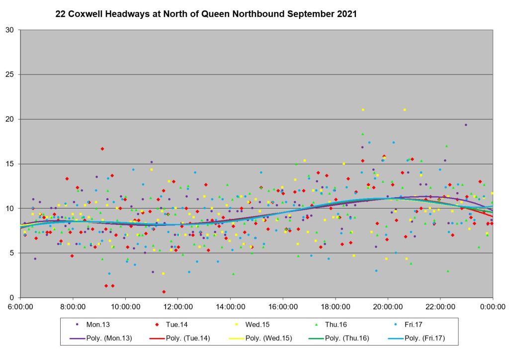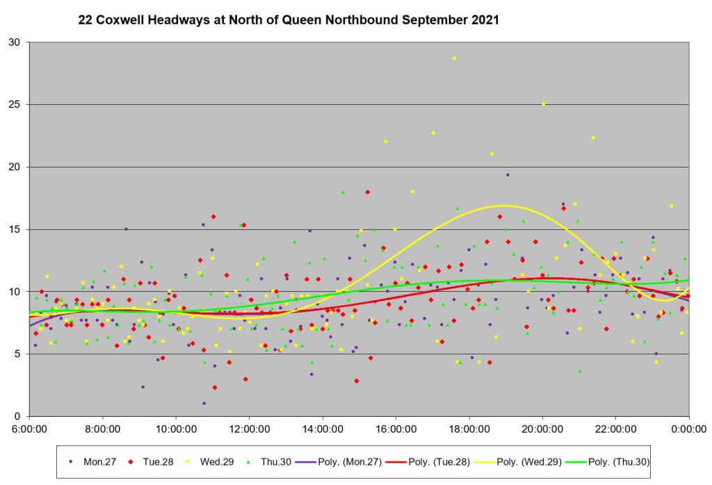 As in August, the service northbound at Queen shows many of the same patterns as for southbound trips above, but with more dispersion in the headway values (this is reflected in the higher standard deviation values).