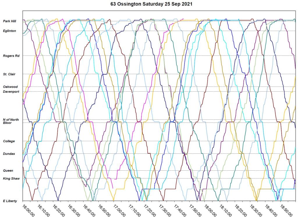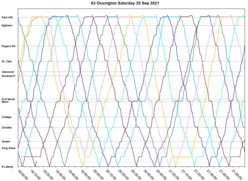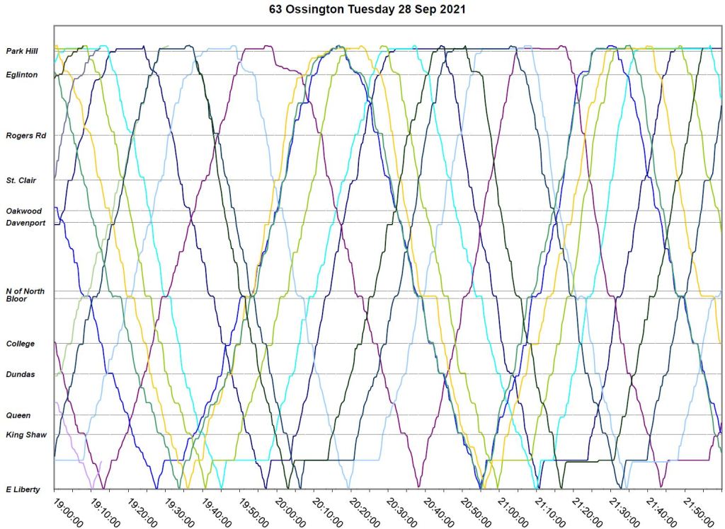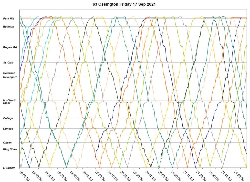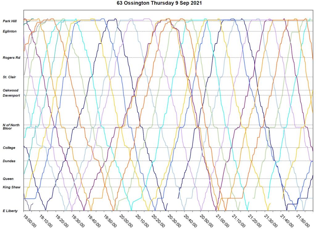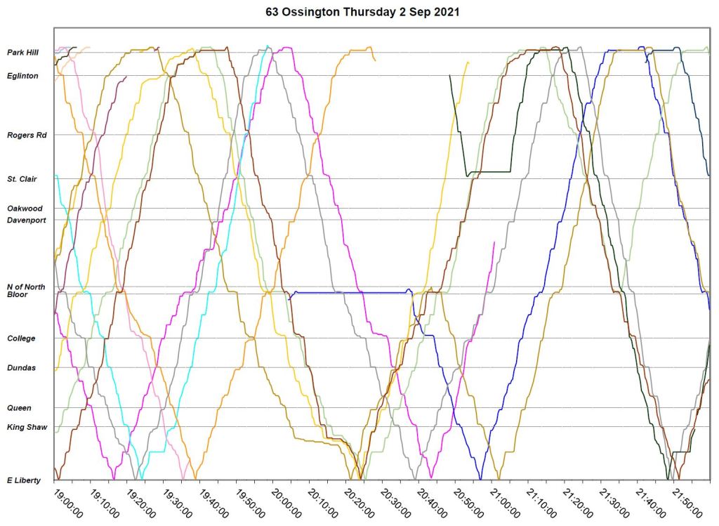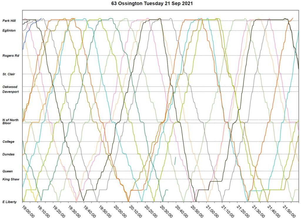 - During the evening, the service is generally well-behaved. Where pairs form, this usually arises from buses taking long layovers at Eglinton West or Ossington Stations.