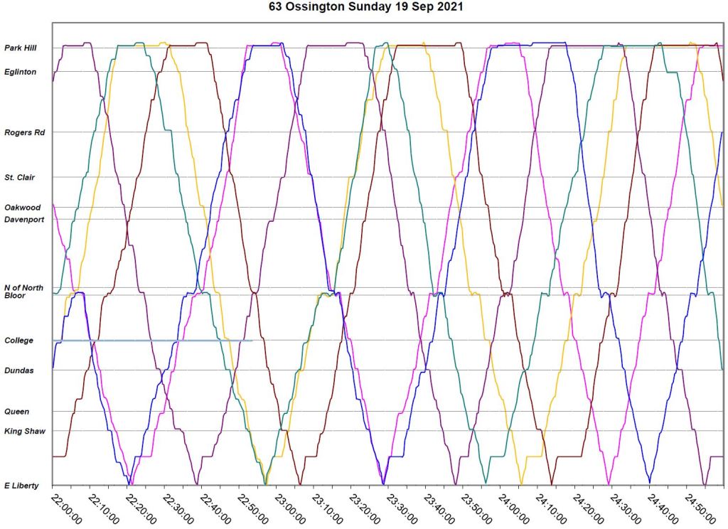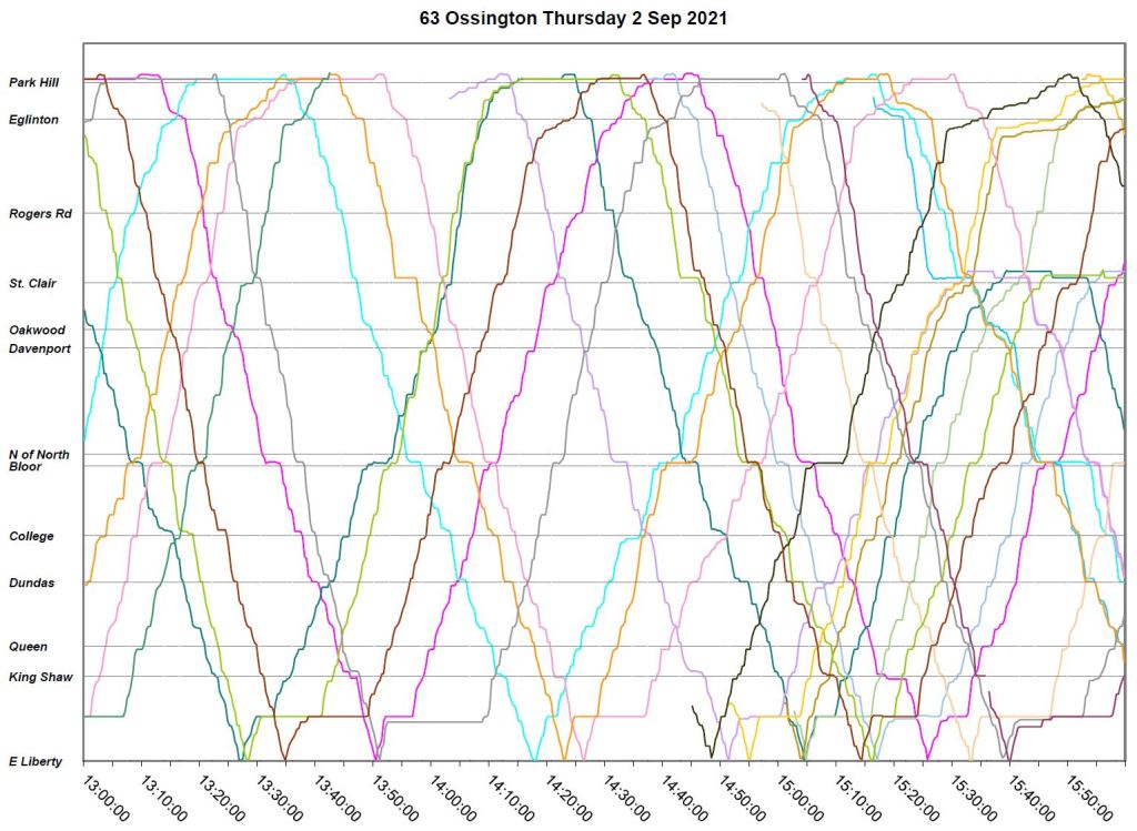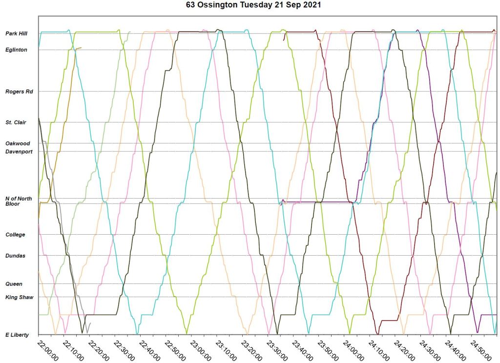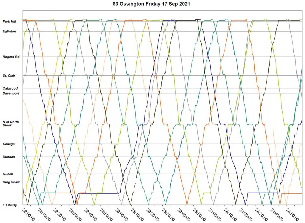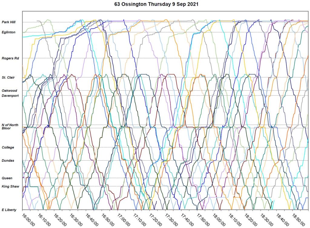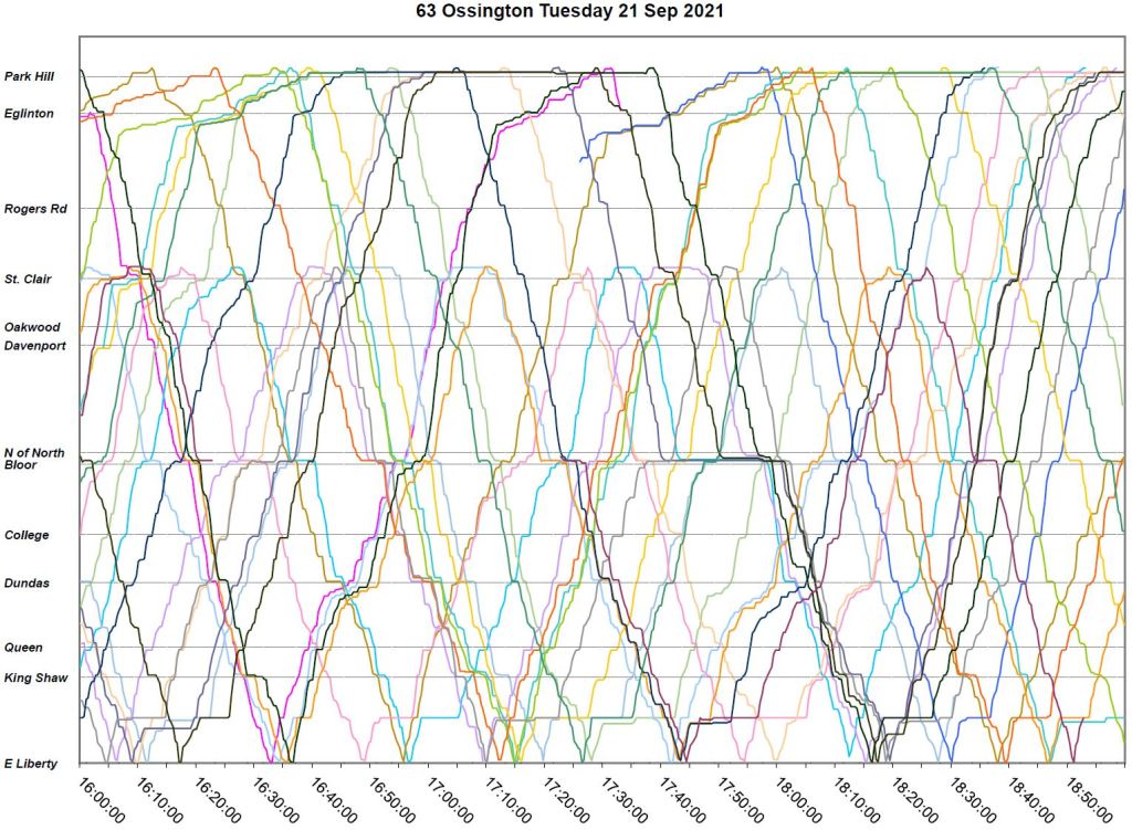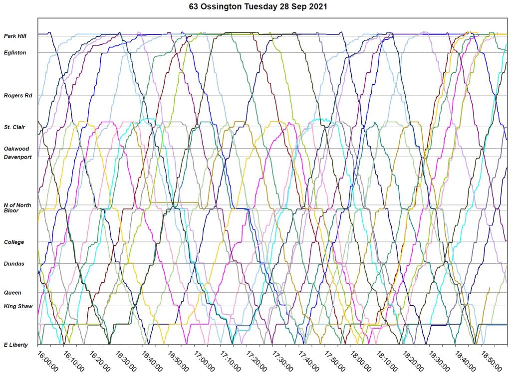 - During the evening, the service is generally well-behaved. Where pairs form, this usually arises from buses taking long layovers at Eglinton West or Ossington Stations.