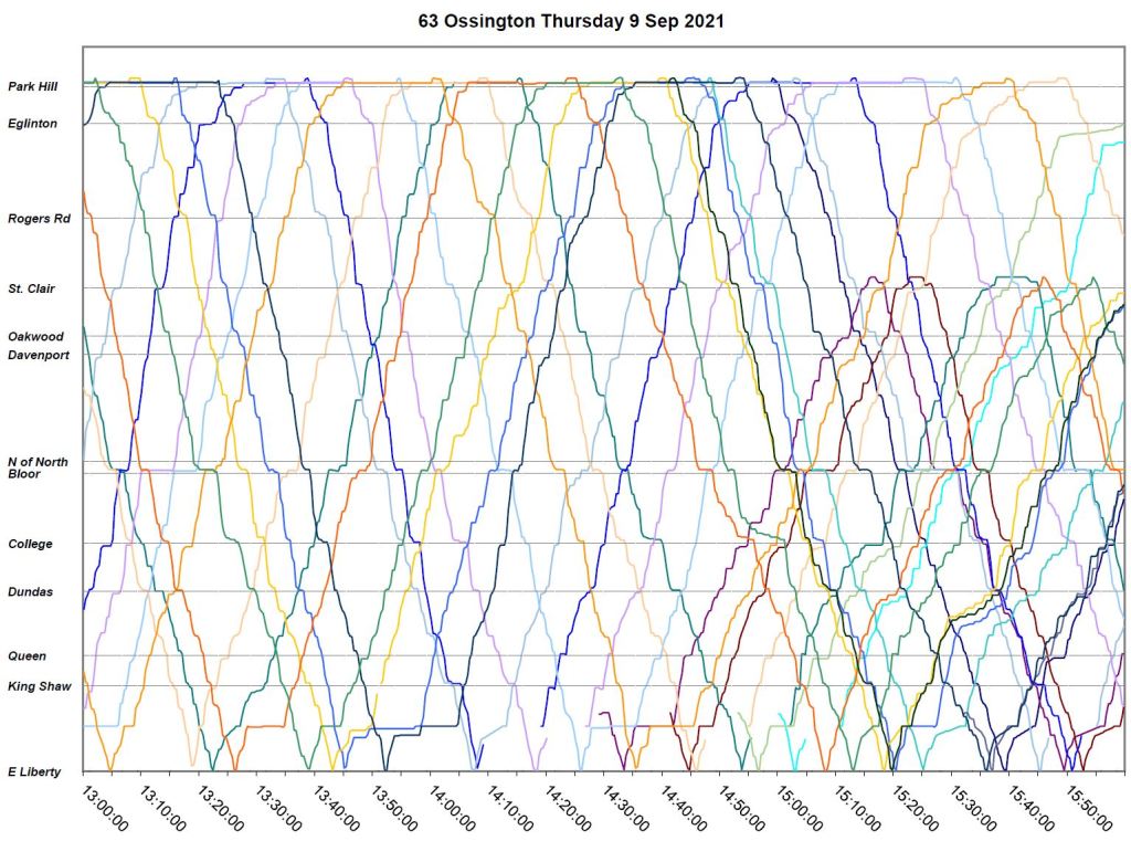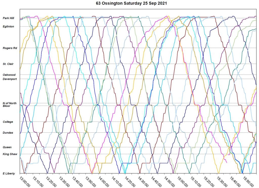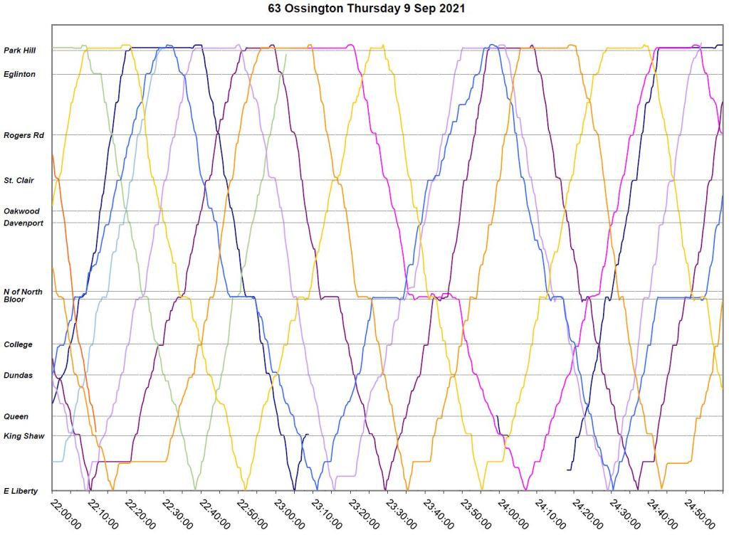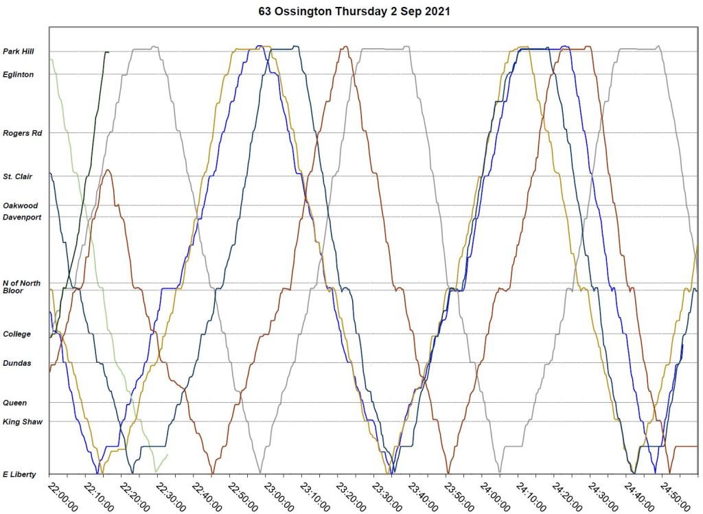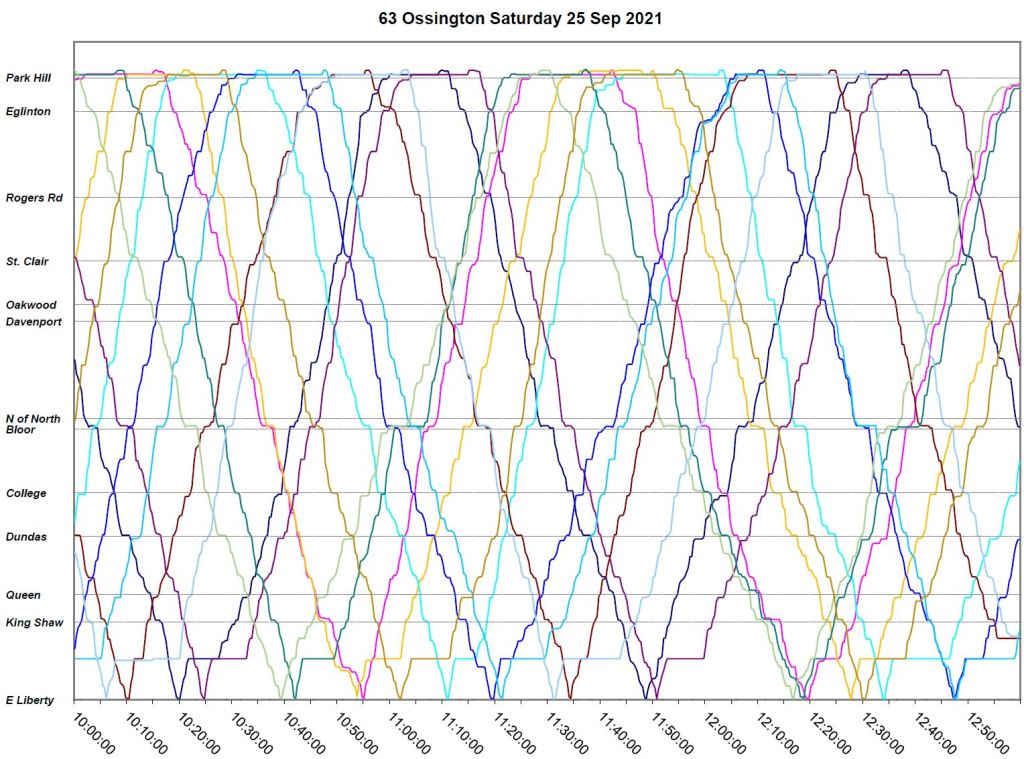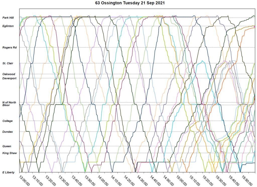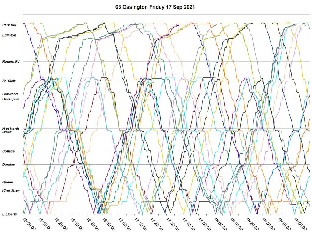 - During the evening, the service is generally well-behaved. Where pairs form, this usually arises from buses taking long layovers at Eglinton West or Ossington Stations.