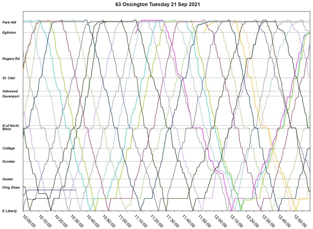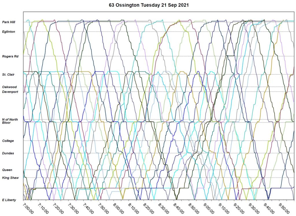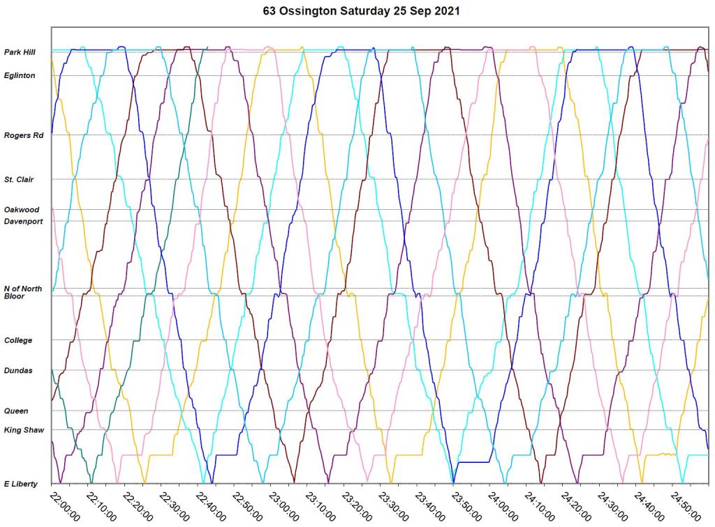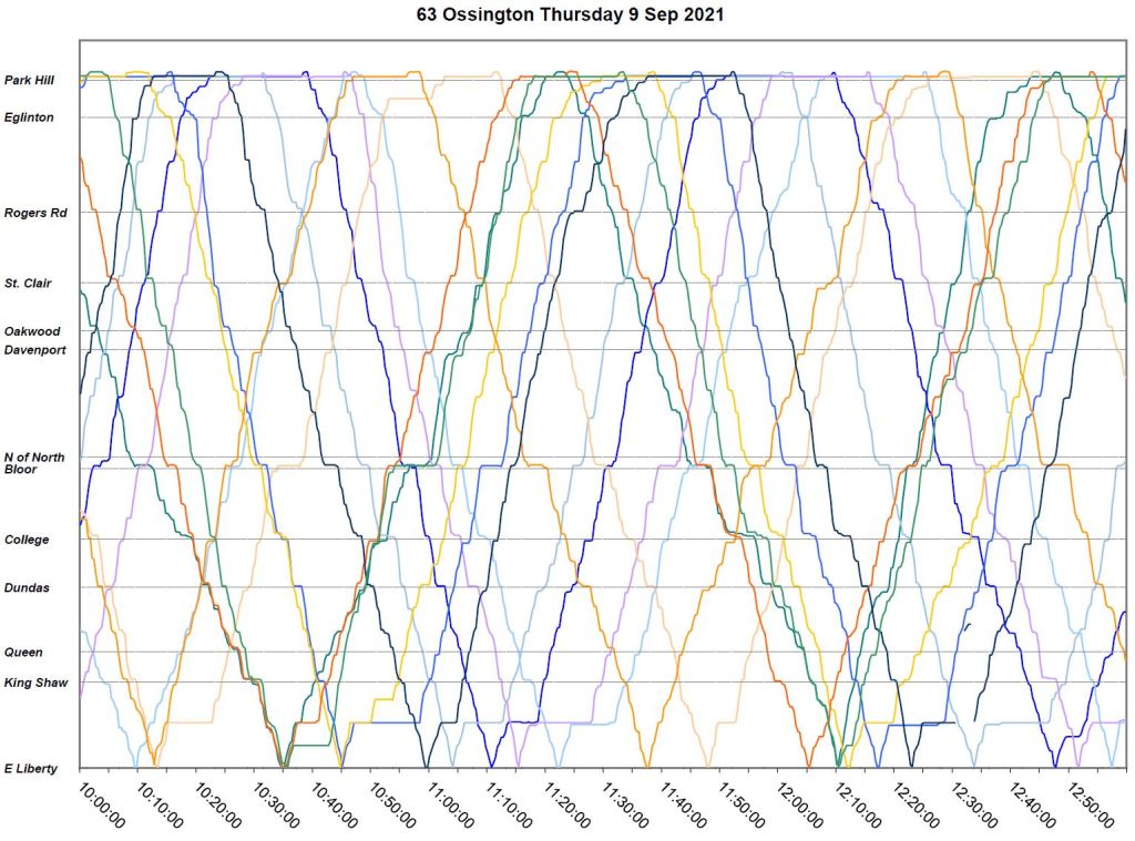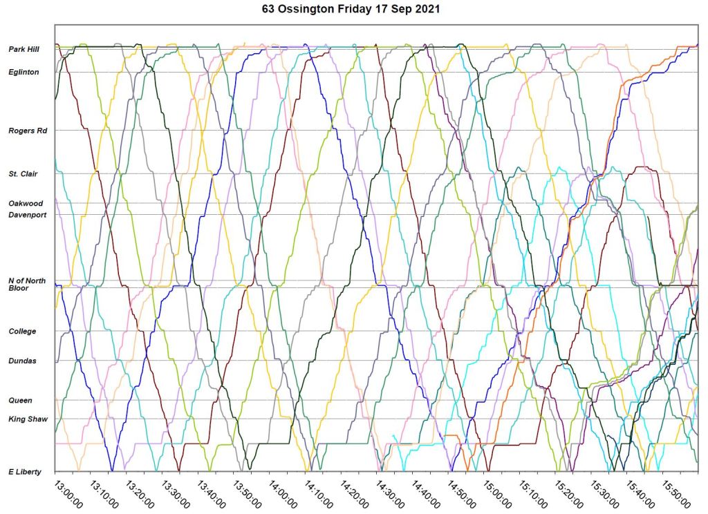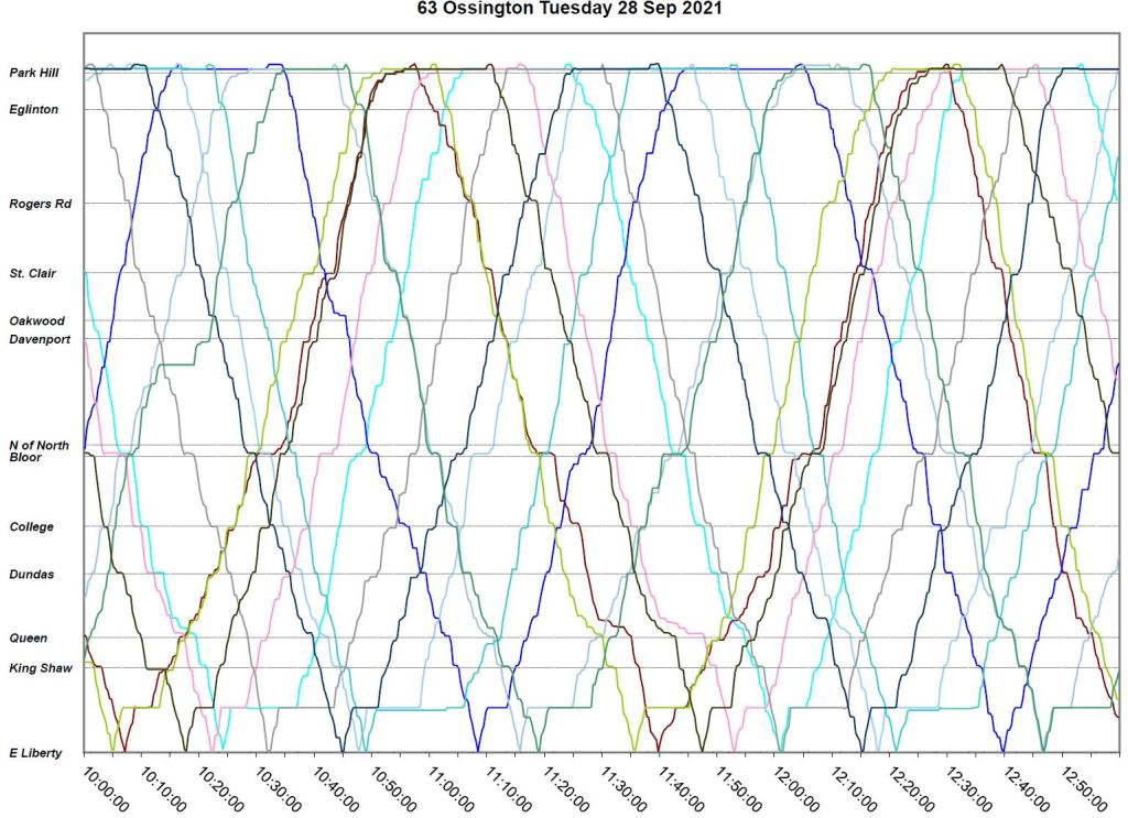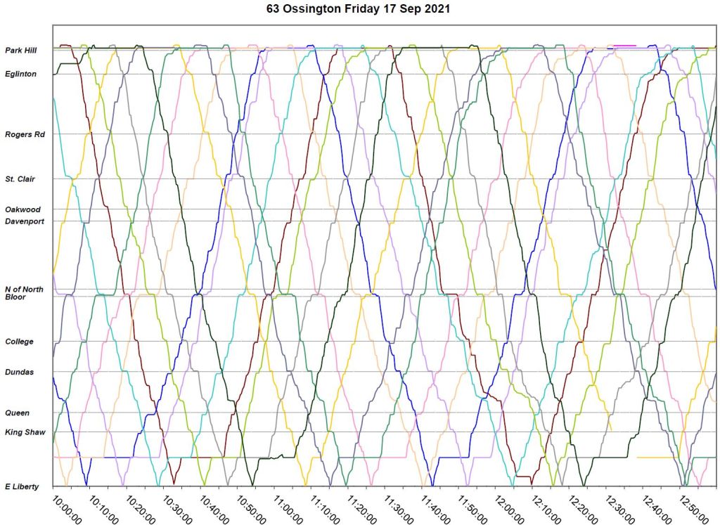 - During the evening, the service is generally well-behaved. Where pairs form, this usually arises from buses taking long layovers at Eglinton West or Ossington Stations.
