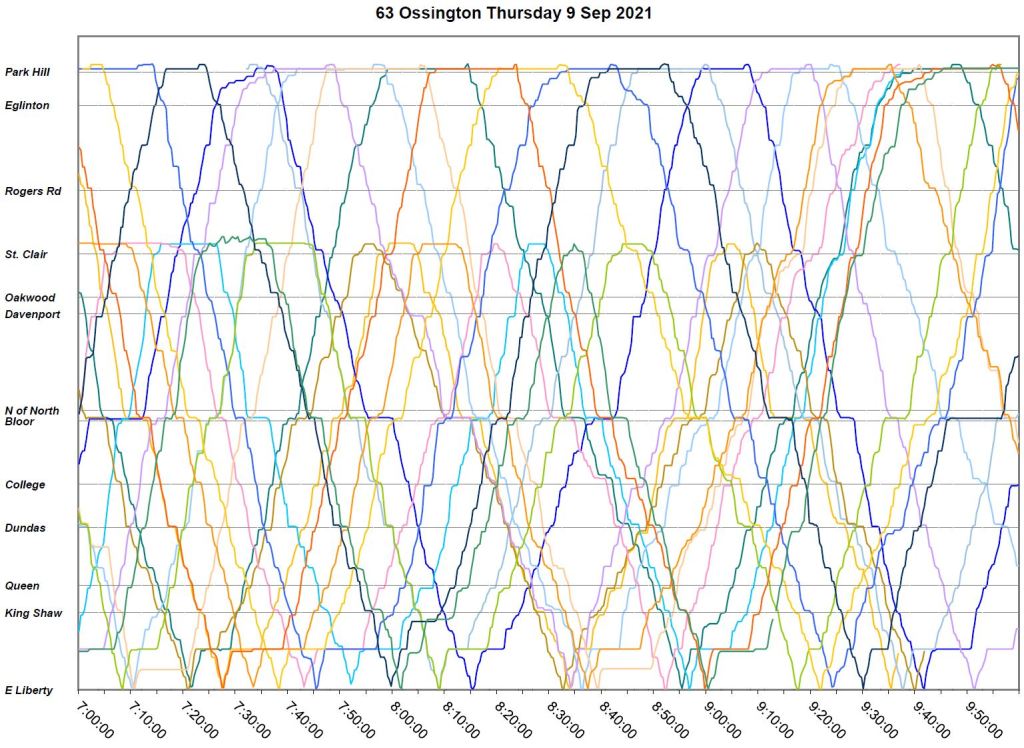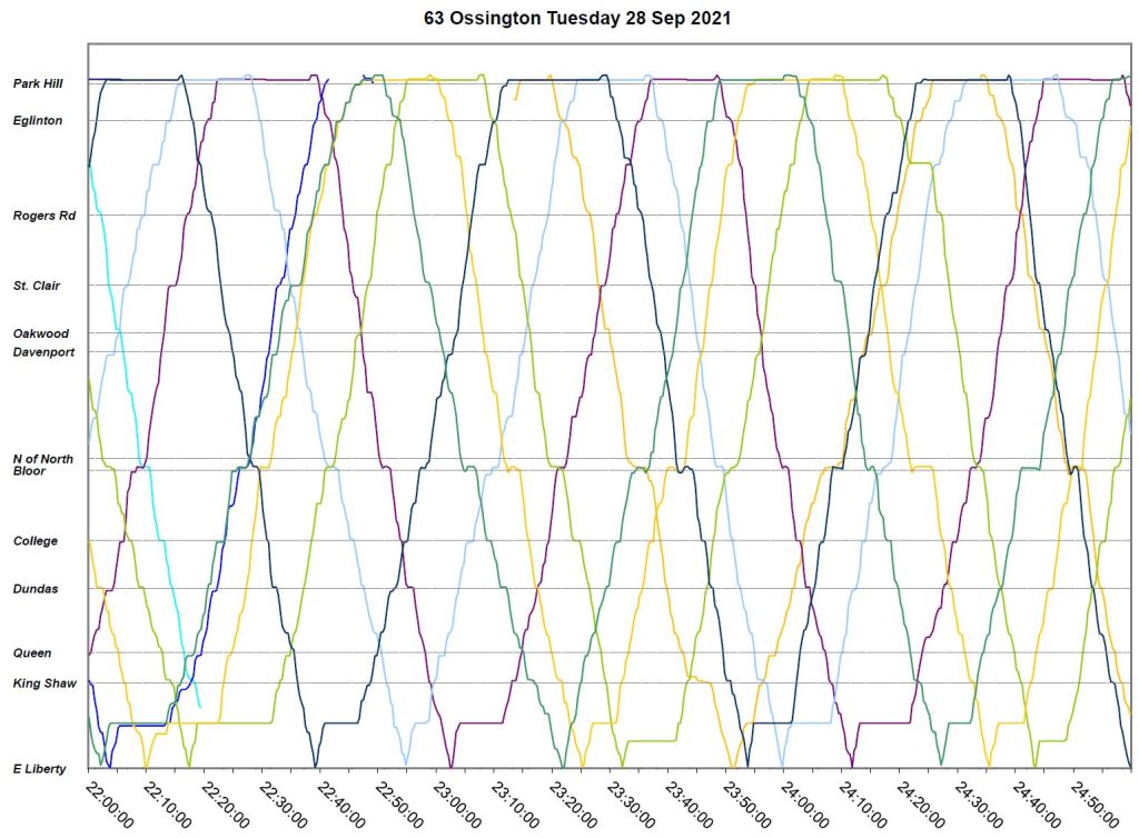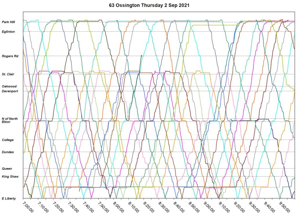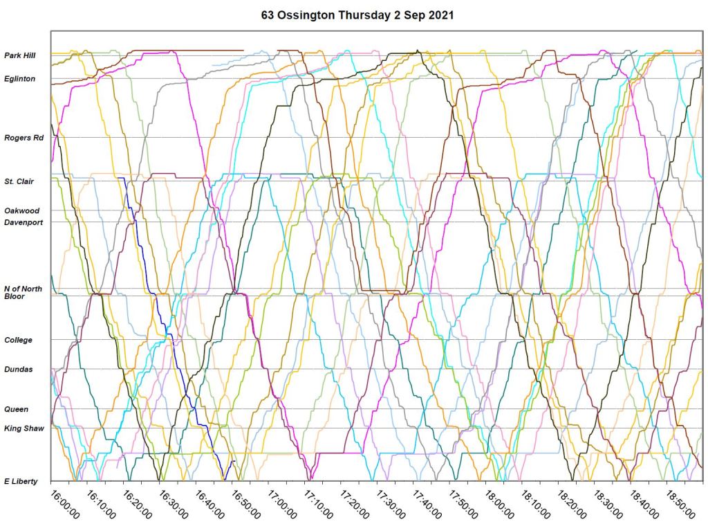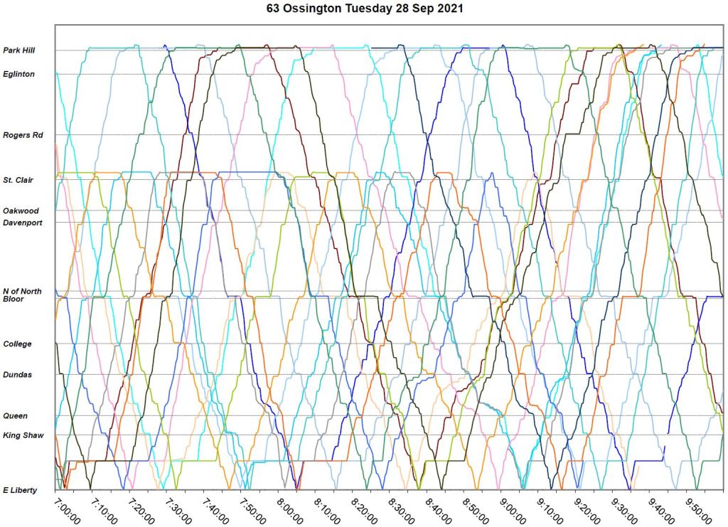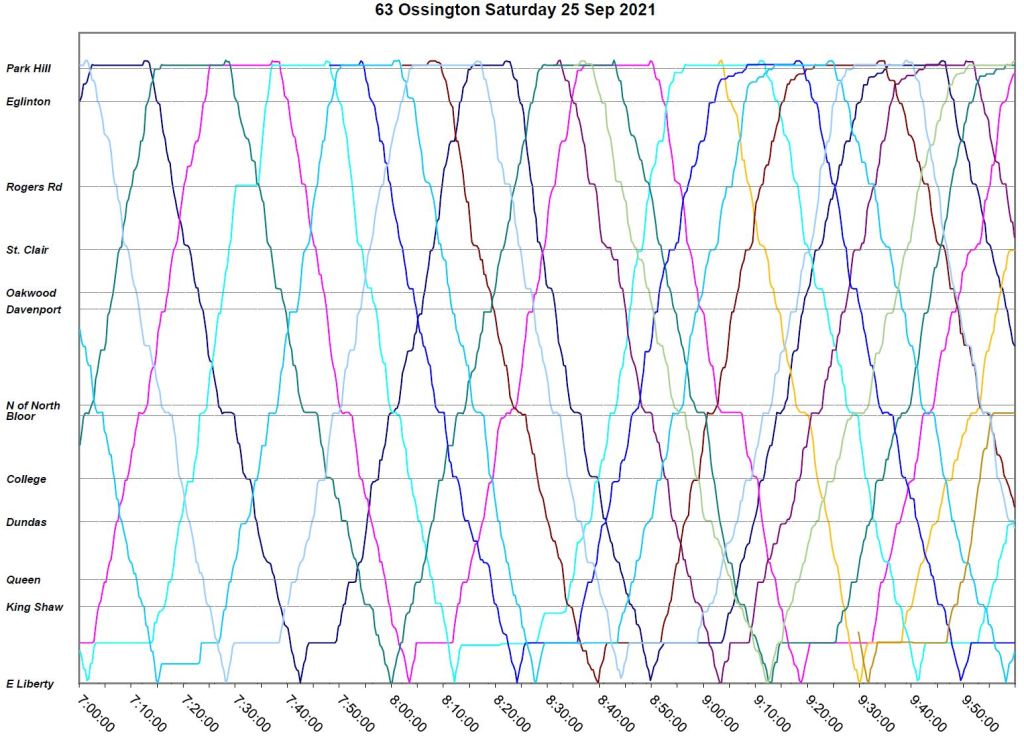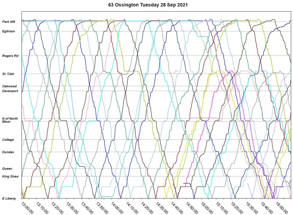 - During the evening, the service is generally well-behaved. Where pairs form, this usually arises from buses taking long layovers at Eglinton West or Ossington Stations.
