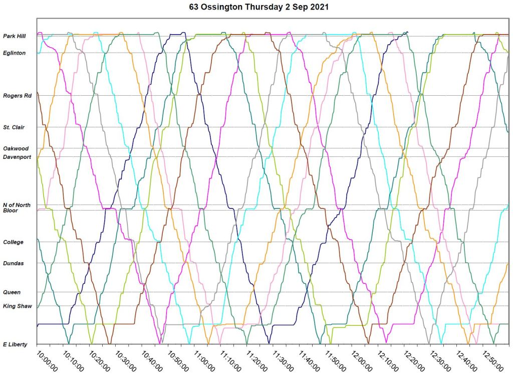 - Just after 8am, one bus (“dark green”) short turns at Bloor southbound and goes out of service. It is replaced by “dark blue” leaving south from Bloor at 9:45am