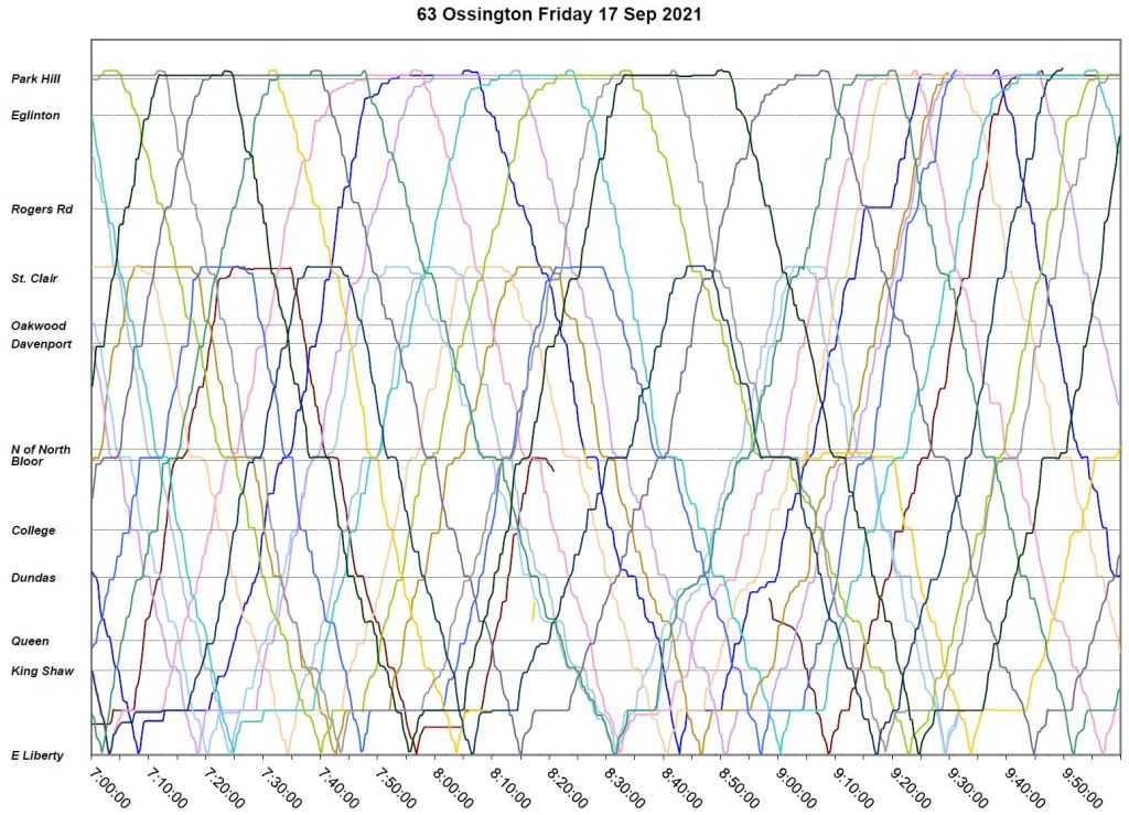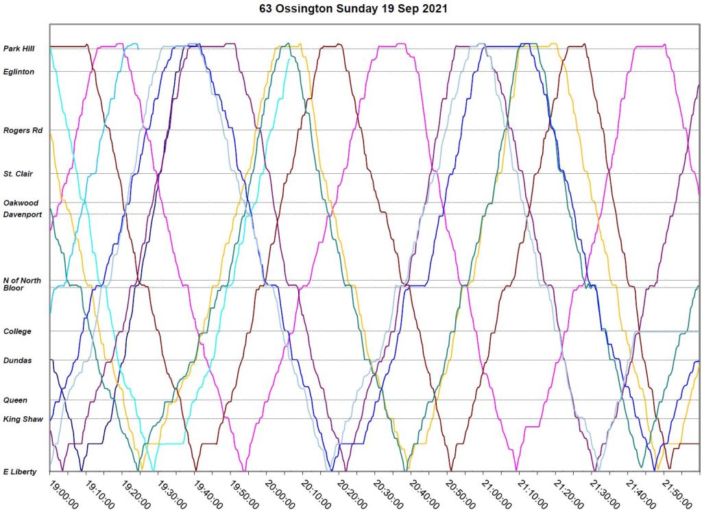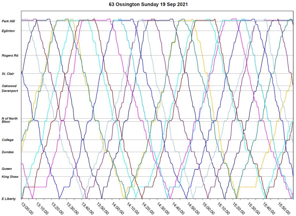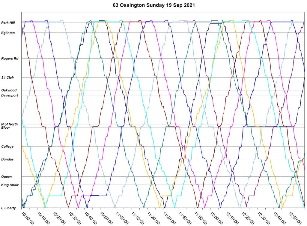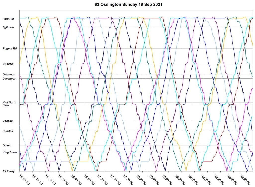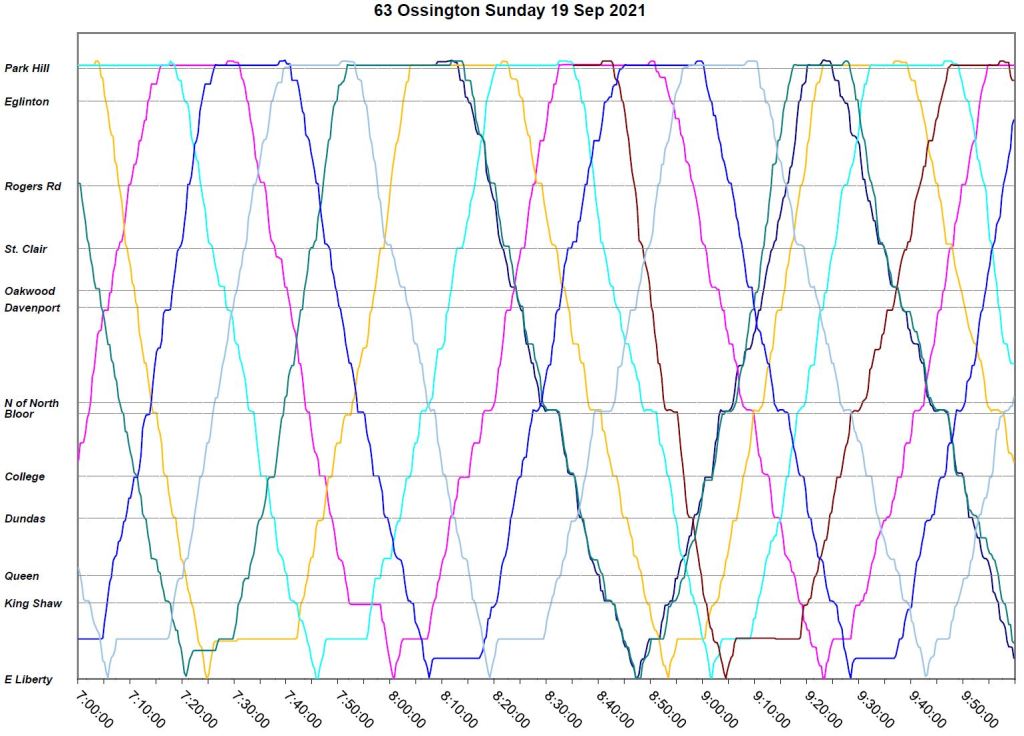 September 19 is a typical Sunday, and the primary problem on Ossington is buses running in pairs for extended periods with no apparent attempt by line management to separate them.