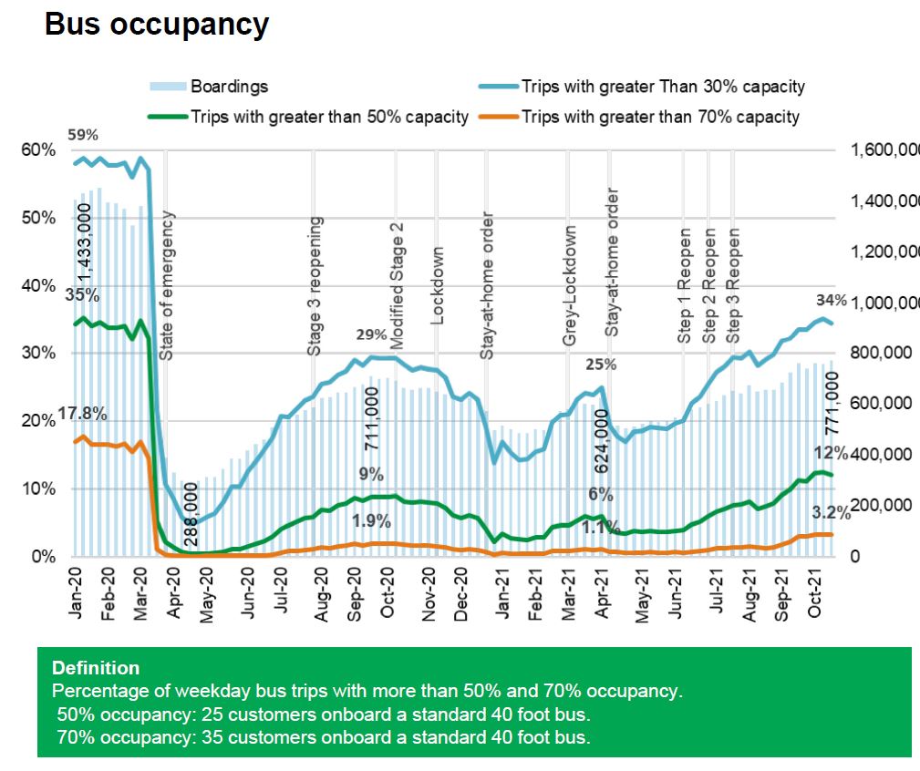 Bus occupancy has grown steadily over the year. An important point about the chart below is that it is measured trip-by-trip rather than being averaged over all trips on the system. What we do not know, however, is how many of these trips have high loads because the affected bus is running in a gap, and how many are because the service overall has less capacity than required for demand. Also, of course, we do not see the distribution of crowded trips by route or time-of-day.