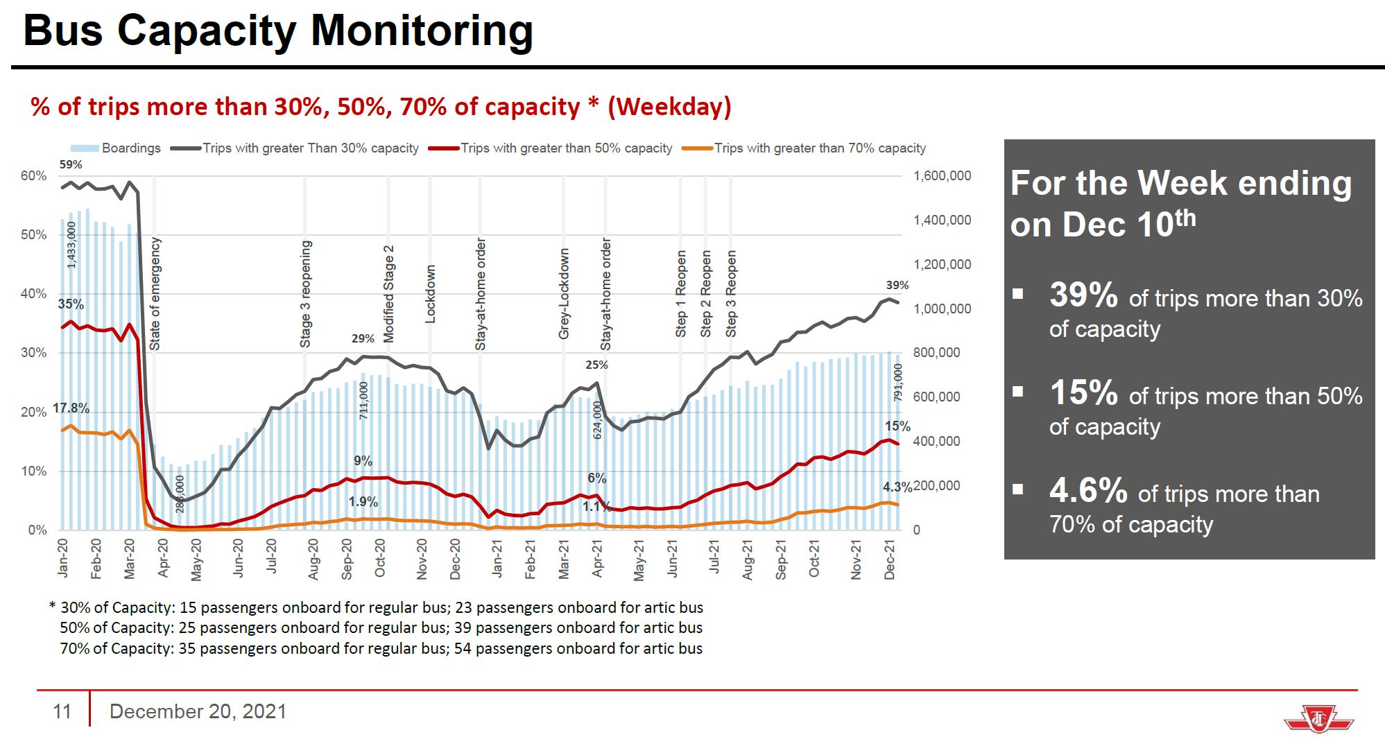 - Actual staffing makes it impossible for this to occur before Q2 2022 even though ridership is likely to hit the 50 per cent mark in Q1.