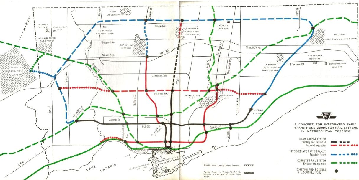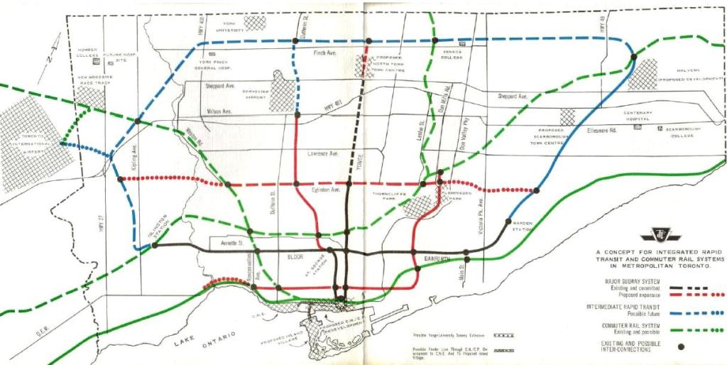 This is a plan the TTC published in the late 1960s. Notice how the suburban centres were “proposed” and did not actually exist yet. The idea was to build a network of LRT lines (using streetcars repurposed from the downtown system, and later by new cars).