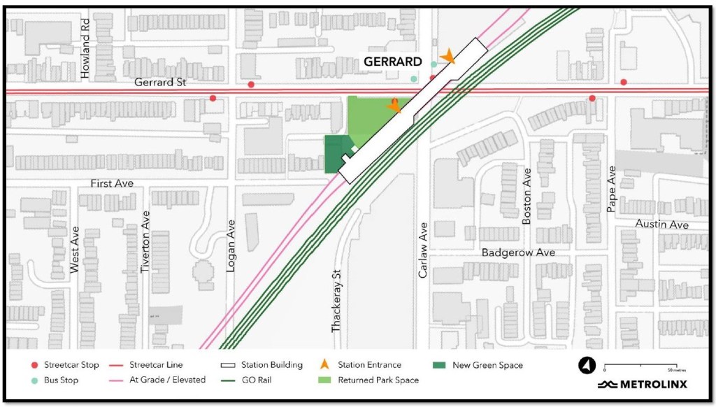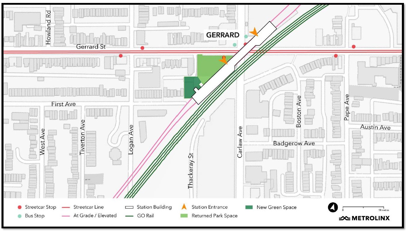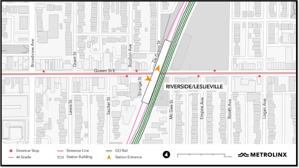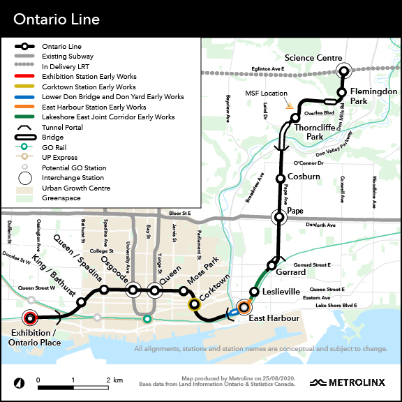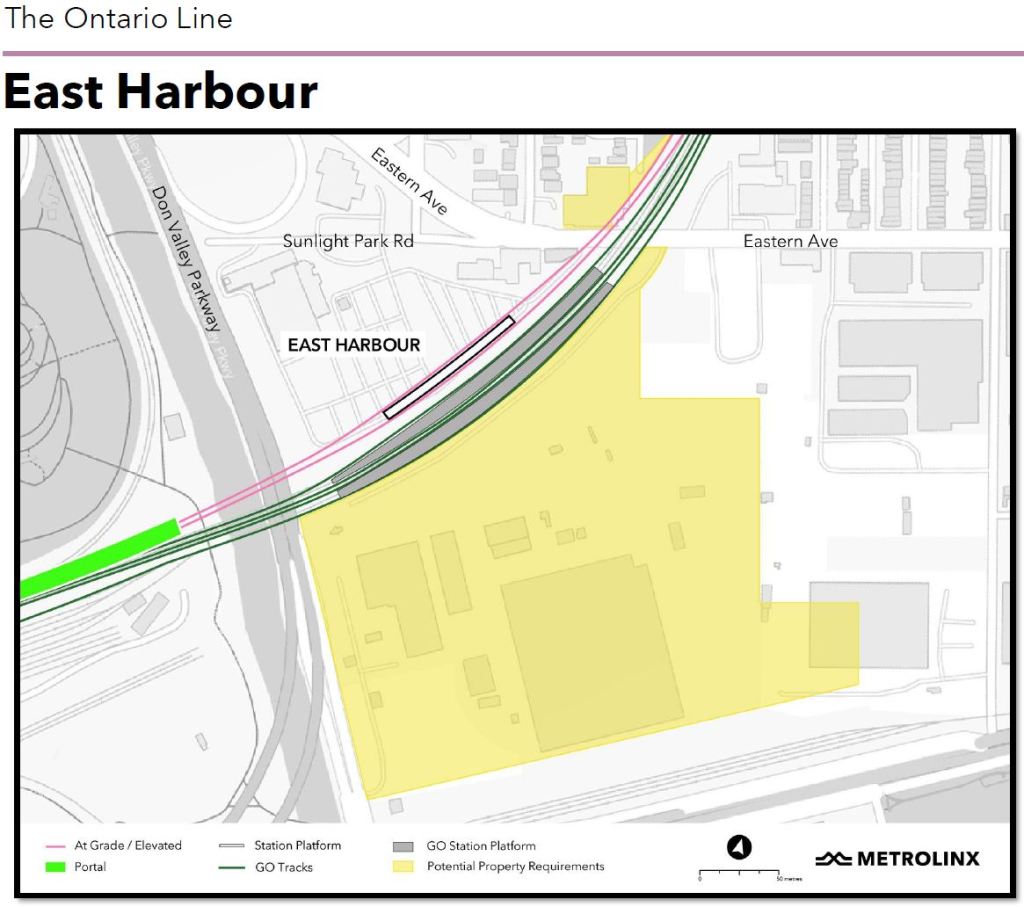 • East Harbour Transit Hub (orange): This will be a new major station including platforms for GO and the OL, as well as an interchange with the future Broadview Avenue extension and streetcar service connecting south into the eastern waterfront.