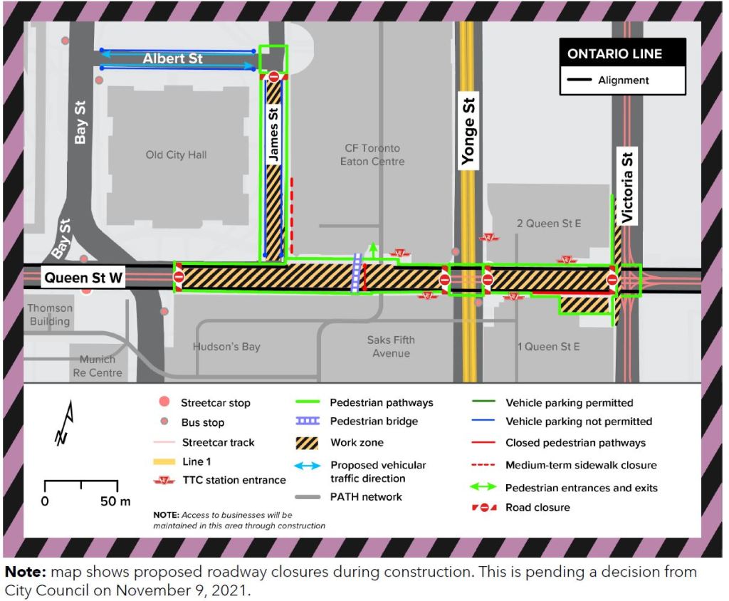 Queen/Yonge Station will be one of the largest single construction sites on the Ontario Line. It will be built with a deep excavation stretching from James Street on the west to Victoria Street on the east. Queen Street will be closed to traffic for over four years, from from May 1, 2023 to November 30, 2027, and streetcars will divert between Church and York Streets.