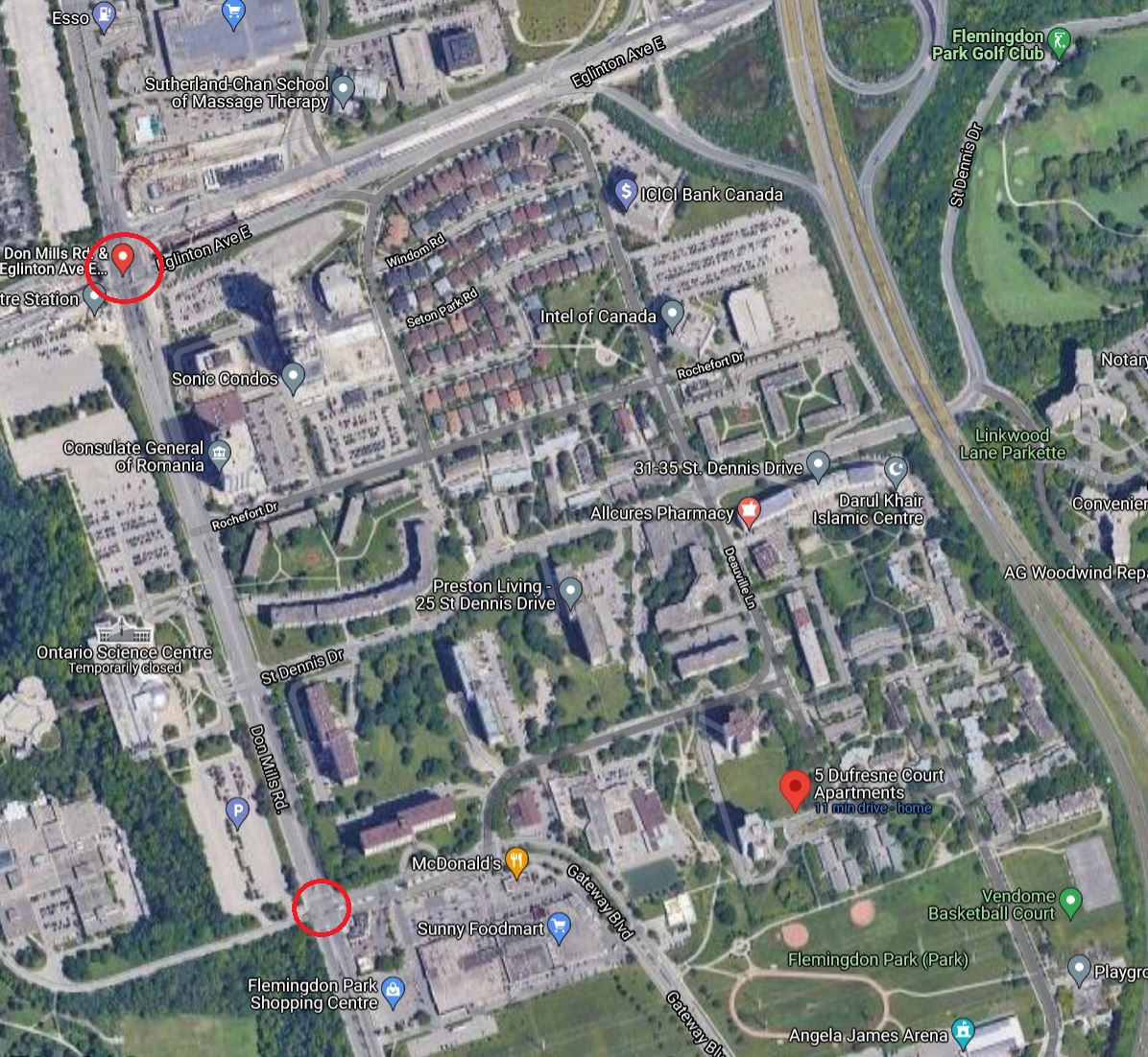 The photo shows the area between Don Mills and the DVP from Eglinton south to the Hydro corridor. Two thirds of this (the portion to Deauville Lane) is within 500m of either Science Centre and Flemingdon Park Stations (red circles). If we expand the reach to 800m, everything to the DVP is included.