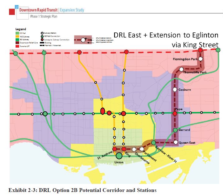 One version of the DRL from 2012 ran along King Street and north to Eglinton. It was subsequently shifted north to Queen. We can have a debate about which route would be better, but the point again is that the line went to Eglinton.