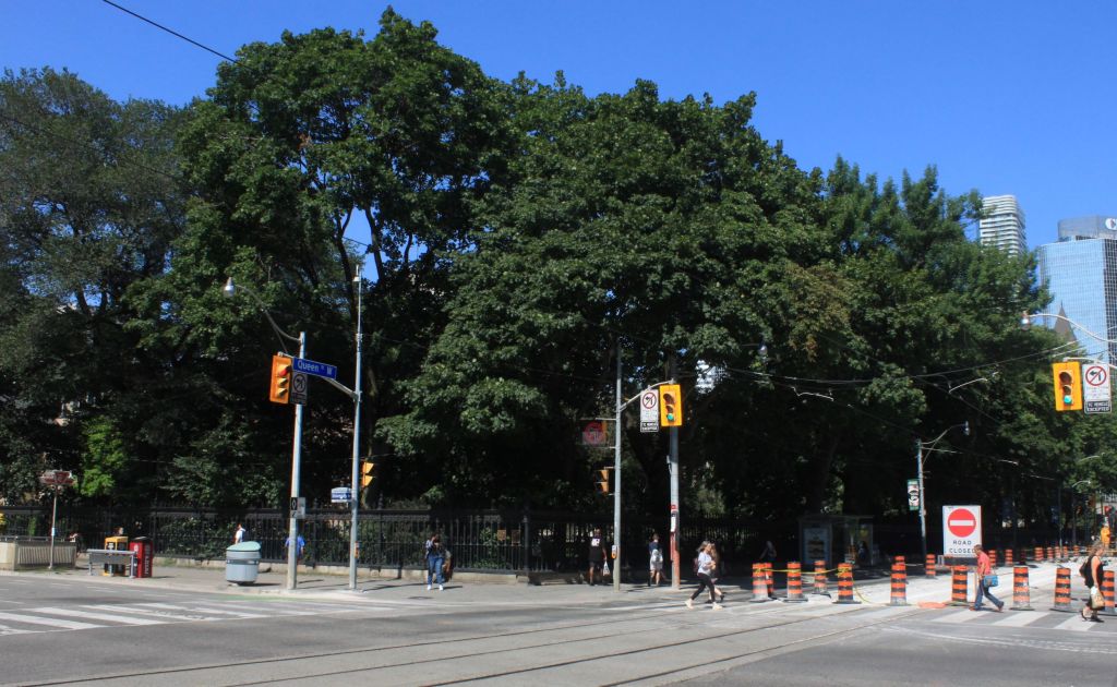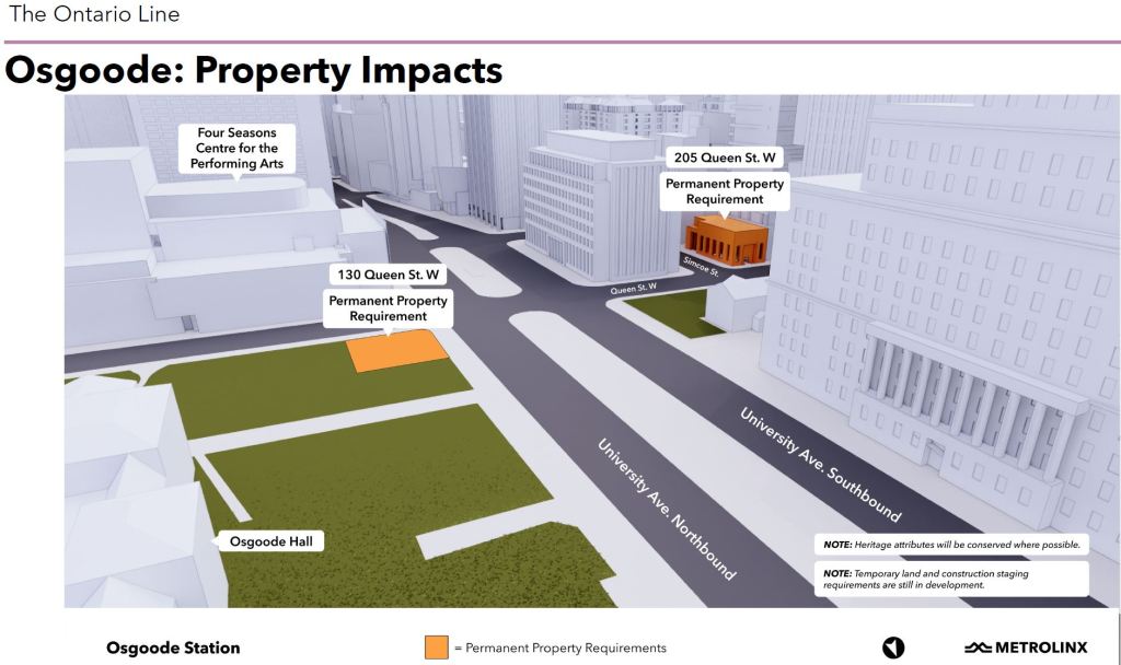 The design puts the station entrance in conflict with the park at Osgoode Hall, and there has, strangely, been almost no public comment about this. Lands west of the Hall and north of Queen will be used as a material staging area.
