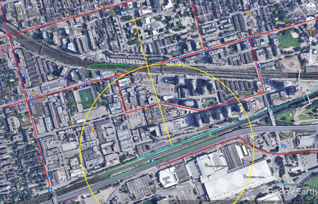 The yellow circle marks a 500m radius from the station. The orange line extending further north shows the extent of an 800m radius, the “rapid transit” definition for an MTSA. Two issues are evident: (1) much of the developed area is outside of the 500m radius because the station is at the edge, not the centre of the development, (2) half of the circle lies south of the corridor where nobody lives. TTC services, and another GO station, will compete for riders.