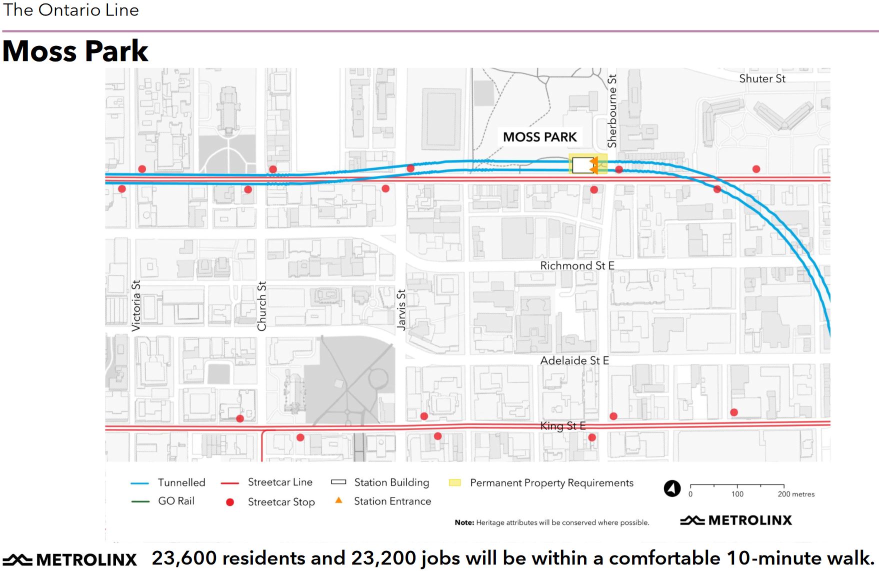 Osgoode is an interchange station with the University Subway, but unlike the proposed connection at Yonge (about which more in a bit), current plans call for the OL station to be built under the existing line by mining from either side, not by excavating the entire street. The two access points will be on the southwest corner of Queen and Simcoe, and the northeast corner at University.