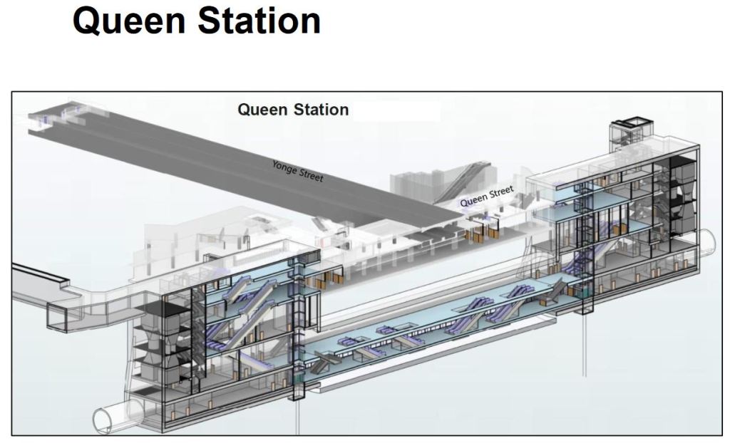 In the cross-section view, the large open block in the centre of the drawing appears as open space, but it is an unexcavated section in bedrock. This will support the existing subway structure while the OL is tunnelled under it. Just above that block is the existing underpass between the northbound and southbound platforms at Queen Station. This was a fragment “prebuilt” for a Queen Street subway 70 years ago, and it will become part of the upper concourse level of the new station.