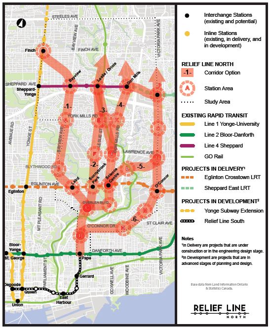This is the map Metrolinx typically displays when they want to talk about how much more rapid transit their proposal yields compared to the Relief Line. It perpetuates a Metrolinx Myth that the northern extension is their brain child, when in fact a line to Don Mills and Eglinton or beyond has been part of transit plans for over half a century.