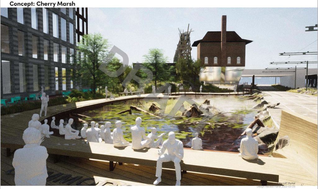 As described in the June 2021 update, the link from the existing Cherry Street trackage under the rail corridor to New Cherry Street will be made through a new tunnel through the rail berm east of the existing Cherry Street underpass. However, the original plans for the area involved a small forest of, yes, cherry trees and this has proved impractical. The water table is very high and the underpass is a low point in the surrounding terrain. Any high water event would flood the area.
