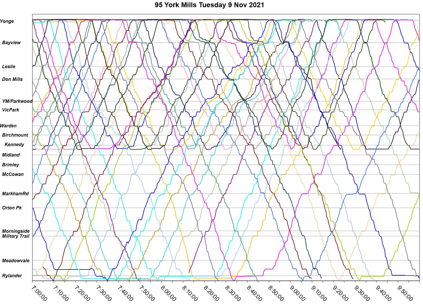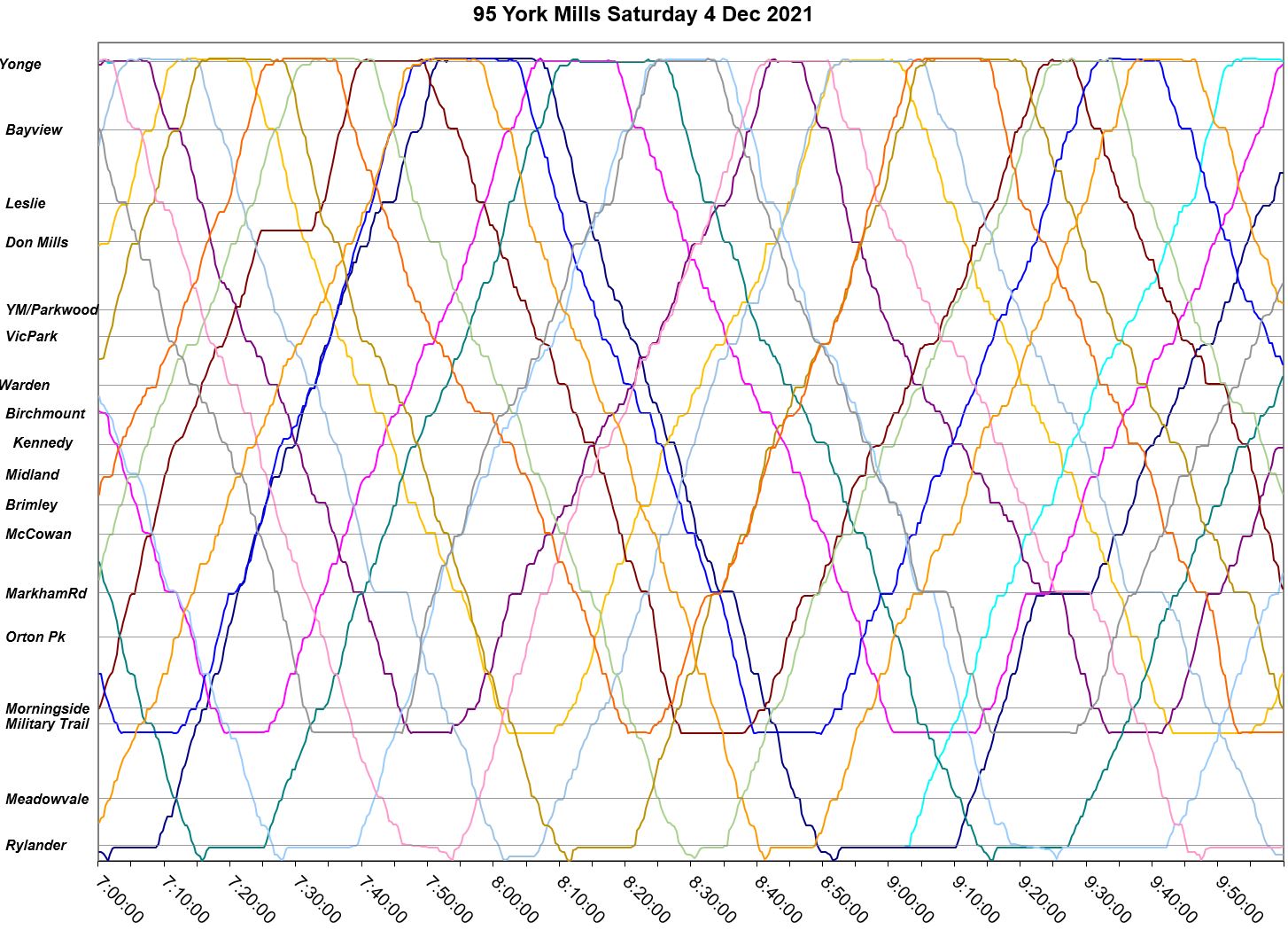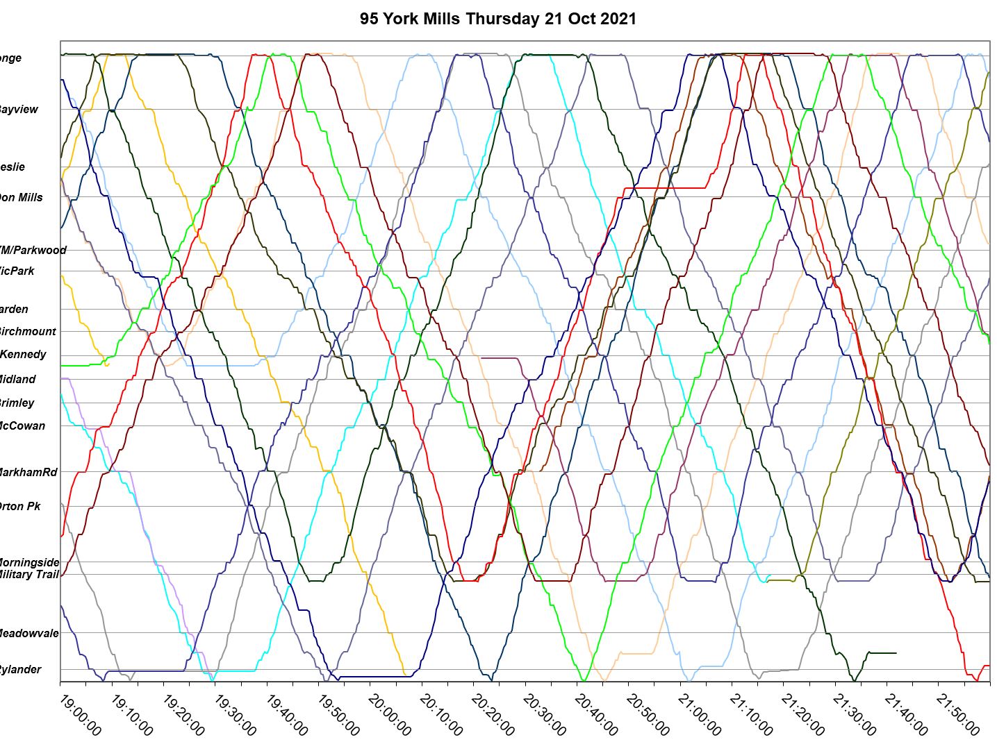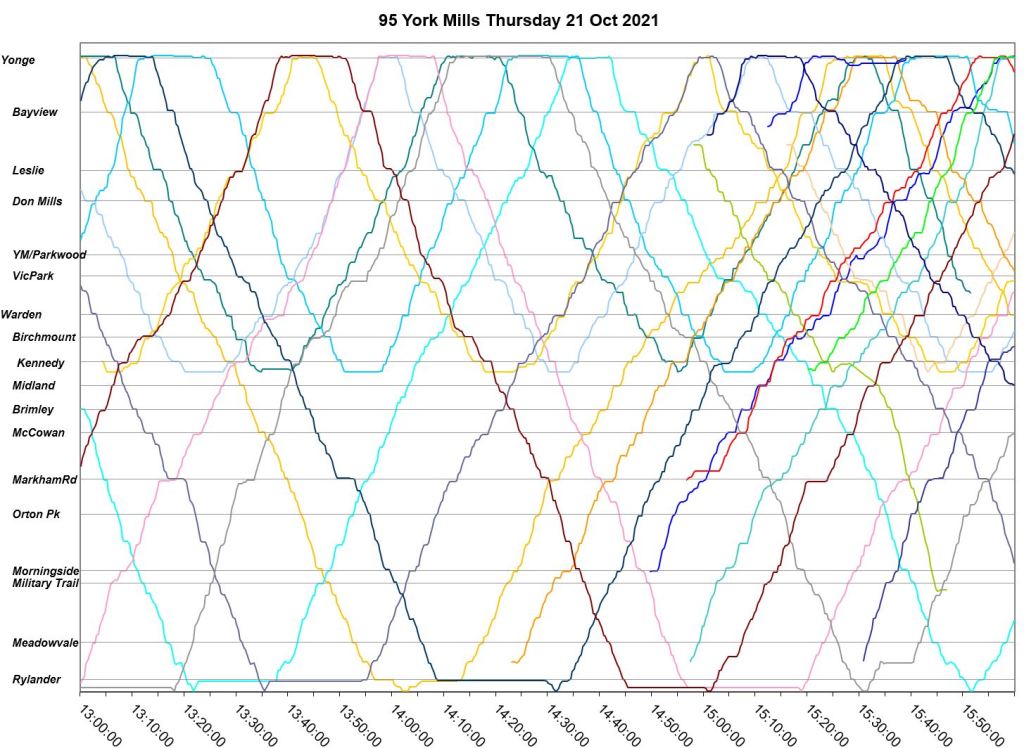 Steve: Not specifically other than neglect. This sort of uneven headway is seen on many routes, but 95 York Mills headways are wide enough that the scatter leaves some nasty gaps.