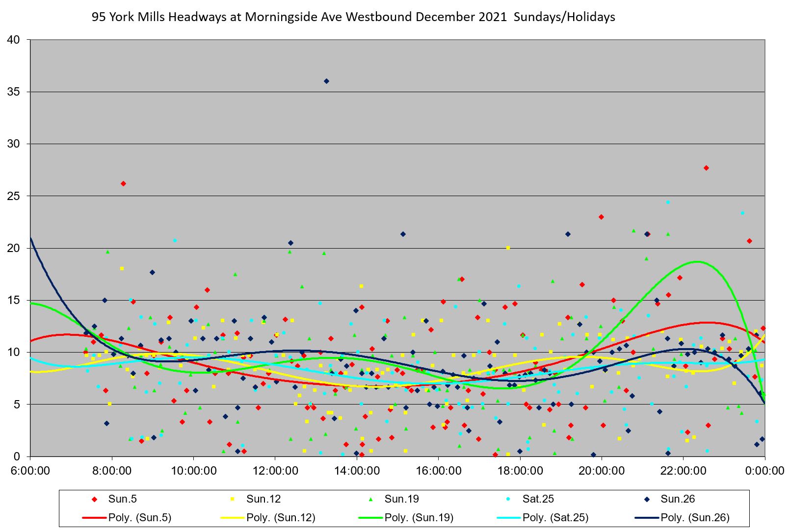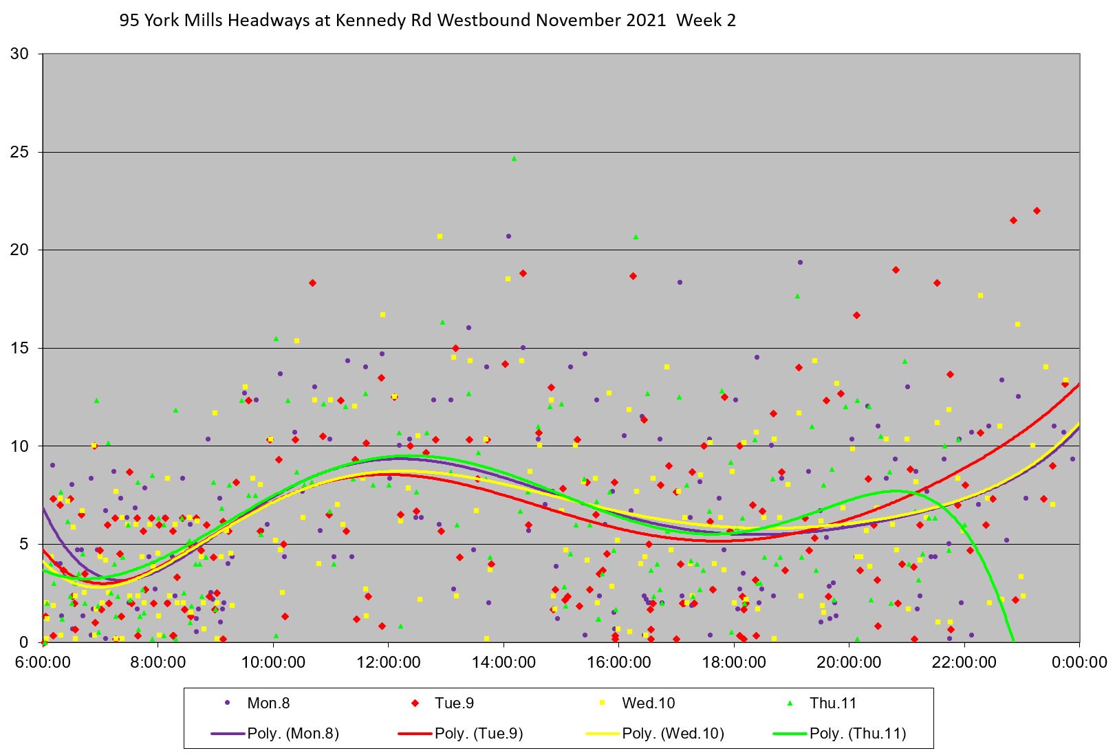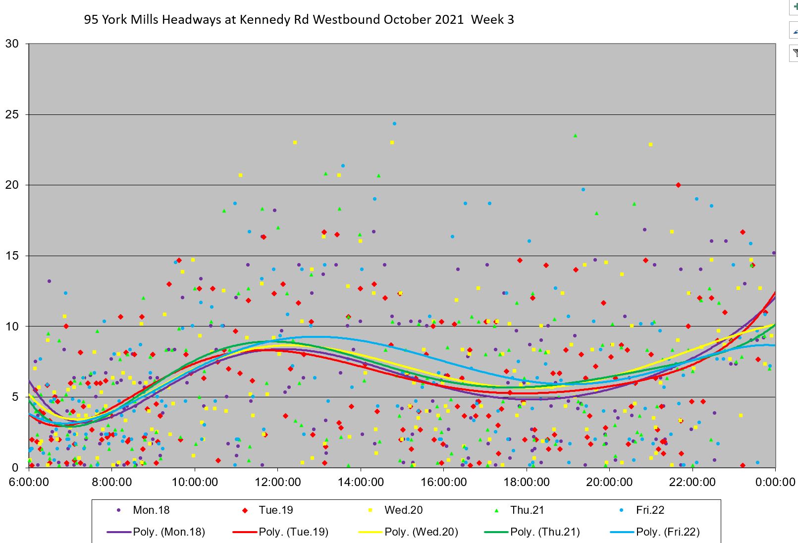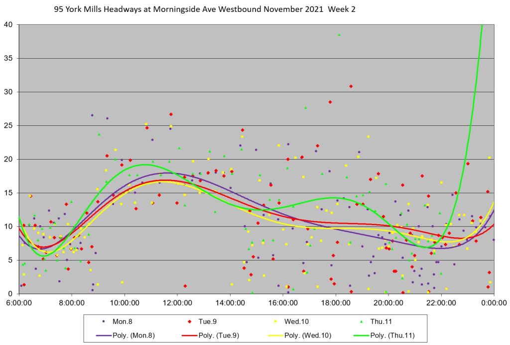 Steve: Not specifically other than neglect. This sort of uneven headway is seen on many routes, but 95 York Mills headways are wide enough that the scatter leaves some nasty gaps.