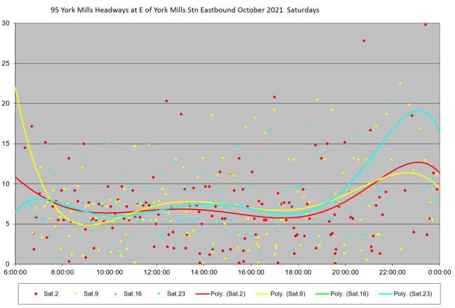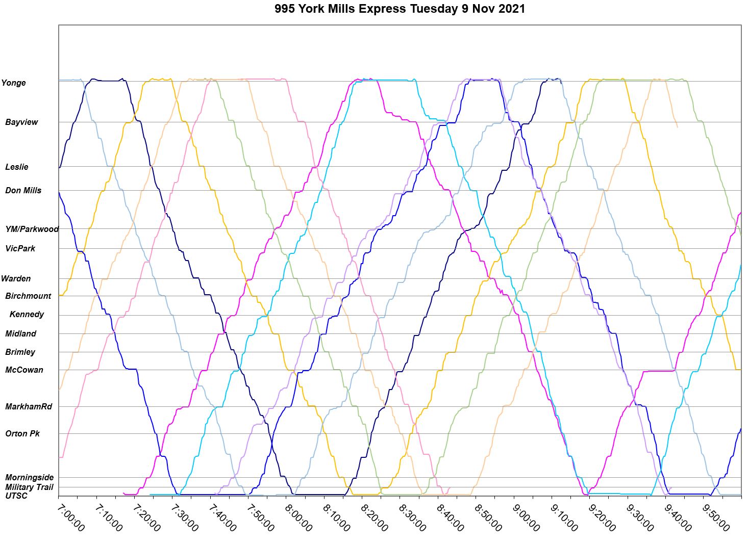 Here is a typical weekend day. Service on the branches often runs in pairs if not triplets, and some of these echo back eastbound after arriving together westbound at York Mills Station. Riders see gaps followed by a pair (or worse) of buses.
