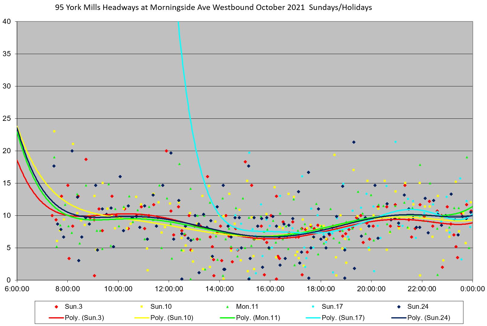 On weekends, the 95B local service operates to UTSC during most periods, and the headway at Morningside westbound is for a supposedly blended service. In fact there are many headways close to zero and a corresponding number well above the trend line. This indicates that many 95A and 95B buses operate together as pairs westbound from the point where they merge at Military Trail.