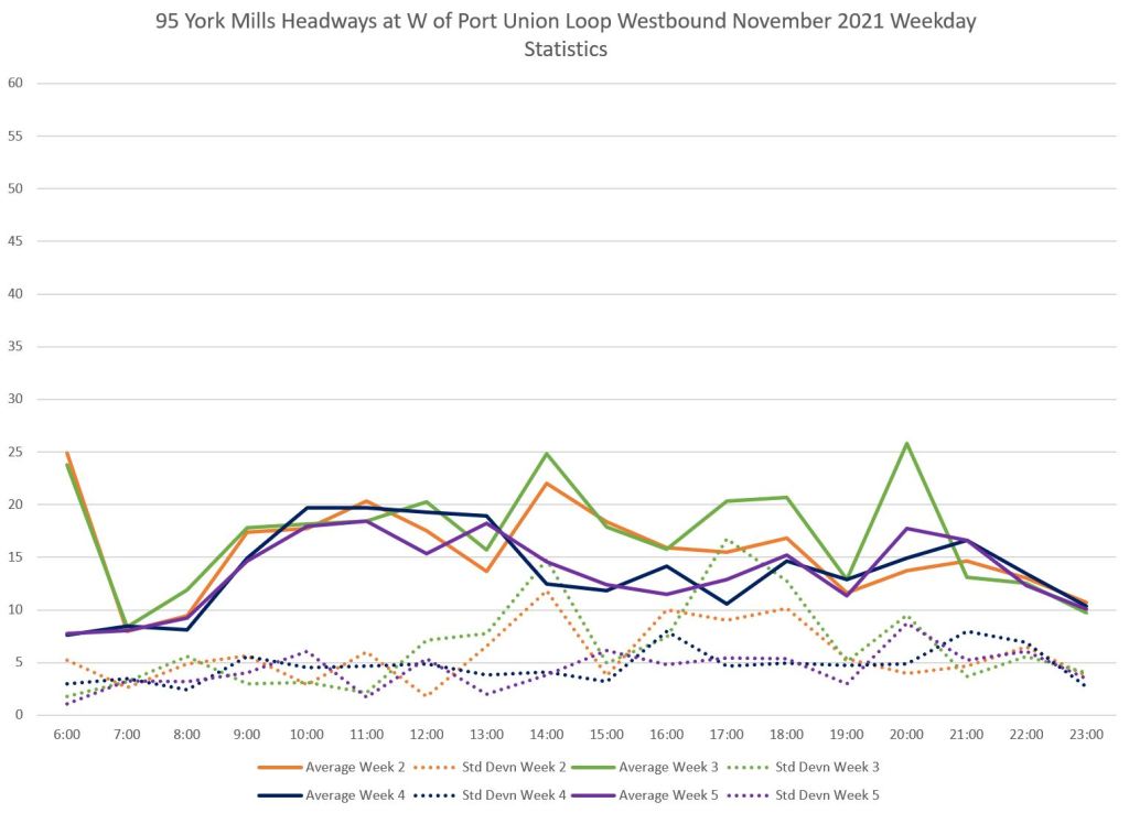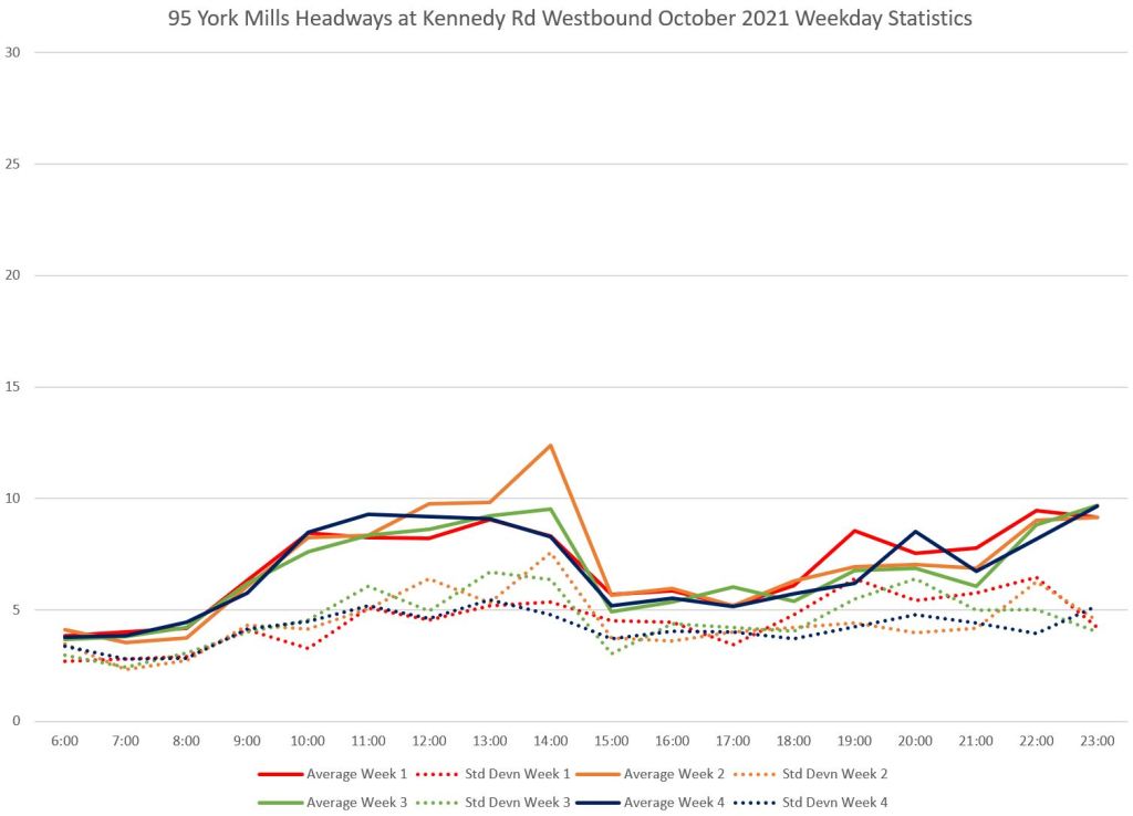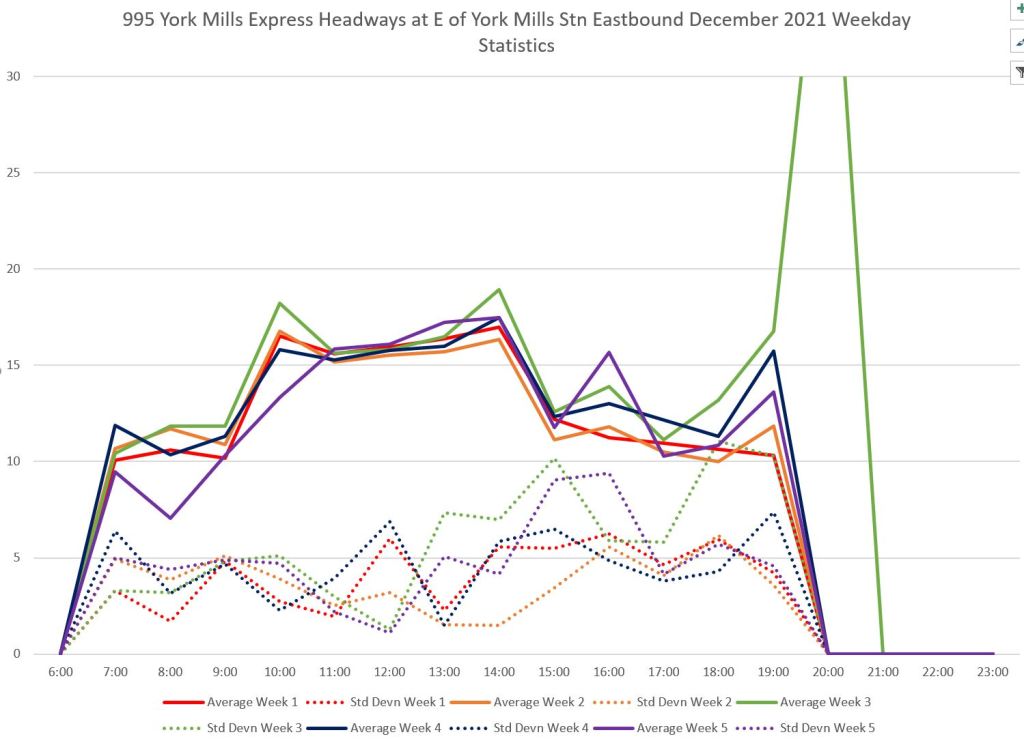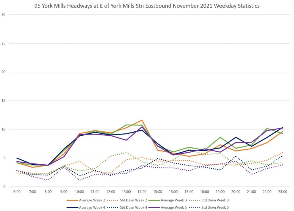 The service eastbound from York Mills Station displays common statistics on a week-by-week basis over the three month period. Items of note:
