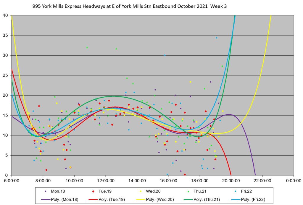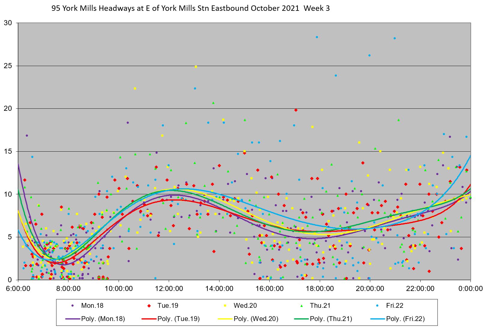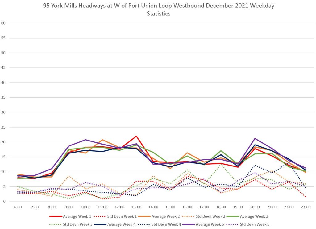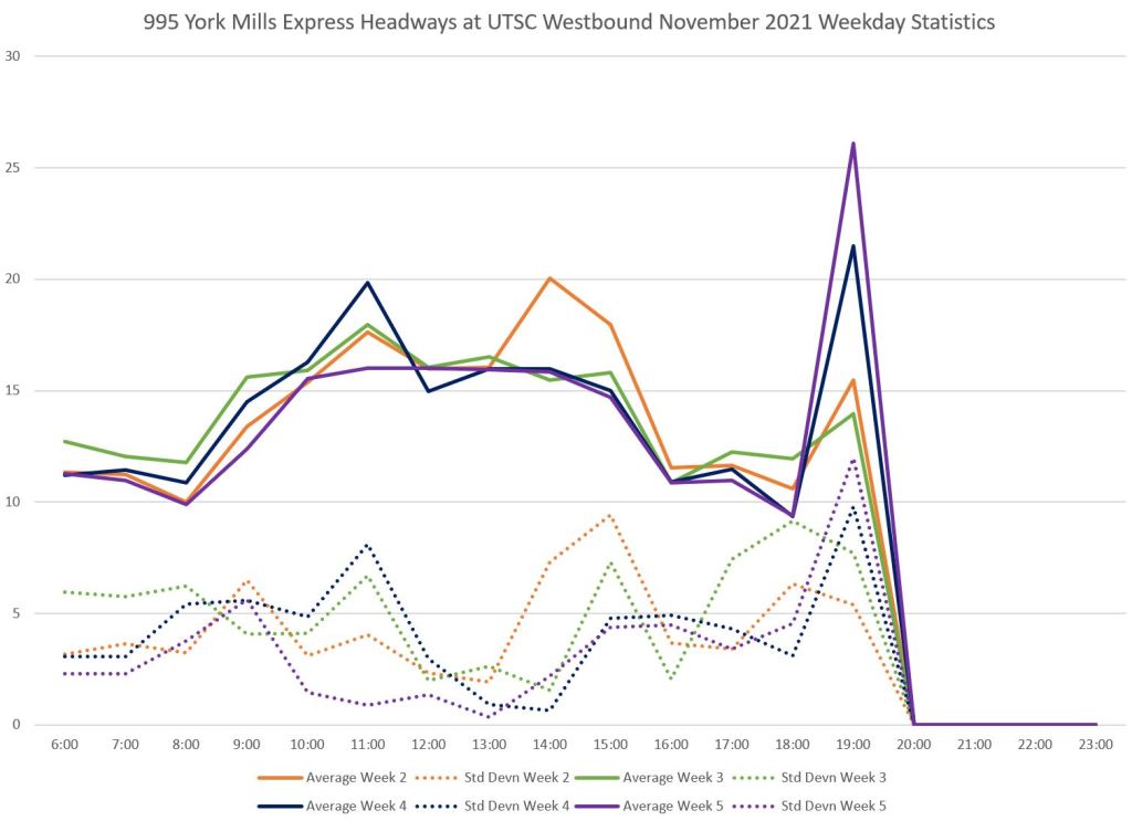 The service eastbound from York Mills Station displays common statistics on a week-by-week basis over the three month period. Items of note: