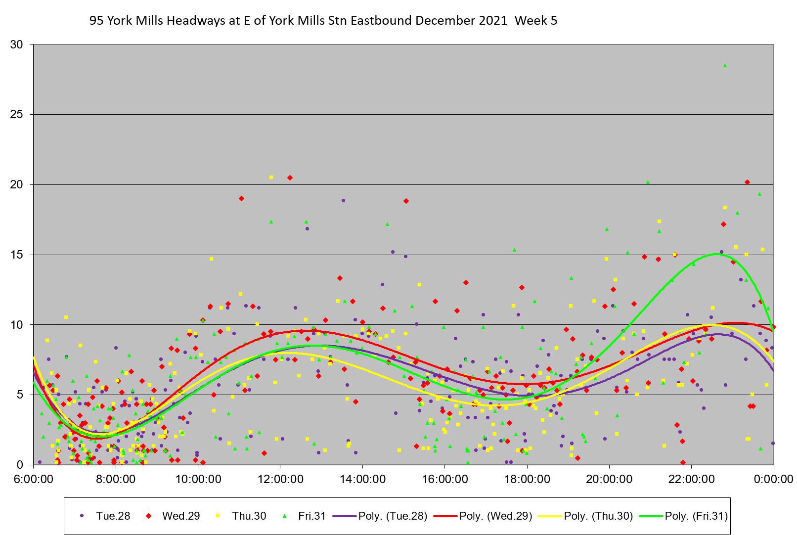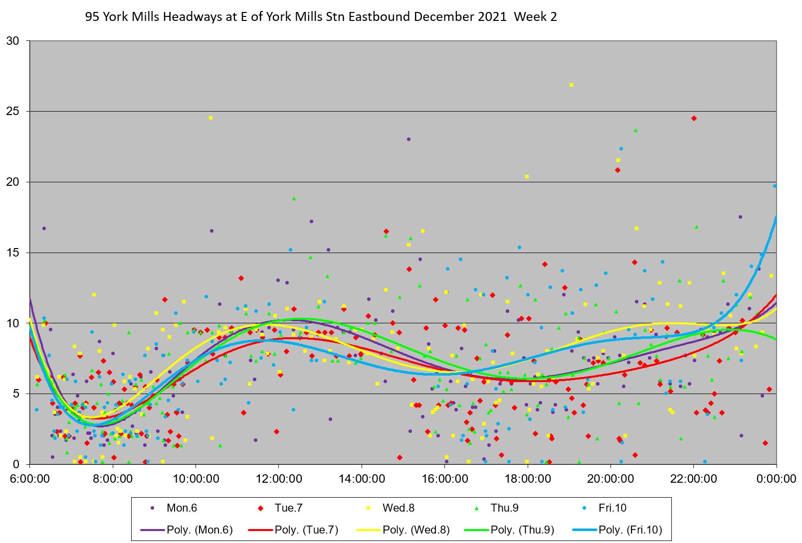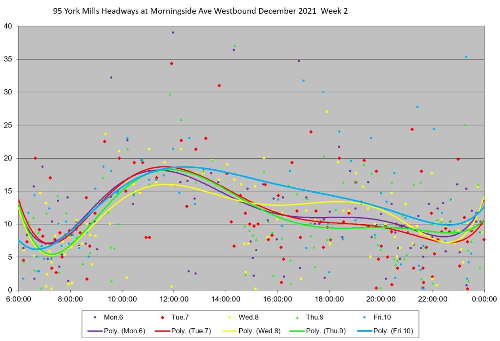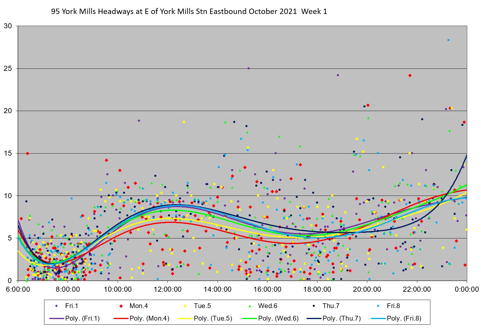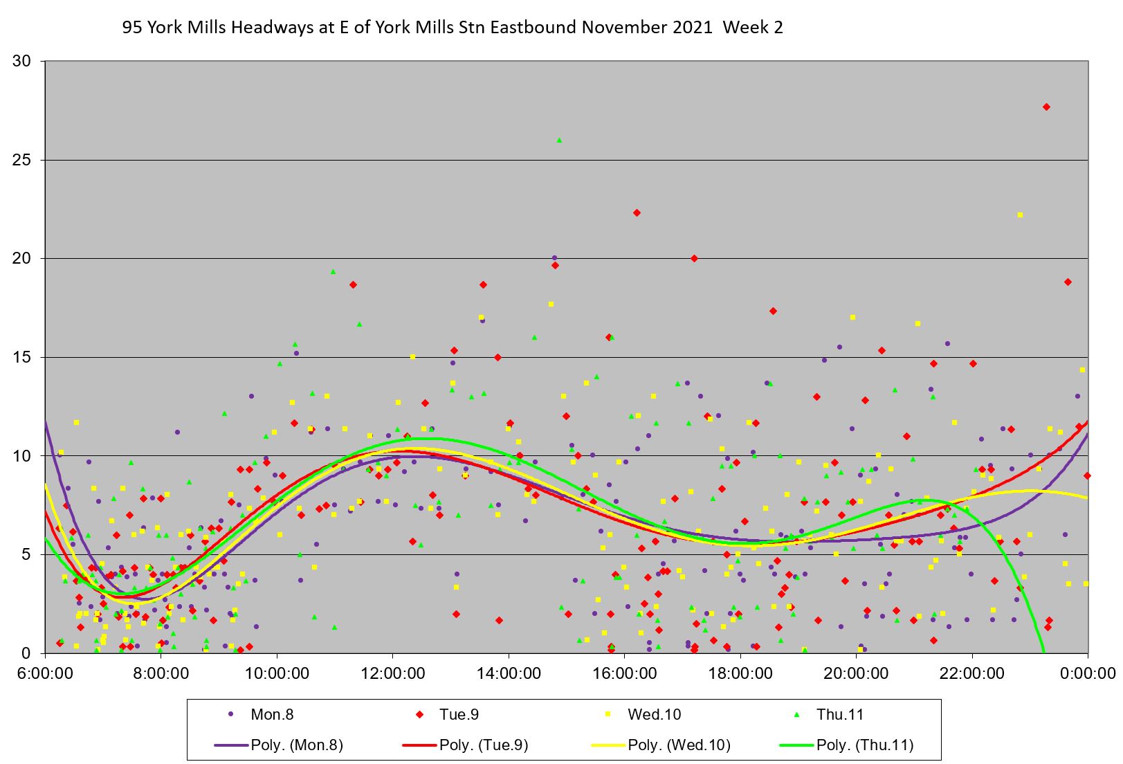 The screenline for measuring these headways is located on York Mills Road east of the station.