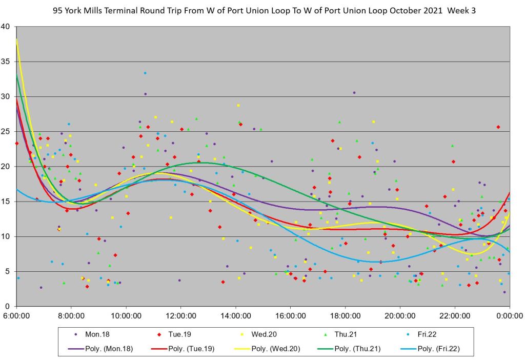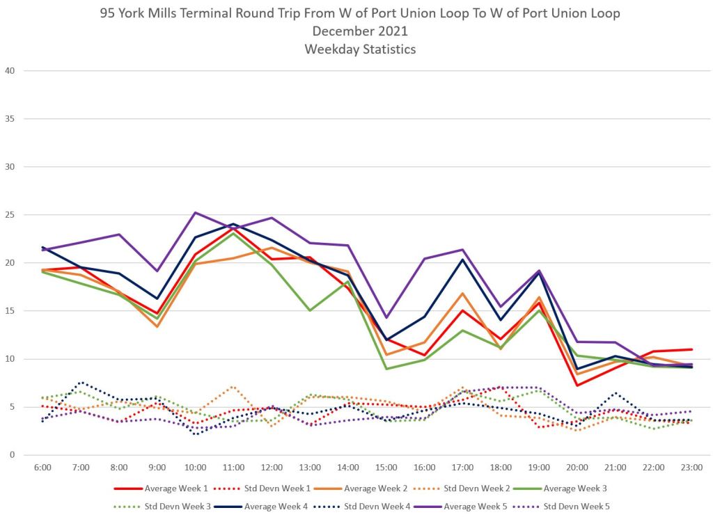 Since mid-October, services that formerly used York Mills Station Loop now travel to the parking lot on the northwest corner of Yonge & Wilson which is a temporary terminal. The round trip times shown here are measured from at screenline east of the exit from York Mills Station Loop.