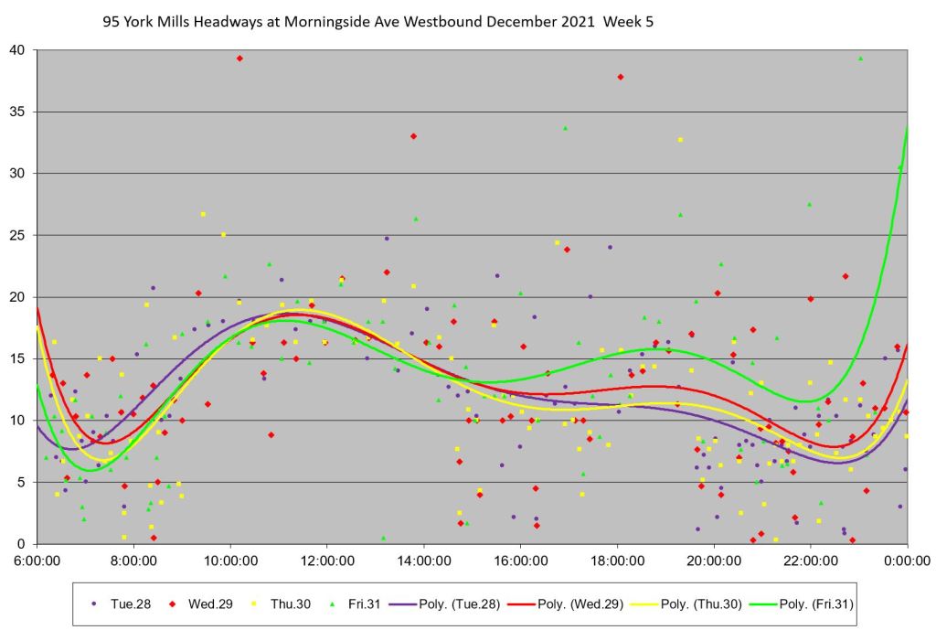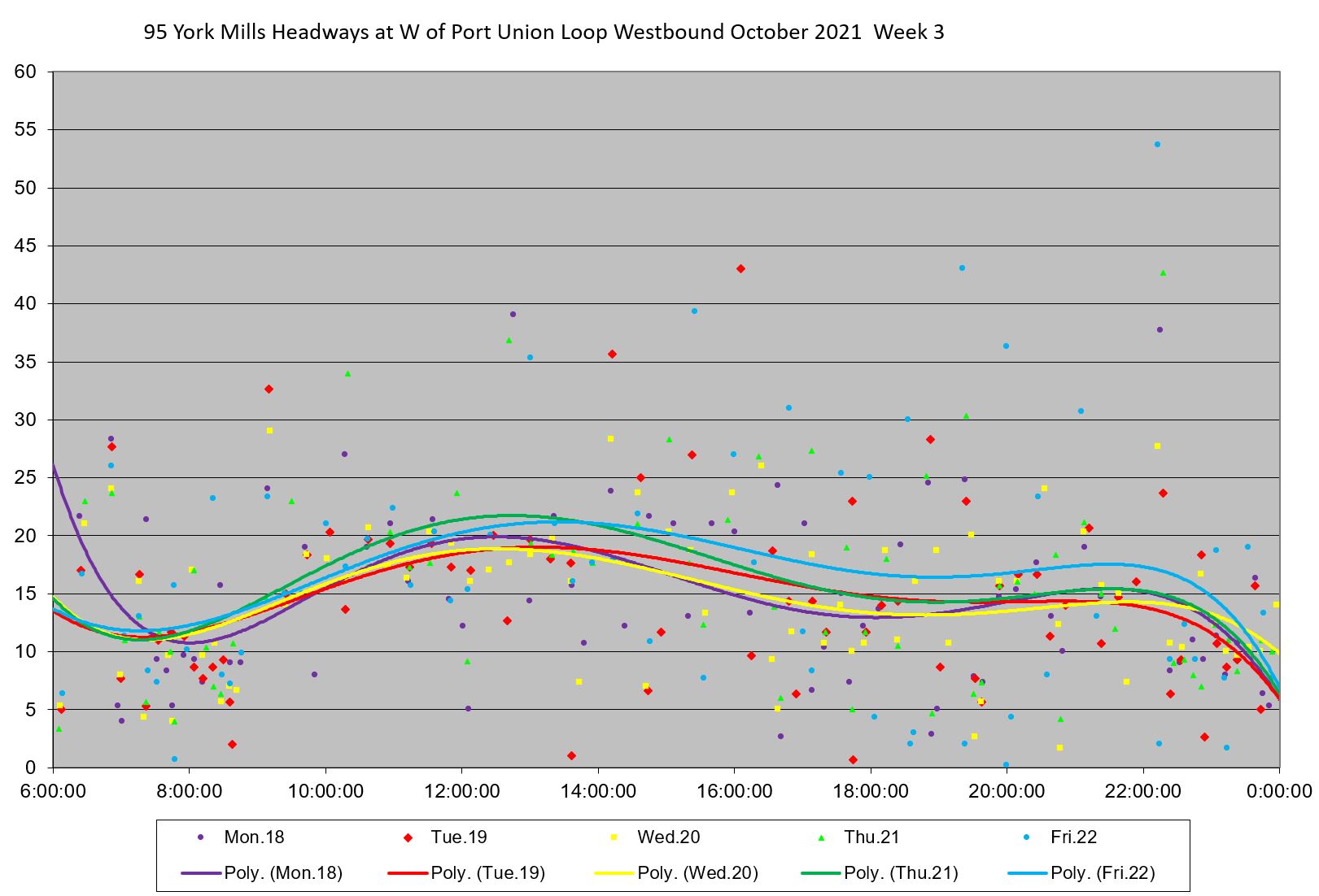 Selected weeks show the degree of bunching (very low headway values with offsetting data points at or above 20 minutes). During the daytime including the peaks these reflect bunching that originates further east on the route as shown in the Port Union charts above. During the early evening, the “blended” service isn’t, and late in the evening headways from Port Union are erratic contributing to uneven service further west on the route.