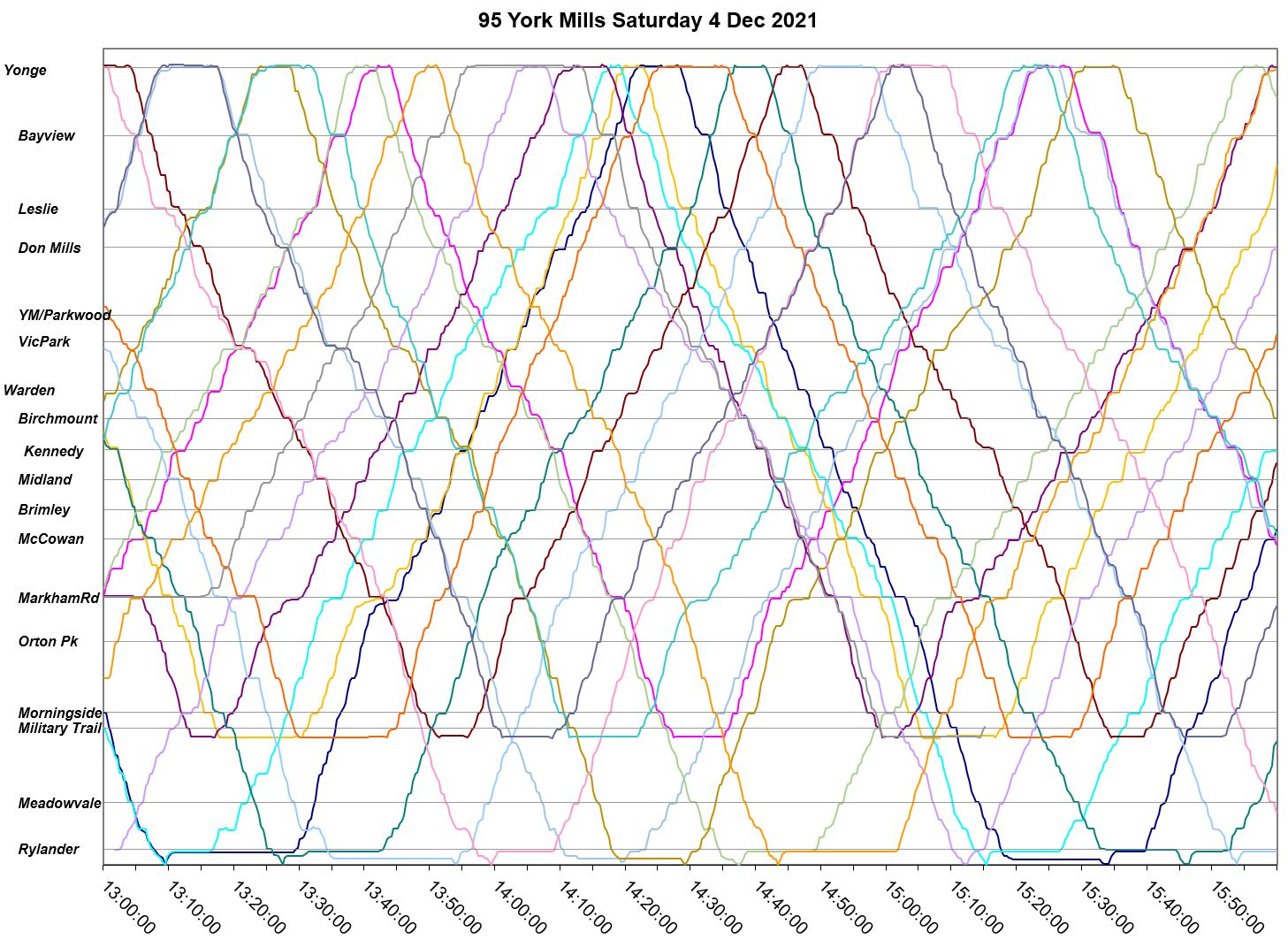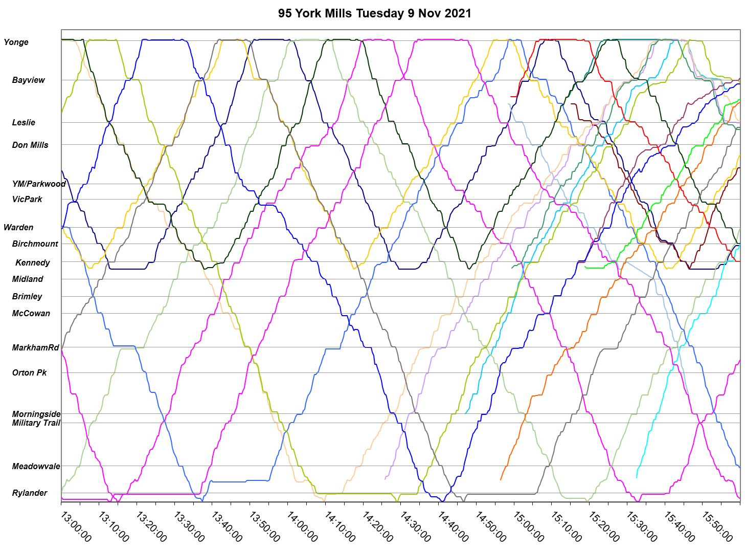 - The 95C Ellesmere Station short turns are clearly visible through to early evening turning back at about the midpoint of the charts. A common situation is that a 95C short turn will travel together with a 95A from Port Union as a pair westbound making a headway much wider than the advertised blended service.
