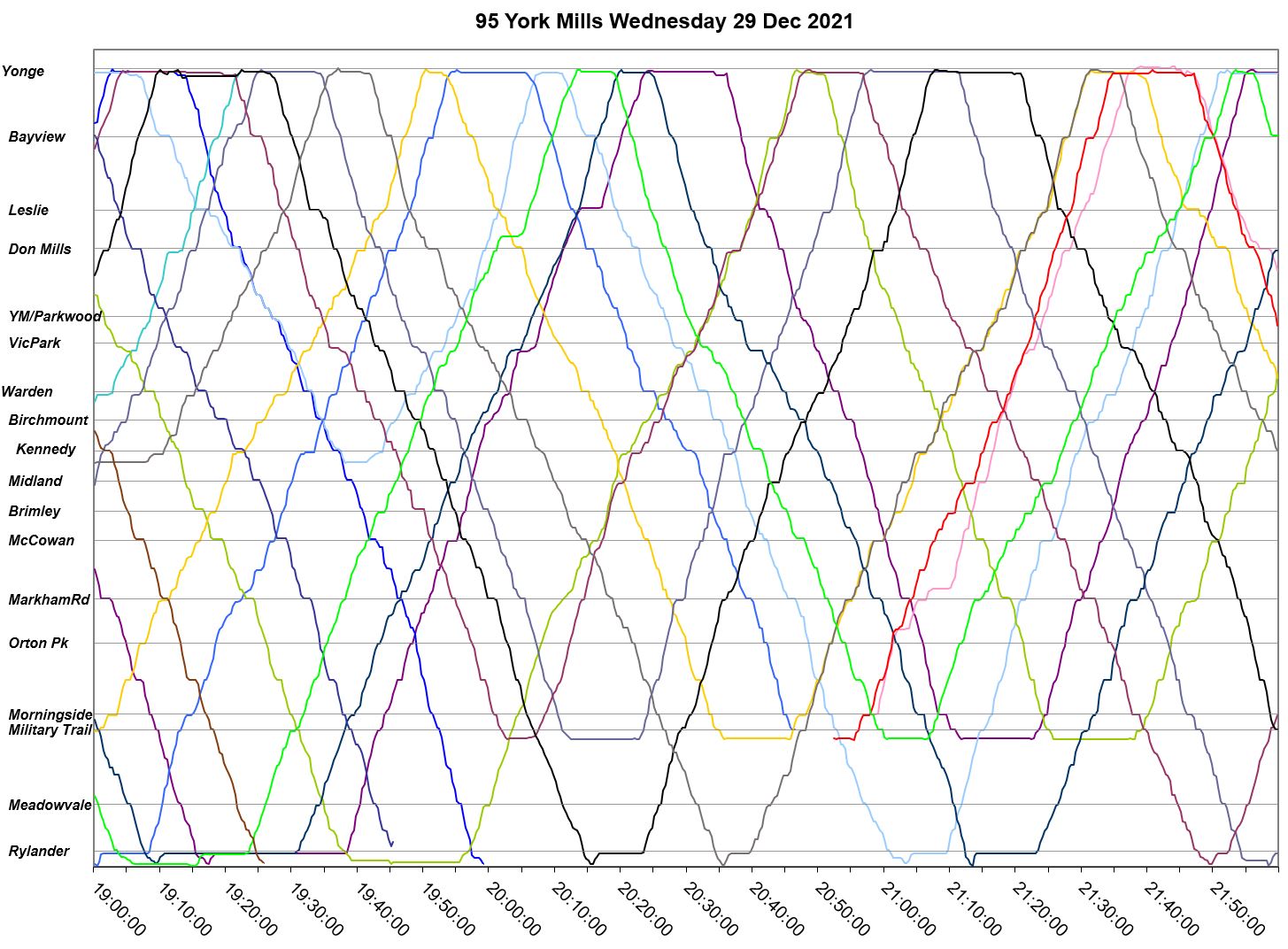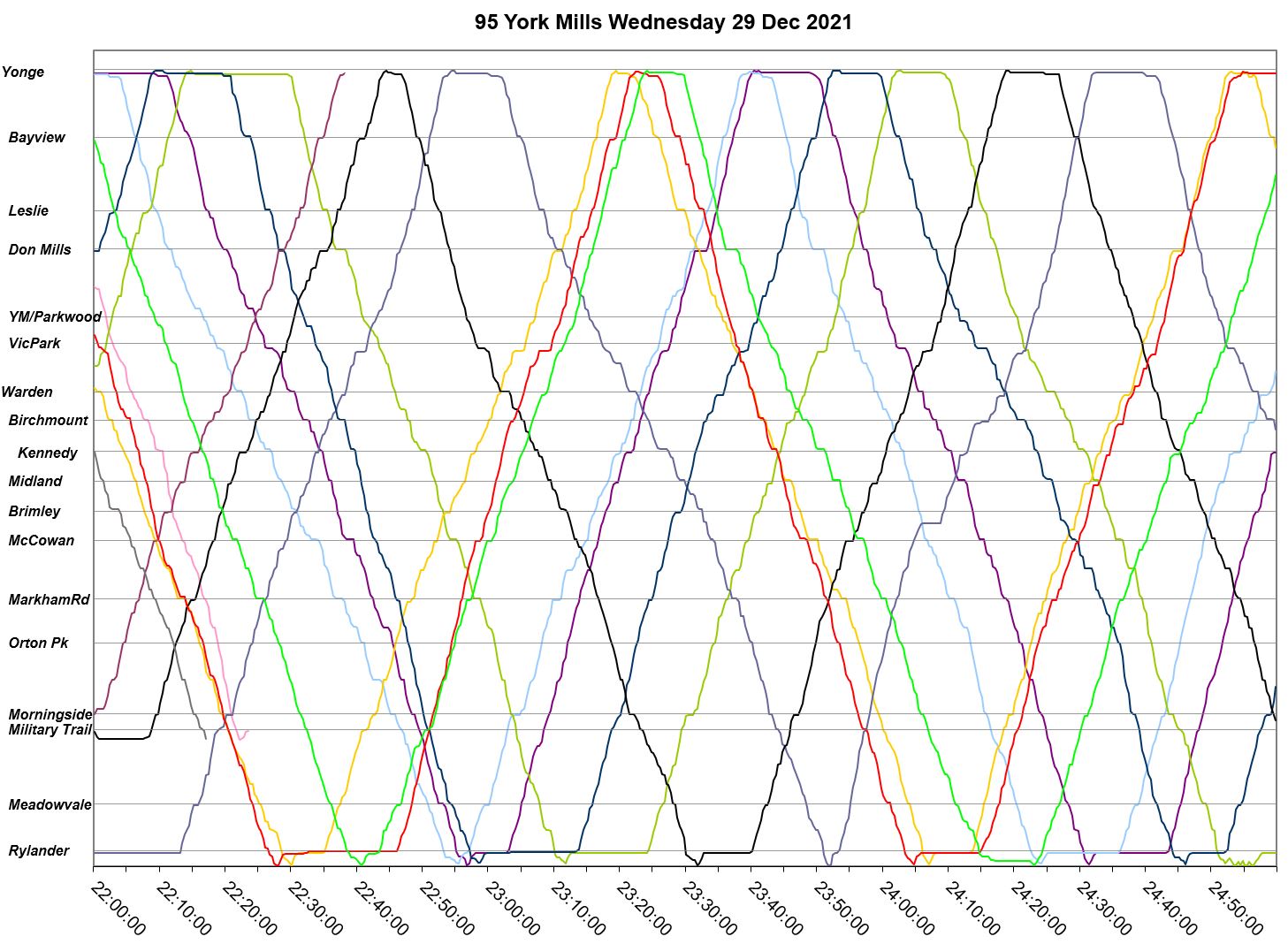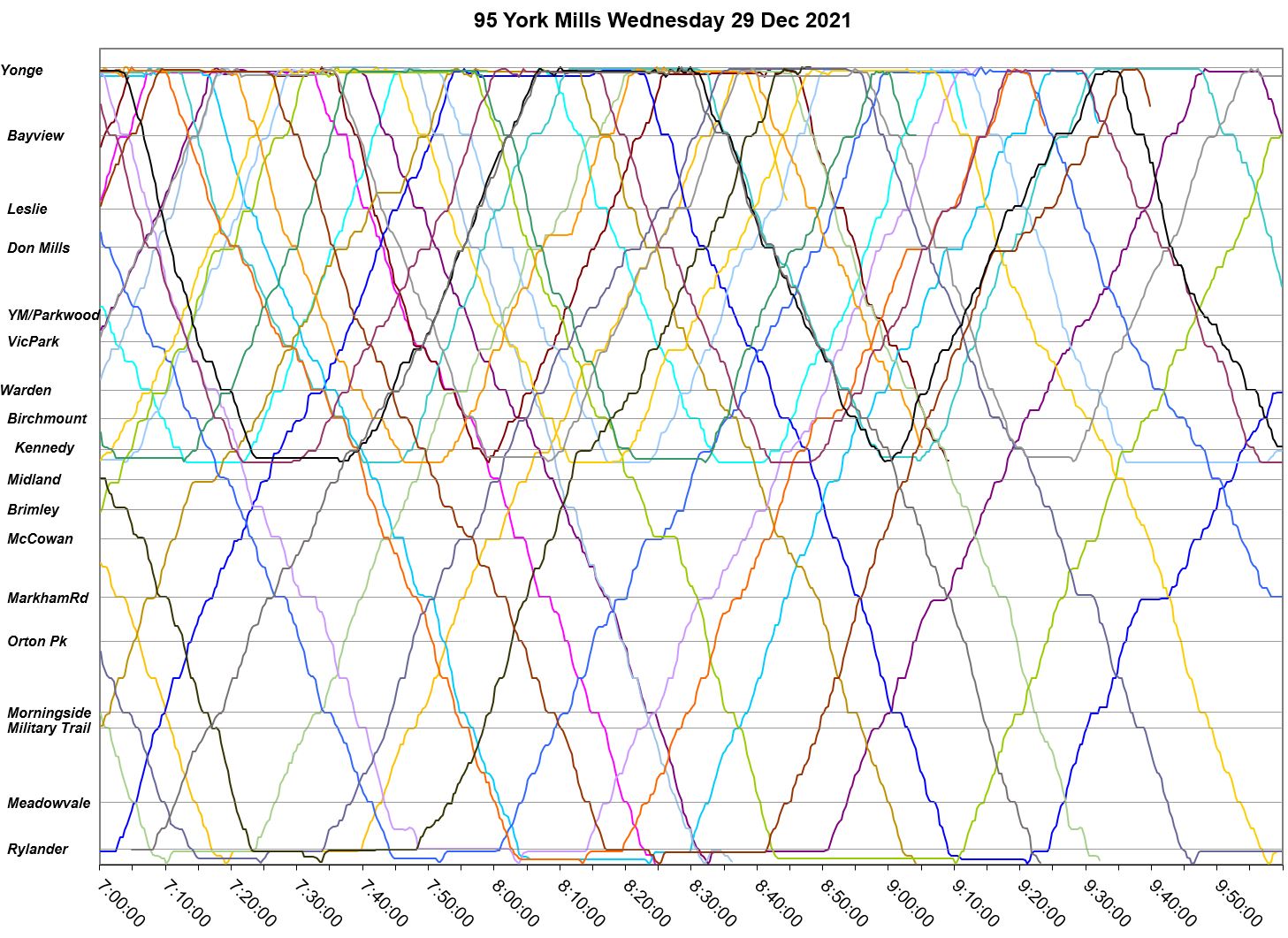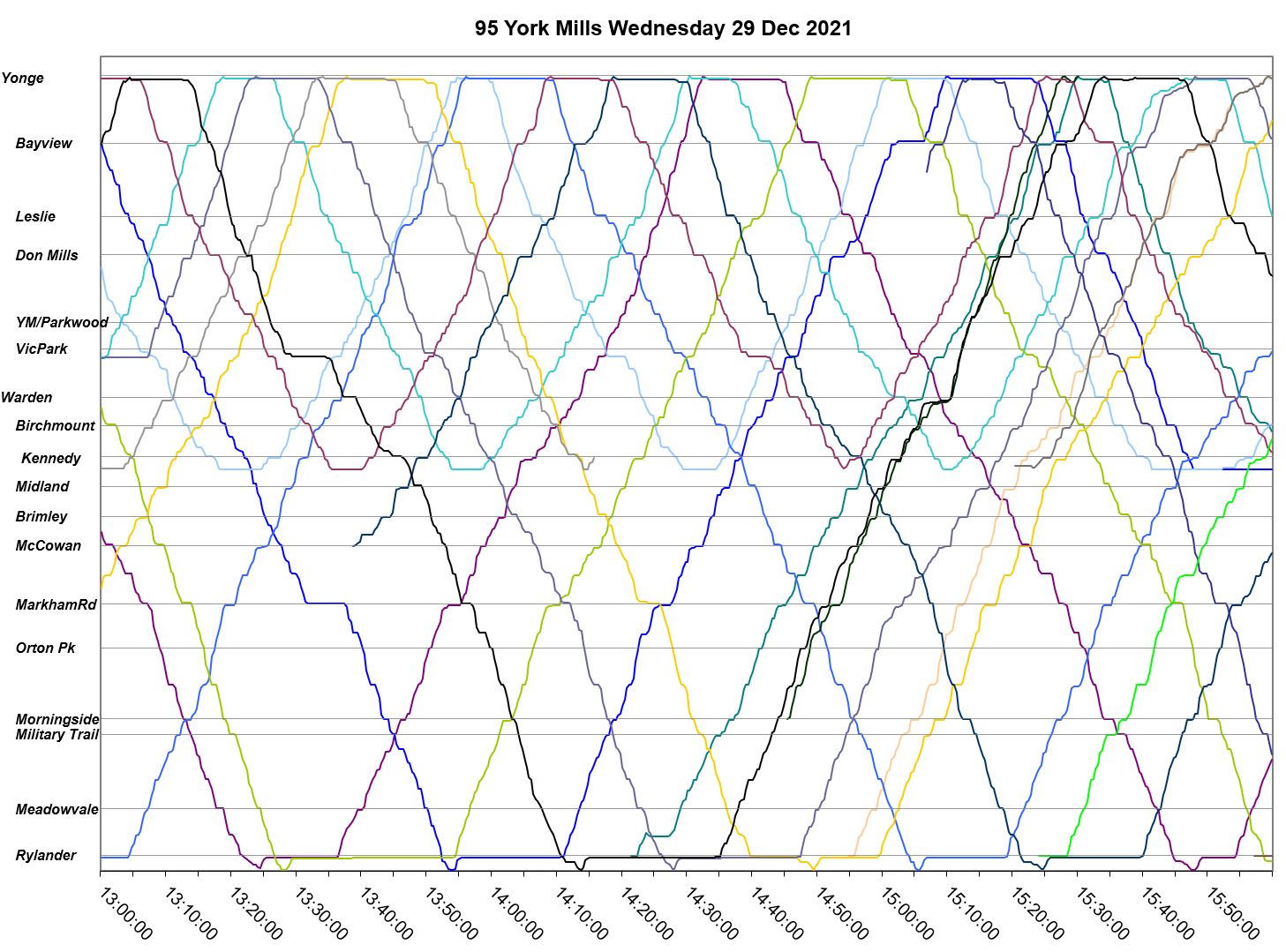 This chart shows the service in the middle of the Christmas holiday week. Bunching is common especially with the 95C Ellesmere Station service and with several runs in the evening on the 95A Port Union and 95B UTSC services.