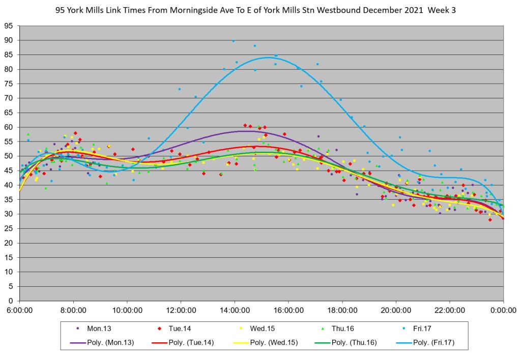 In some of the charts above, there is a noticeable bulge in travel times in December week 3. This was caused by a water main break that required a service diversion on Friday, December 17. The effect on that day is quite evident in the chart below. The diversion was between Kennedy and Warden.