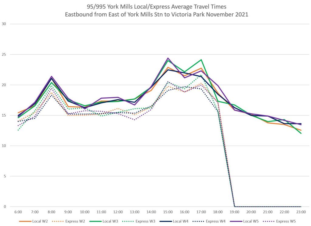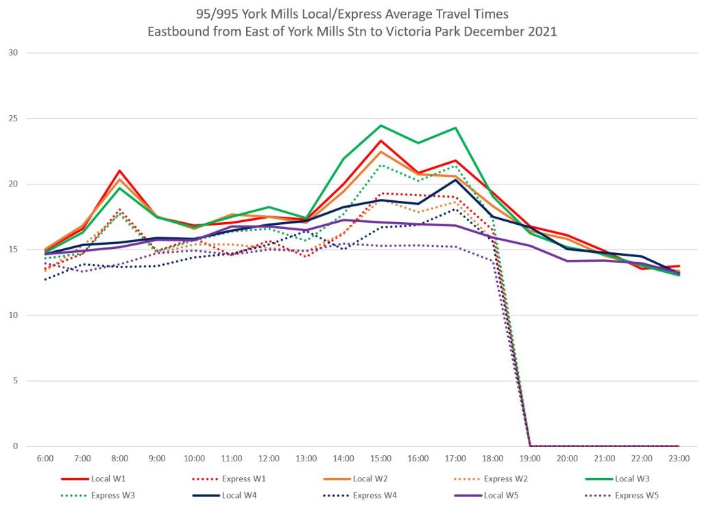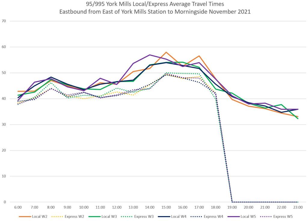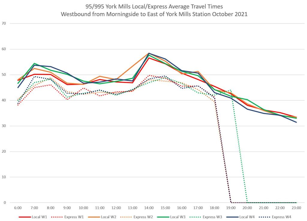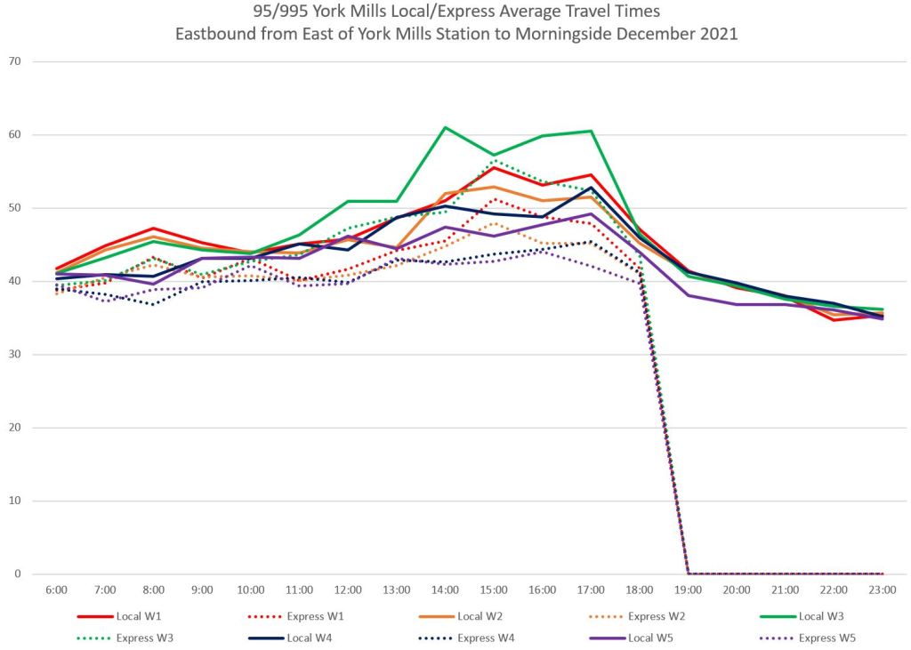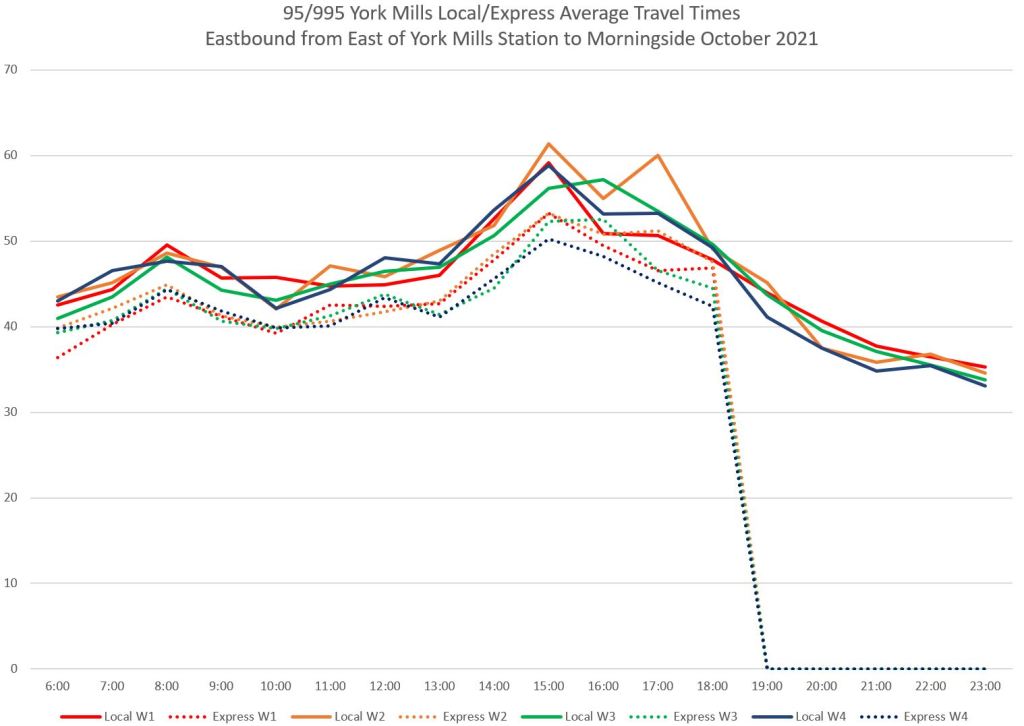 These charts compare the travel times for local and express trips between Morningside and York Mills Station. Morningside is used as the eastern screenline to pick up all of the trips entering the route from UTSC on the evening 95B service.